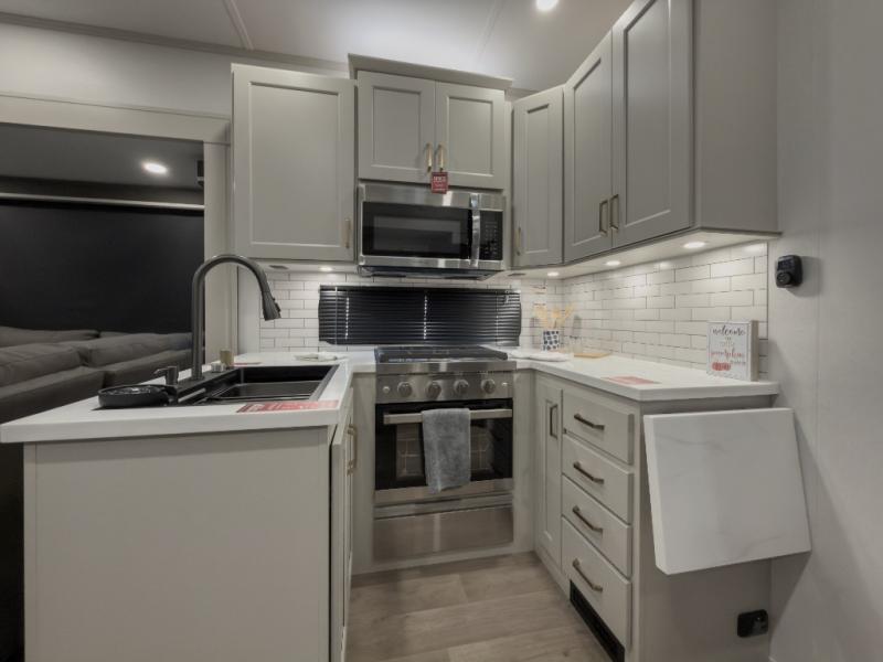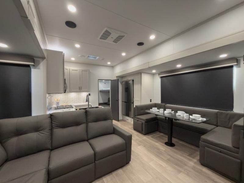 Your whole crew will love camping in this spacious fifth wheel! There is a rear private bunkhouse with a tri-fold sofa and fold-down bunk within a slide, plus a second bunk, storage space, and even a half bath with one of the dual entry doors to the unit for added convenience! You'll find your own space in the front private bedroom, complete with a queen bed slide out, a pass-thru clothes hamper that goes directly into the full bath, plus washer and dryer prep if you choose to add these appliances. A U-shaped kitchen includes ample counter space, a spice rack above the microwave, plus a flip-up countertop extension for even more prep space. There is also a U-shaped dinette where you can all dine around, plus an L-shaped sofa with recline at the end for relaxing space. And you're sure to appreciate the entertainment wall with an LED smart TV, fireplace and smart storage!