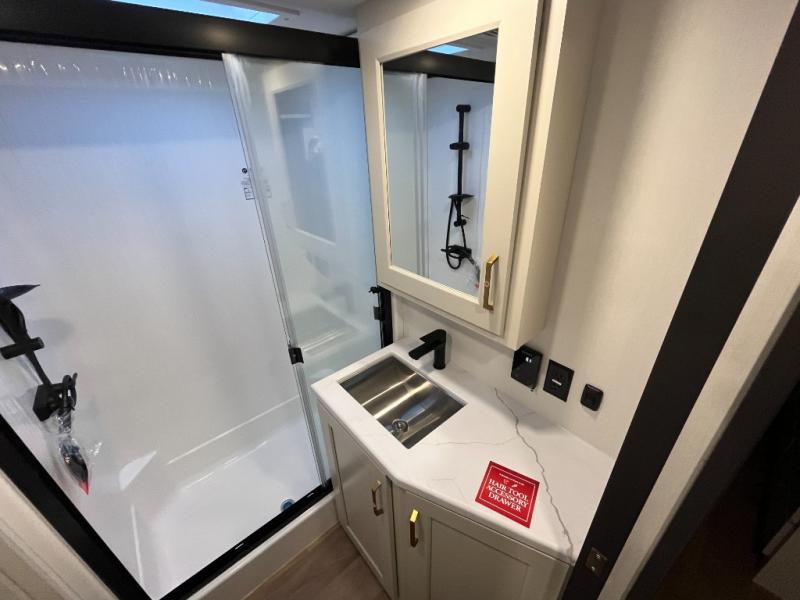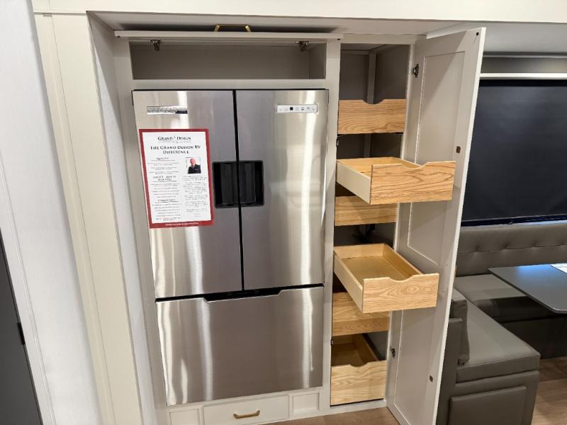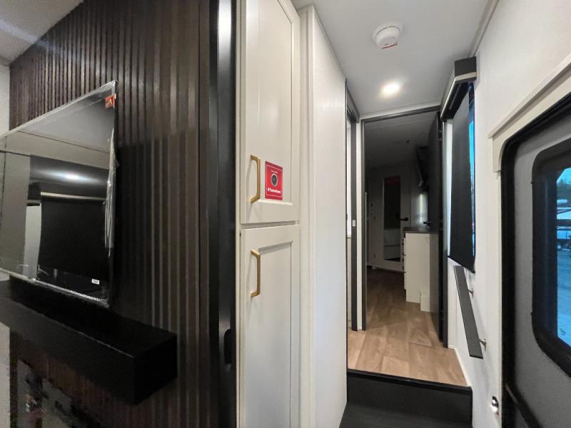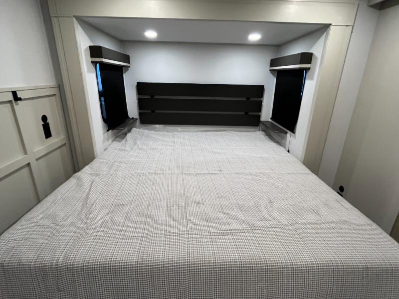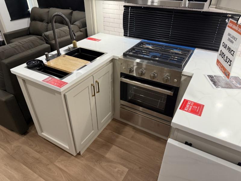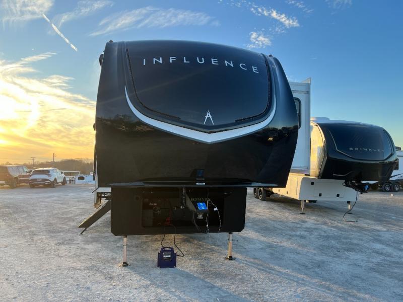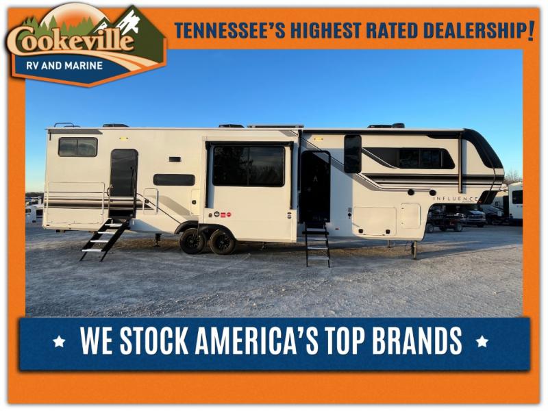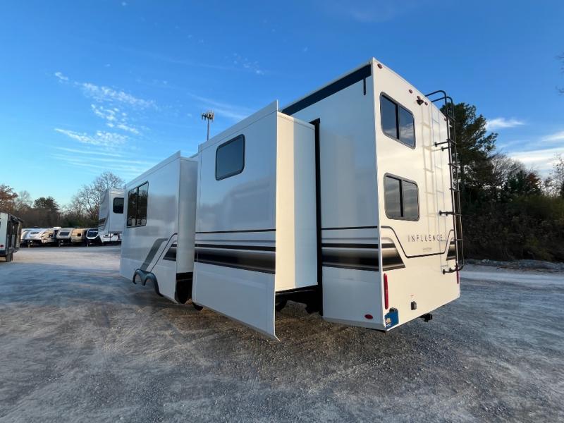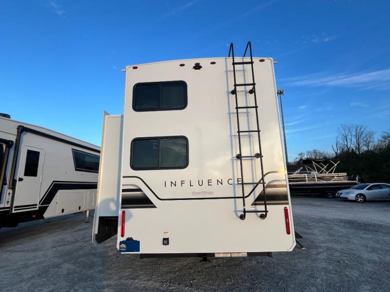 Any Grand Design Influence fifth wheel features five-sided aluminum cage construction with a walk-on roof and a fully enclosed underbelly with heated tanks and storage for all weather camping. For peace of mind, the MORryde CRE3000 Suspension system will provide safe and smooth towing, and the 101" widebody construction offers all the room you need and that is before multiple slides are fully engaged. You will appreciate the Keyed-Alike locks, slam-latch baggage doors with magnetic door catches, exterior security light, and SolidStep entry steps. On the inside, Congoleum flooring, premium roller shades for privacy, a hallway handrail for safety, and nightstands with USB ports to keep all of your electronics fully charged. You will also love the on demand tankless water heater when showering, plus the added heat and ambiance from an electric fireplace, and so much more!