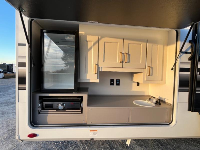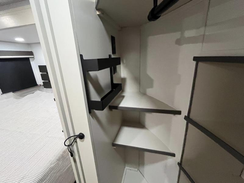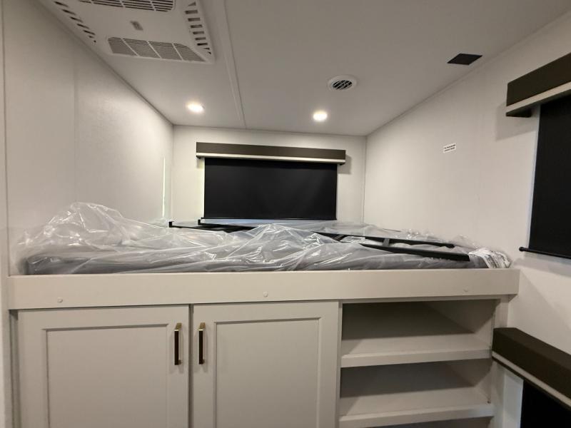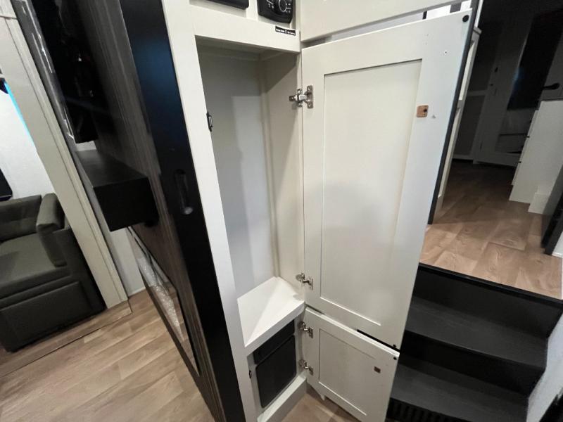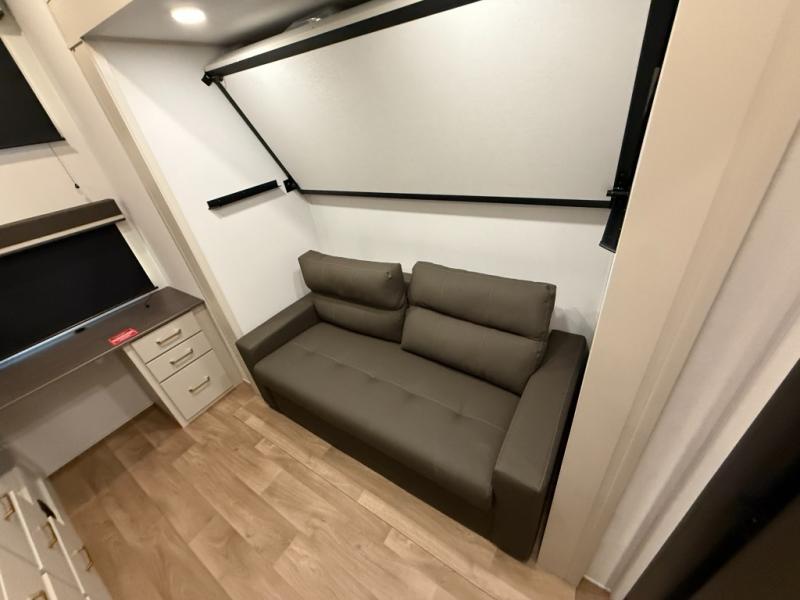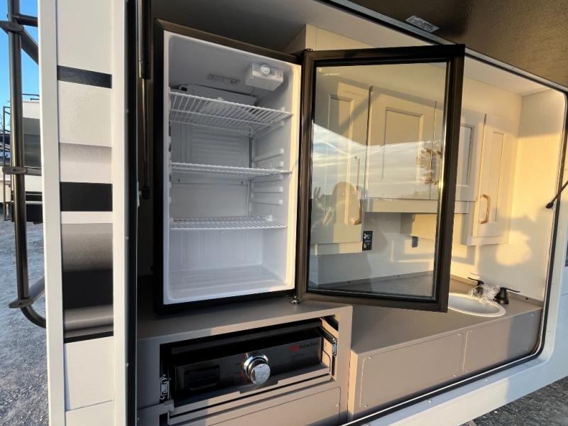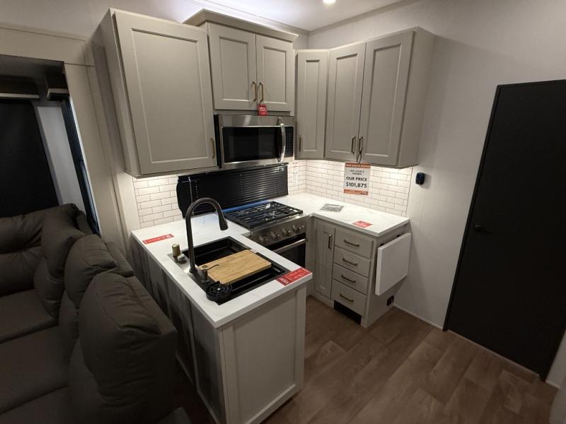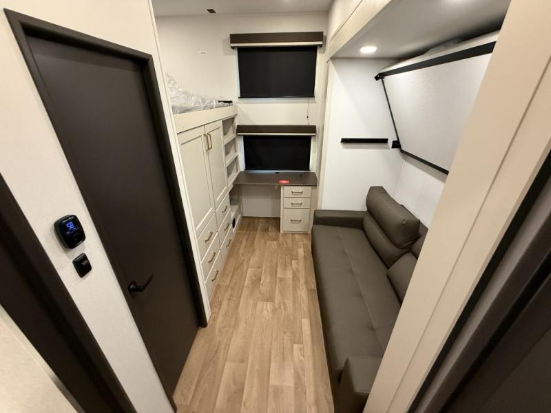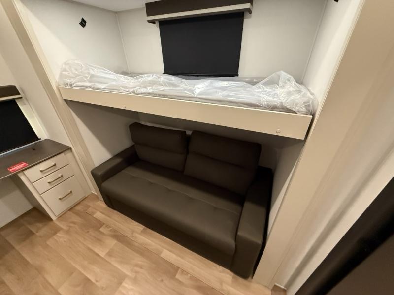 Your whole crew will love camping in this spacious fifth wheel! There is a rear private bunkhouse with a tri-fold sofa and fold-down bunk within a slide, plus a second bunk, storage space, and even a half bath with one of the dual entry doors to the unit for added convenience! You'll find your own space in the front private bedroom, complete with a queen bed slide out, a pass-thru clothes hamper that goes directly into the full bath, plus washer and dryer prep if you choose to add these appliances. A U-shaped kitchen includes ample counter space, a spice rack above the microwave, plus a flip-up countertop extension for even more prep space. There is also a U-shaped dinette where you can all dine around, plus an L-shaped sofa with recline at the end for relaxing space. And you're sure to appreciate the entertainment wall with an LED smart TV, fireplace and smart storage!