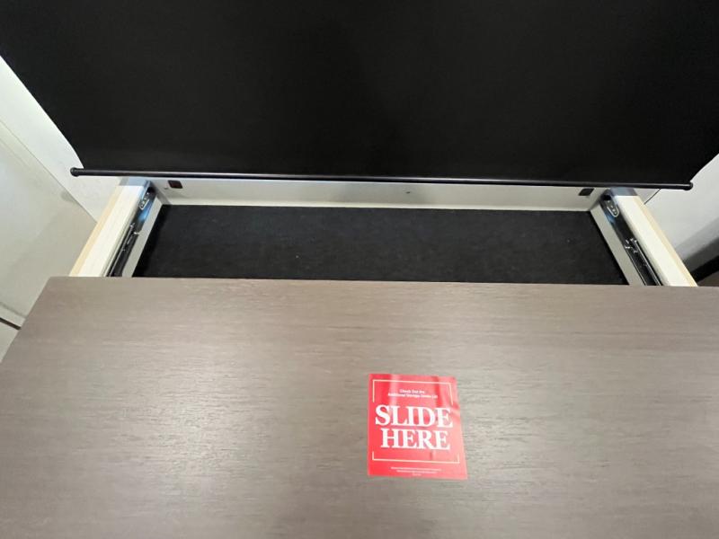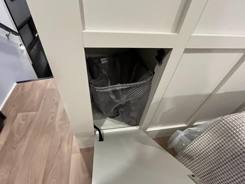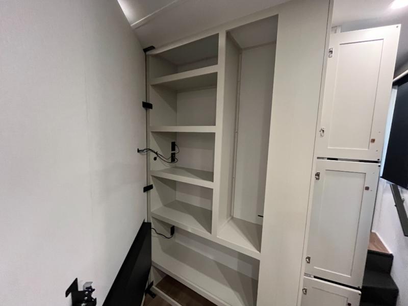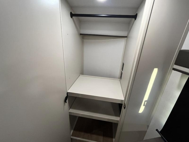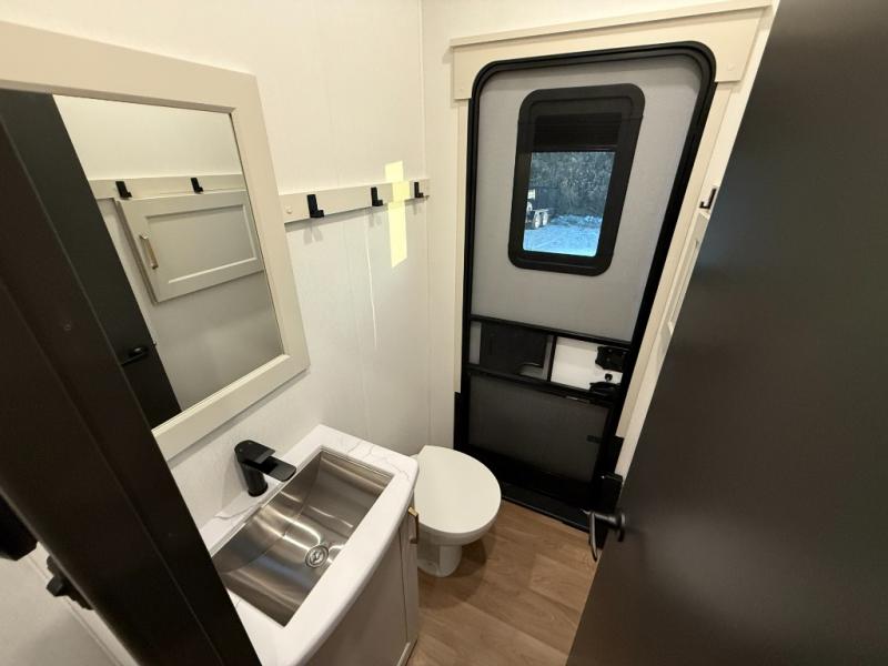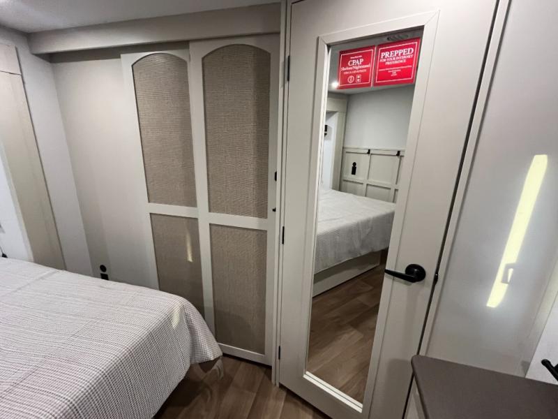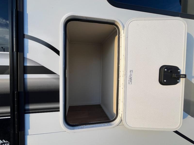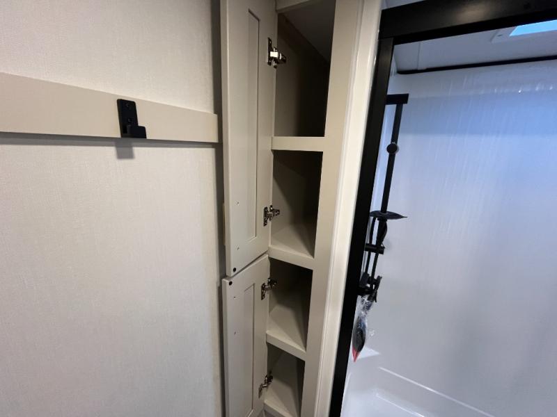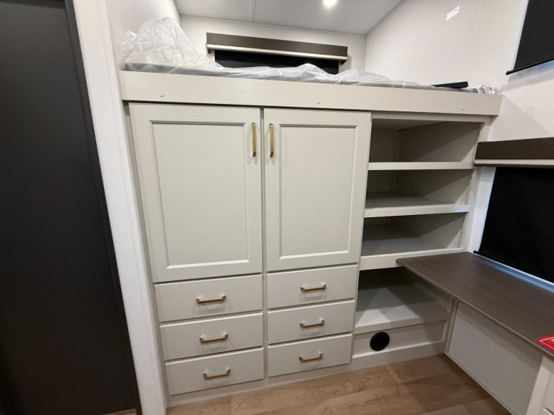 Your whole crew will love camping in this spacious fifth wheel! There is a rear private bunkhouse with a tri-fold sofa and fold-down bunk within a slide, plus a second bunk, storage space, and even a half bath with one of the dual entry doors to the unit for added convenience! You'll find your own space in the front private bedroom, complete with a queen bed slide out, a pass-thru clothes hamper that goes directly into the full bath, plus washer and dryer prep if you choose to add these appliances. A U-shaped kitchen includes ample counter space, a spice rack above the microwave, plus a flip-up countertop extension for even more prep space. There is also a U-shaped dinette where you can all dine around, plus an L-shaped sofa with recline at the end for relaxing space. And you're sure to appreciate the entertainment wall with an LED smart TV, fireplace and smart storage!