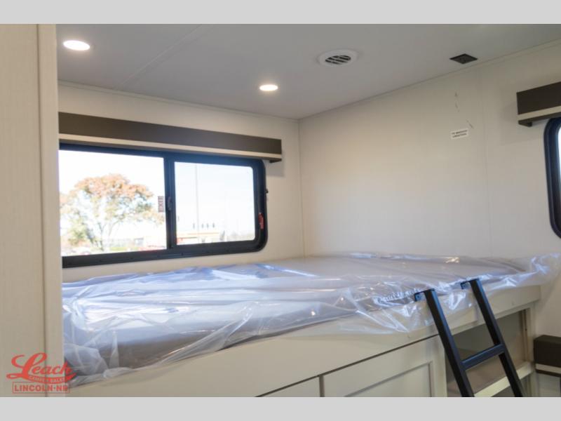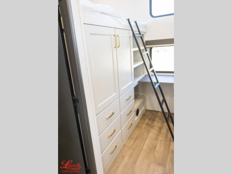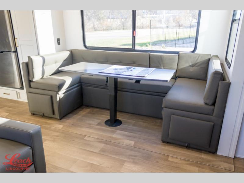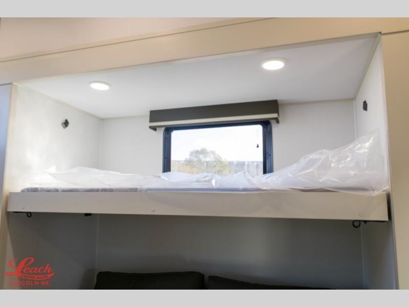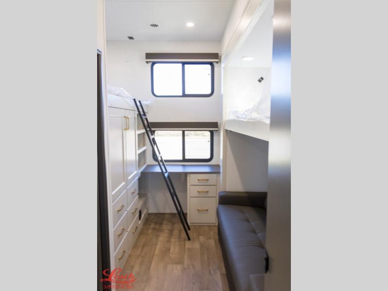 Your whole crew will love camping in this spacious fifth wheel! There is a rear private bunkhouse with a tri-fold sofa and fold-down bunk within a slide, plus a second bunk, storage space, and even a half bath with one of the dual entry doors to the unit for added convenience! You'll find your own space in the front private bedroom, complete with a queen bed slide out, a pass-thru clothes hamper that goes directly into the full bath, plus washer and dryer prep if you choose to add these appliances. A U-shaped kitchen includes ample counter space, a spice rack above the microwave, plus a flip-up countertop extension for even more prep space. There is also a U-shaped dinette where you can all dine around, plus an L-shaped sofa with recline at the end for relaxing space. And you're sure to appreciate the entertainment wall with an LED smart TV, fireplace and smart storage!