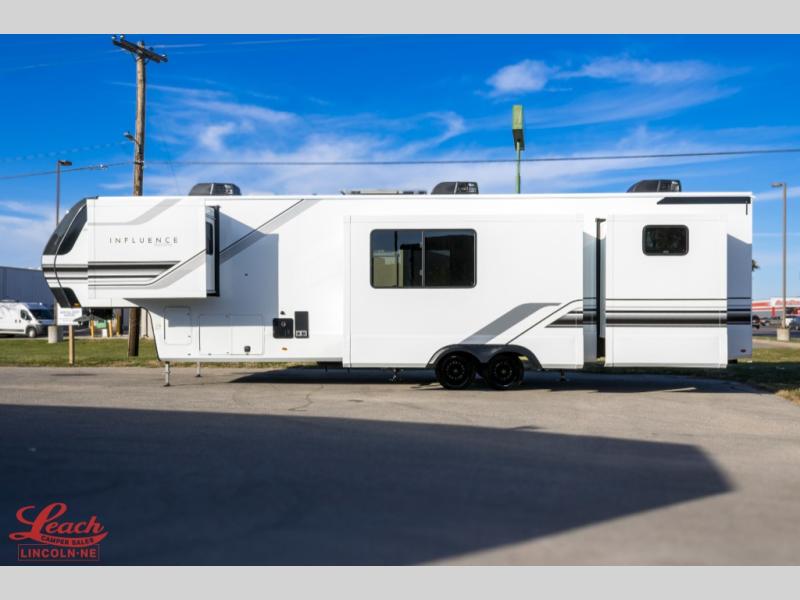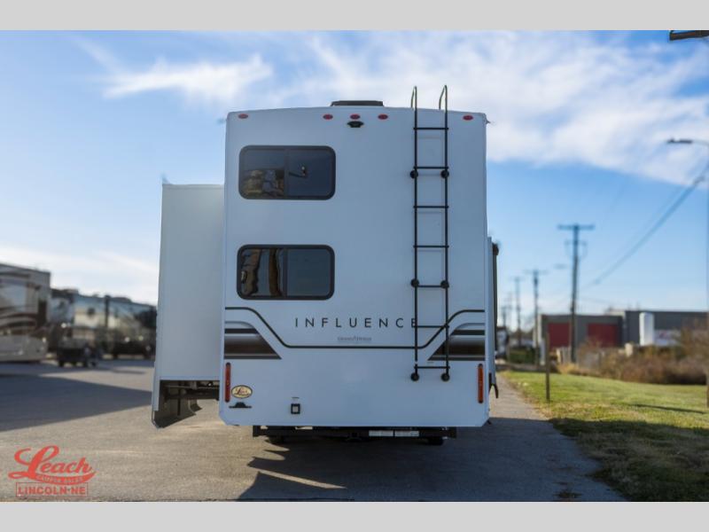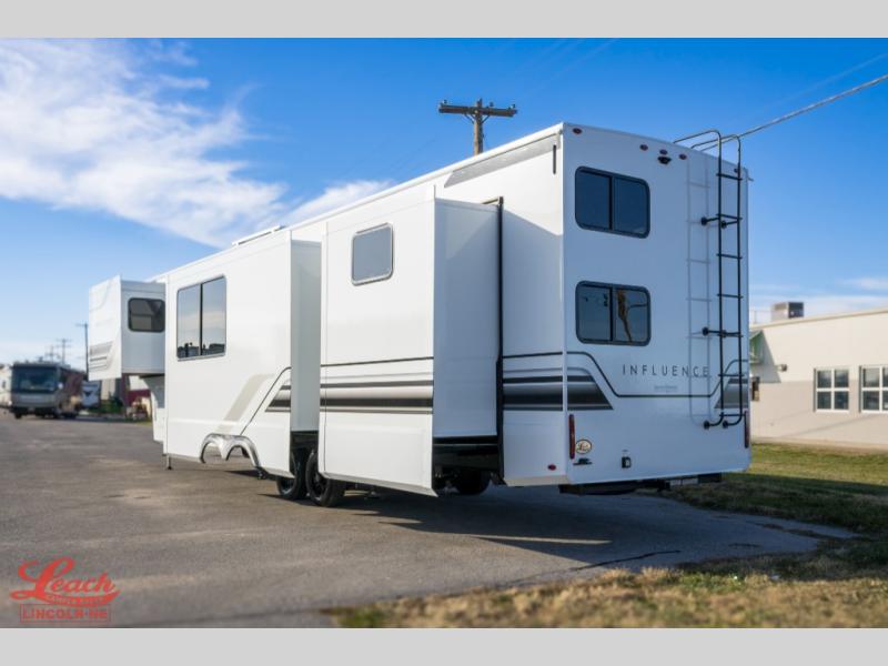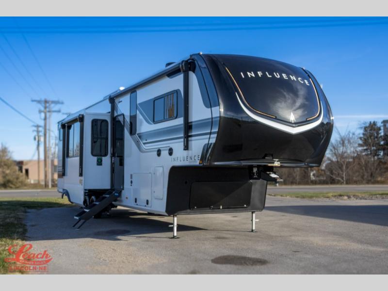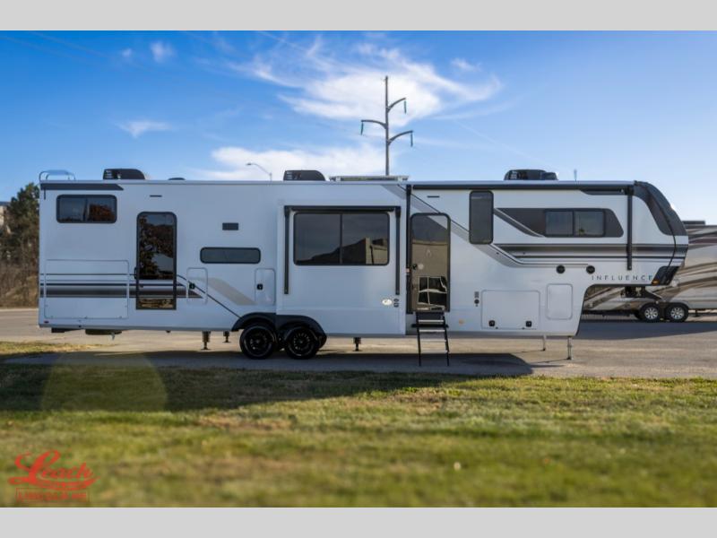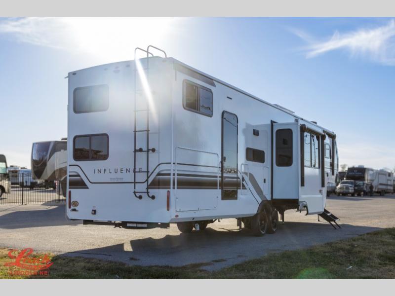 Any Grand Design Influence fifth wheel features five-sided aluminum cage construction with a walk-on roof and a fully enclosed underbelly with heated tanks and storage for all weather camping. For peace of mind, the MORryde CRE3000 Suspension system will provide safe and smooth towing, and the 101" widebody construction offers all the room you need and that is before multiple slides are fully engaged. You will appreciate the Keyed-Alike locks, slam-latch baggage doors with magnetic door catches, exterior security light, and SolidStep entry steps. On the inside, Congoleum flooring, premium roller shades for privacy, a hallway handrail for safety, and nightstands with USB ports to keep all of your electronics fully charged. You will also love the on demand tankless water heater when showering, plus the added heat and ambiance from an electric fireplace, and so much more!