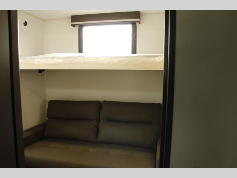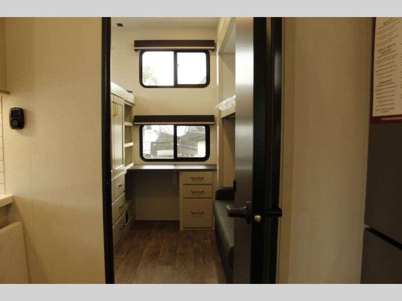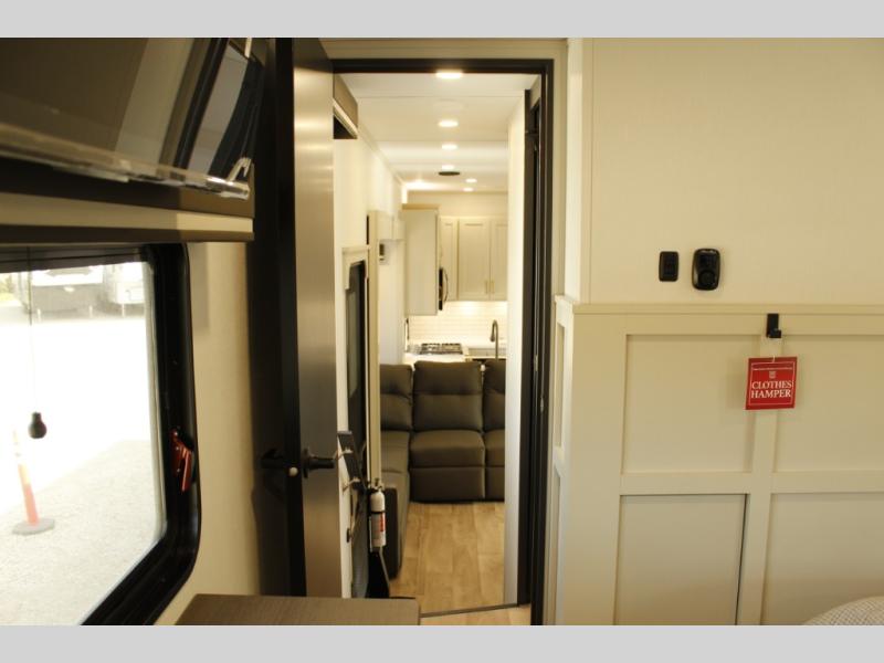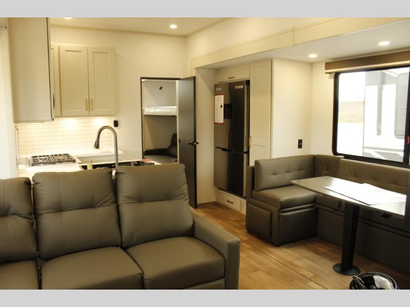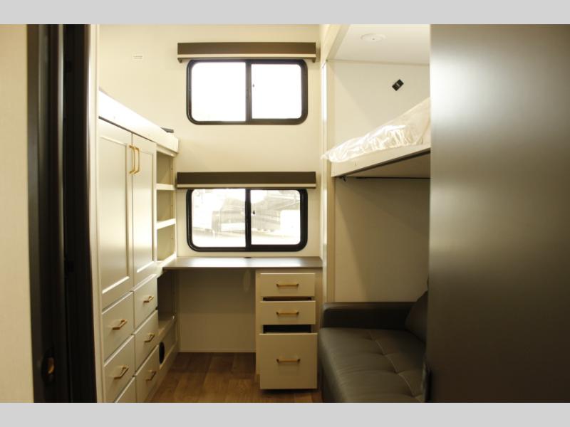 Your whole crew will love camping in this spacious fifth wheel! There is a rear private bunkhouse with a tri-fold sofa and fold-down bunk within a slide, plus a second bunk, storage space, and even a half bath with one of the dual entry doors to the unit for added convenience! You'll find your own space in the front private bedroom, complete with a queen bed slide out, a pass-thru clothes hamper that goes directly into the full bath, plus washer and dryer prep if you choose to add these appliances. A U-shaped kitchen includes ample counter space, a spice rack above the microwave, plus a flip-up countertop extension for even more prep space. There is also a U-shaped dinette where you can all dine around, plus an L-shaped sofa with recline at the end for relaxing space. And you're sure to appreciate the entertainment wall with an LED smart TV, fireplace and smart storage!