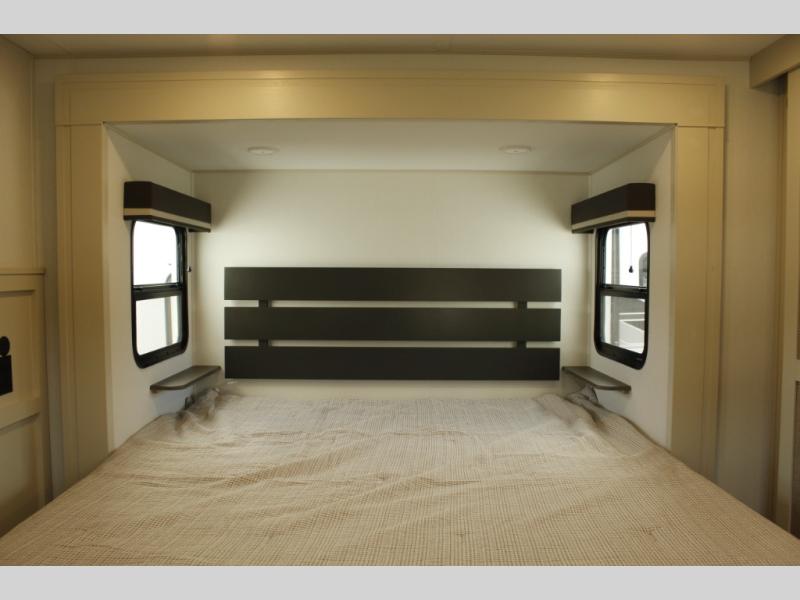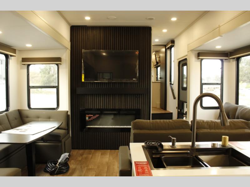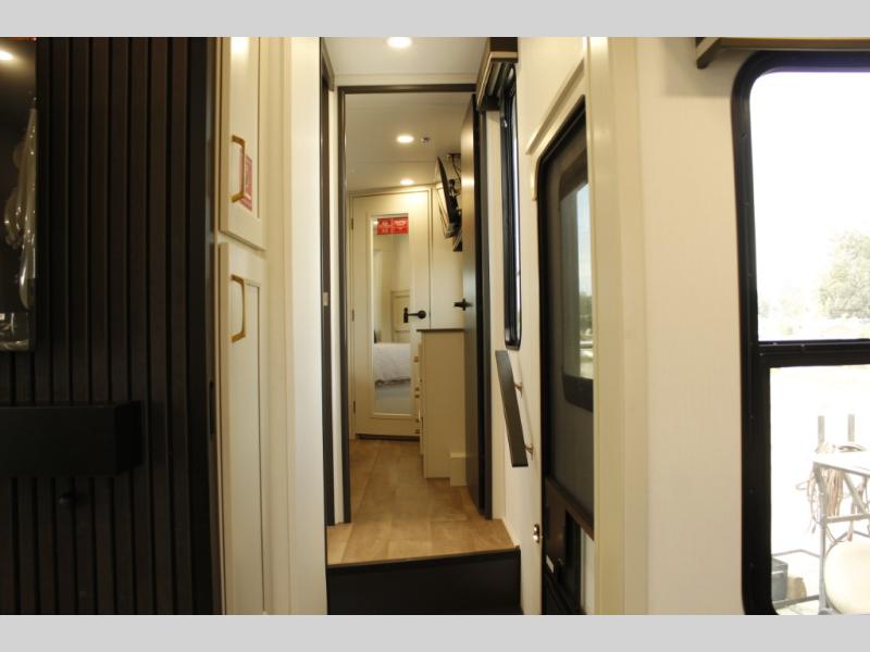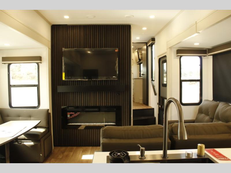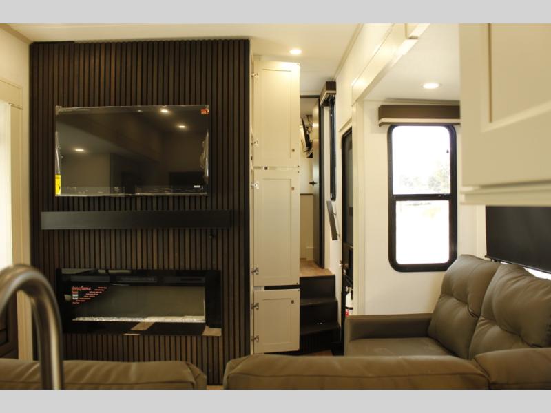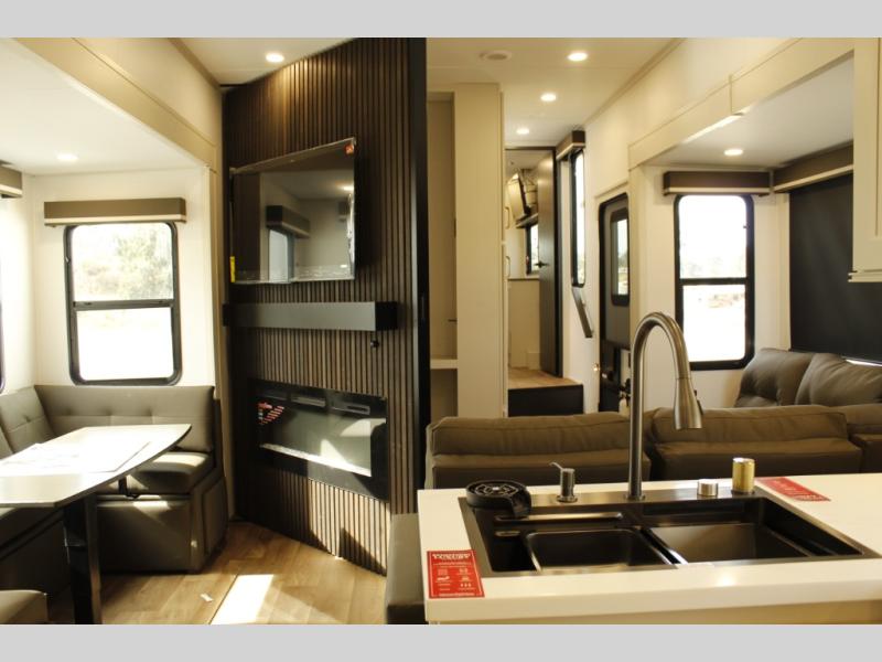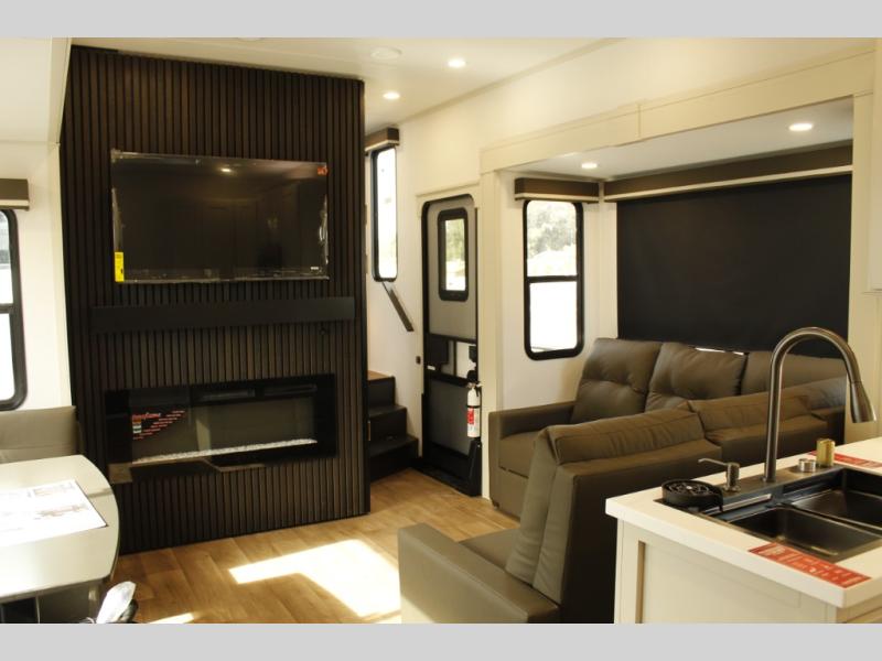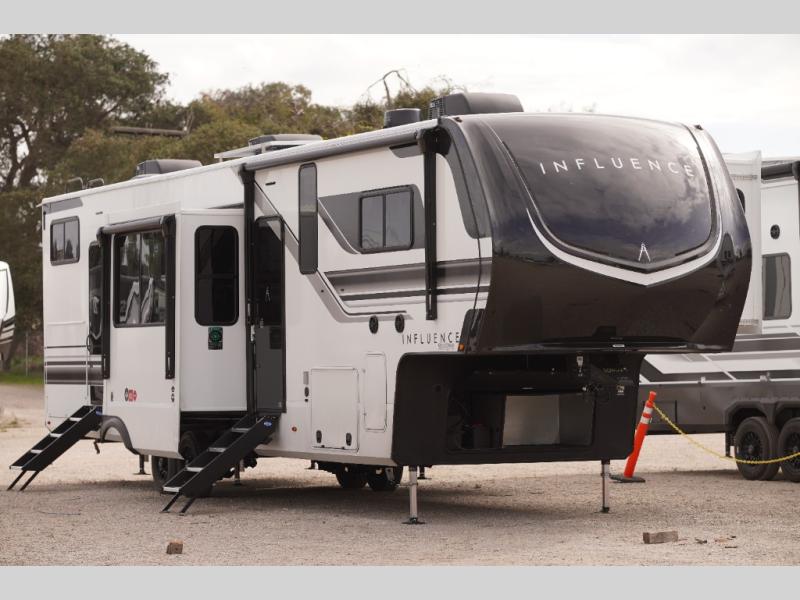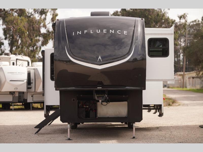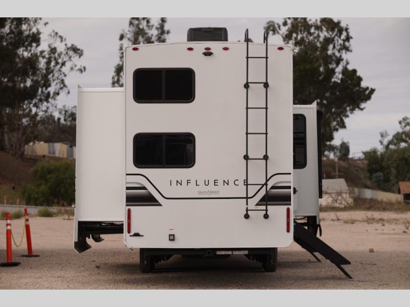 Any Grand Design Influence fifth wheel features five-sided aluminum cage construction with a walk-on roof and a fully enclosed underbelly with heated tanks and storage for all weather camping. For peace of mind, the MORryde CRE3000 Suspension system will provide safe and smooth towing, and the 101" widebody construction offers all the room you need and that is before multiple slides are fully engaged. You will appreciate the Keyed-Alike locks, slam-latch baggage doors with magnetic door catches, exterior security light, and SolidStep entry steps. On the inside, Congoleum flooring, premium roller shades for privacy, a hallway handrail for safety, and nightstands with USB ports to keep all of your electronics fully charged. You will also love the on demand tankless water heater when showering, plus the added heat and ambiance from an electric fireplace, and so much more!