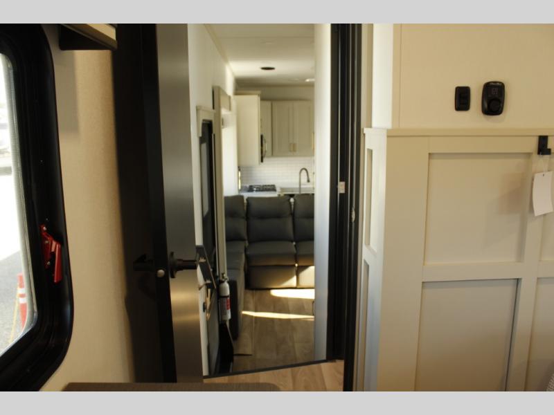 Your whole crew will love camping in this spacious fifth wheel! There is a rear private bunkhouse with a tri-fold sofa and fold-down bunk within a slide, plus a second bunk, storage space, and even a half bath with one of the dual entry doors to the unit for added convenience! You'll find your own space in the front private bedroom, complete with a queen bed slide out, a pass-thru clothes hamper that goes directly into the full bath, plus washer and dryer prep if you choose to add these appliances. A U-shaped kitchen includes ample counter space, a spice rack above the microwave, plus a flip-up countertop extension for even more prep space. There is also a U-shaped dinette where you can all dine around, plus an L-shaped sofa with recline at the end for relaxing space. And you're sure to appreciate the entertainment wall with an LED smart TV, fireplace and smart storage!