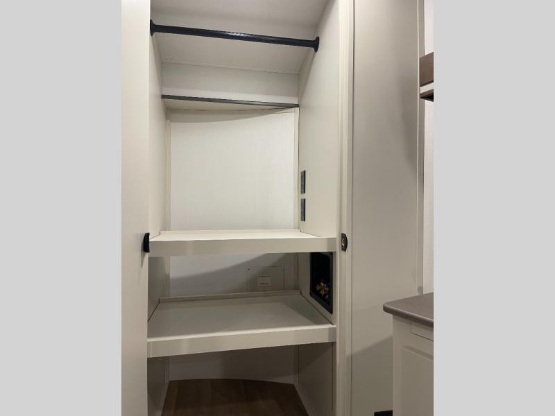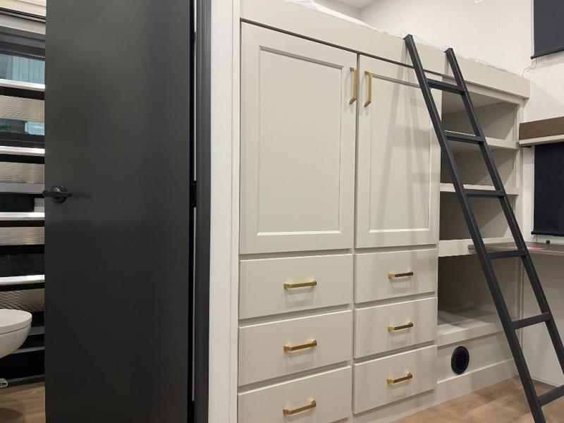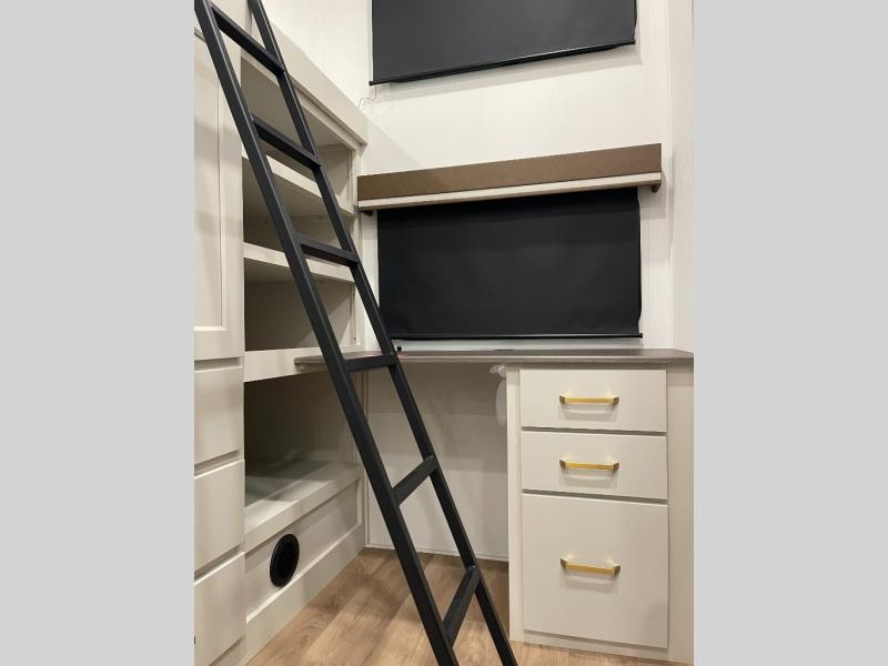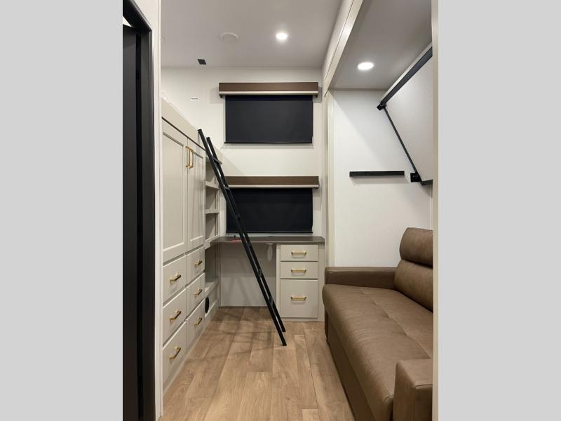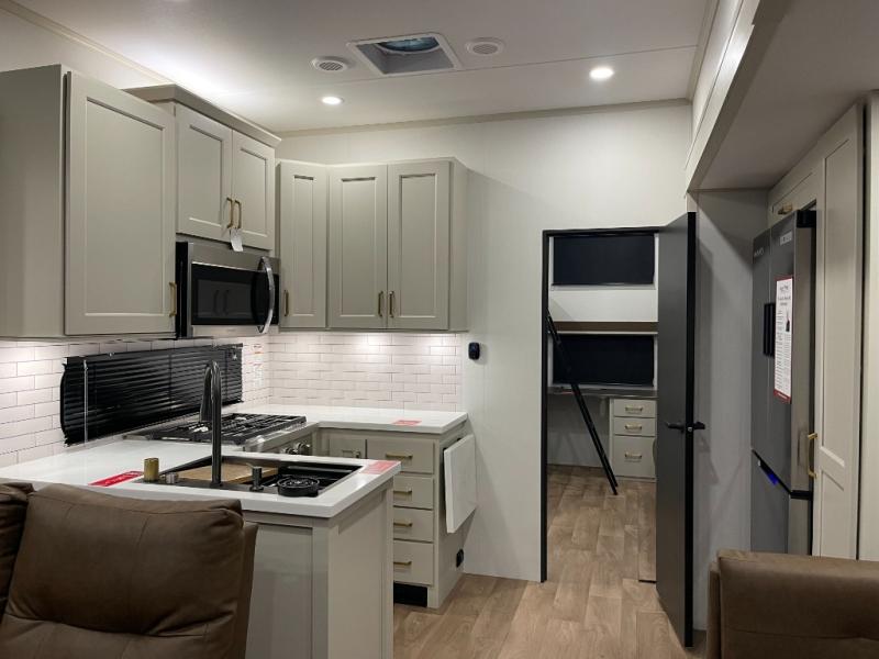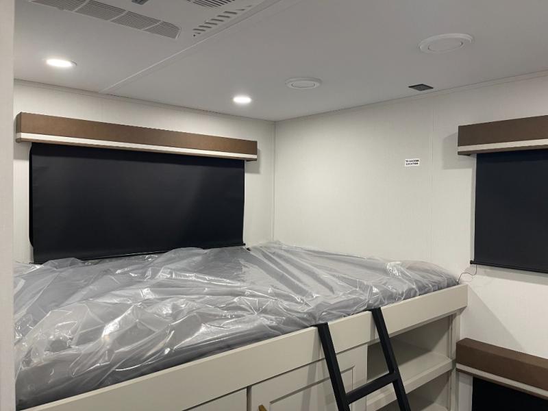 Your whole crew will love camping in this spacious fifth wheel! There is a rear private bunkhouse with a tri-fold sofa and fold-down bunk within a slide, plus a second bunk, storage space, and even a half bath with one of the dual entry doors to the unit for added convenience! You'll find your own space in the front private bedroom, complete with a queen bed slide out, a pass-thru clothes hamper that goes directly into the full bath, plus washer and dryer prep if you choose to add these appliances. A U-shaped kitchen includes ample counter space, a spice rack above the microwave, plus a flip-up countertop extension for even more prep space. There is also a U-shaped dinette where you can all dine around, plus an L-shaped sofa with recline at the end for relaxing space. And you're sure to appreciate the entertainment wall with an LED smart TV, fireplace and smart storage!