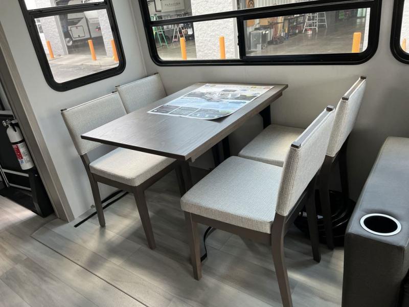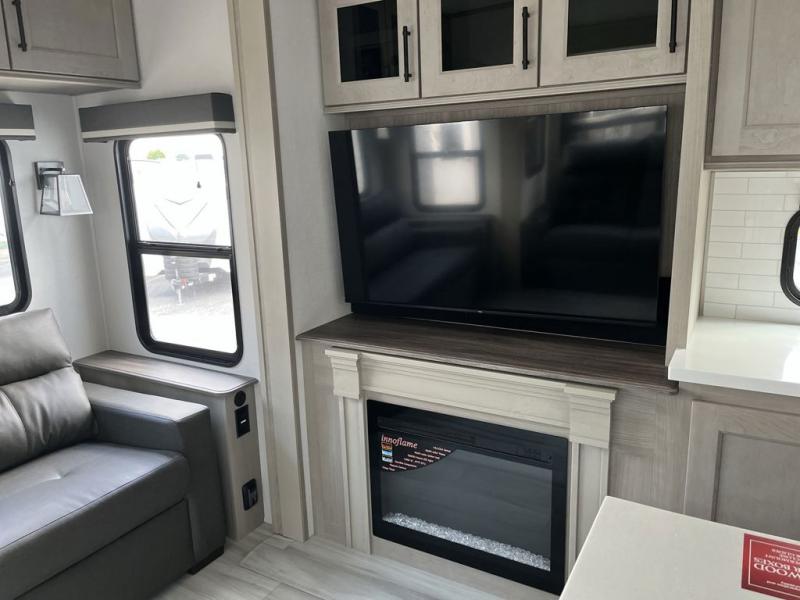 A perfect fifth wheel featuring triple slides and a tri-fold sofa for overnight guests! You will love the spacious interior thanks to the dual opposing slides in the main living and kitchen area. Here you will find a kitchen island in the center and plenty of seating with a free standing dinette, theater seating for movie night opposite the fireplace and entertainment center, as well as a tri-fold sofa. The kitchen offers all of the amenities just like home, a 16 cu. ft. 12-volt refrigerator for your perishables, and a hutch with an electronics drawer to keep your gadgets organized. There is even a pet dish under the refrigerator for your furry friends. The spacious full bath includes a 48" x 30" shower, dual linen closets, and an accessory drawer for necessities. You'll love the front bedroom with its queen bed slide out, slide top dresser, front wardrobe with washer and dryer prep, plus a pass-thru clothes hamper between the bedroom and bath; how convenient!