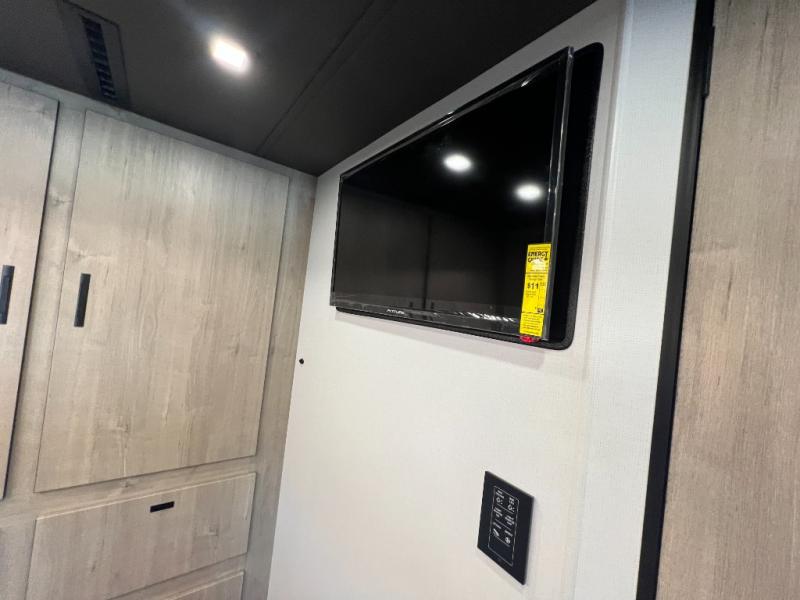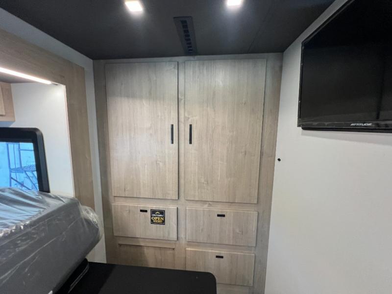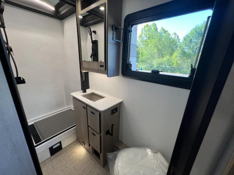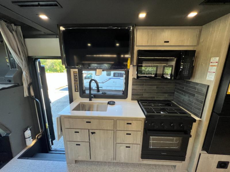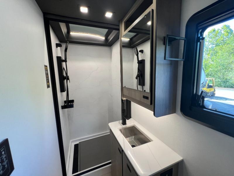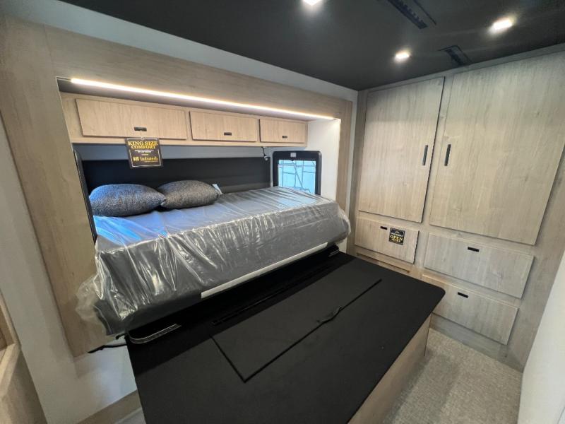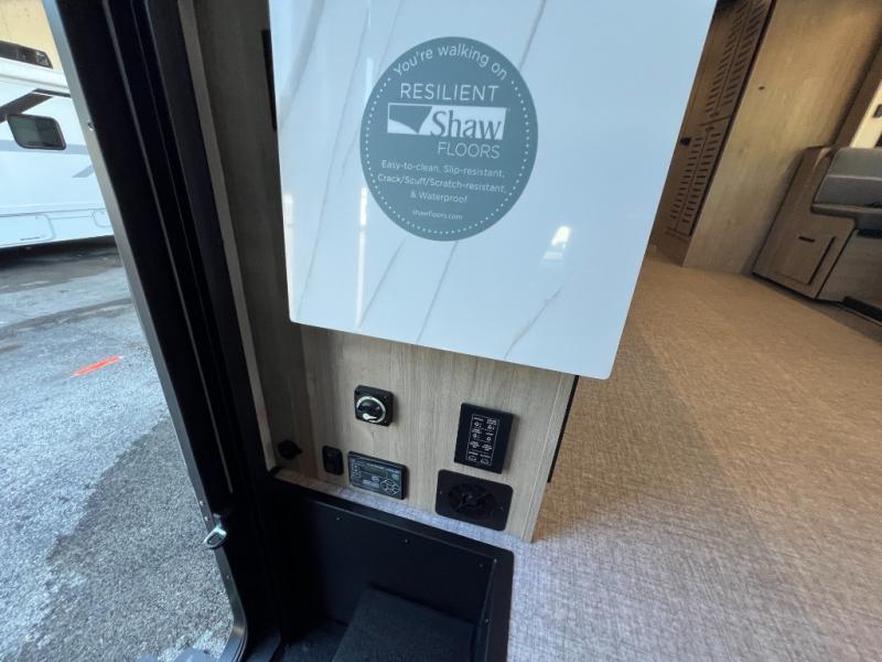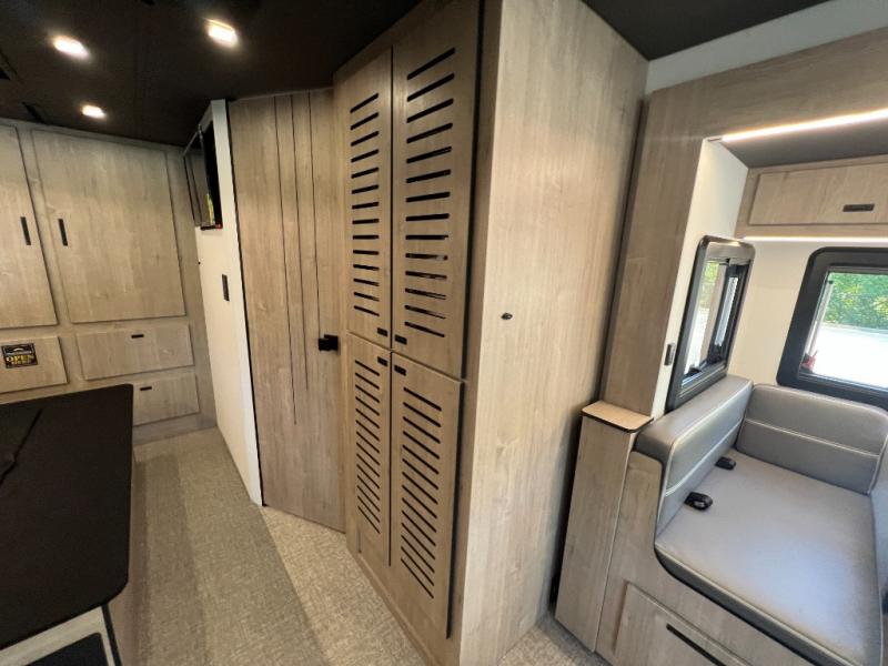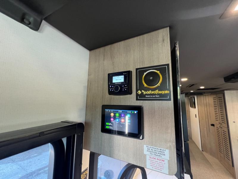 You can be sure to enjoy the journey and the stay in this coach! Once you stop for the day, you can make lunch with the kitchen appliances, then dine at the booth dinette within the large slide out. There is also power theater seating here across from a TV for easy viewing. A 10 cu. ft. 12V refrigerator and pantry will let you keep food stocked, and the closet with washer and dryer prep gives you the option to add these appliances. The 70" x 80" king bed slide is sure to provide a great night's rest, and there is a wardrobe to keep your things tidy. And of course, a full rear corner bath onboard makes staying fresh easier than ever!