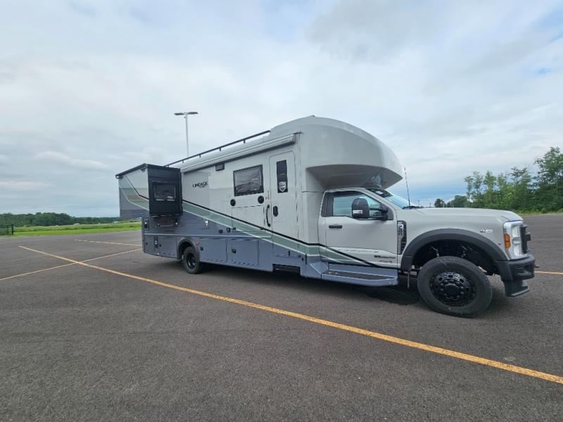 The capable Lineage Series F Super C diesel motorhome by Grand Design is your ticket to adventure! There is a Fox Racing Suspension Package for optimal handling, and you can go off the beaten path with the 6.7L power stroke diesel 4x4 chassis. This coach sits on the Ford F-600 super duty platform, and features a MorRyde tubular steel frame for added strength and durability. You'll find many at-home comforts inside, including comfortable seating and sleeping spaces, full bath and kitchen amenities, and plenty of storage for your personal belongings and camp gear!