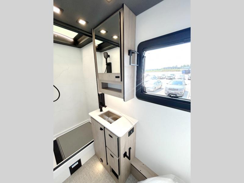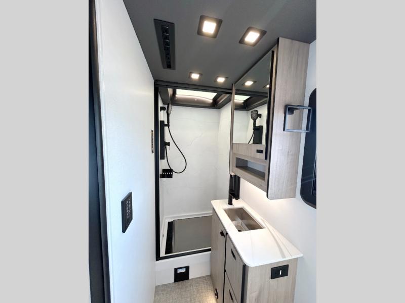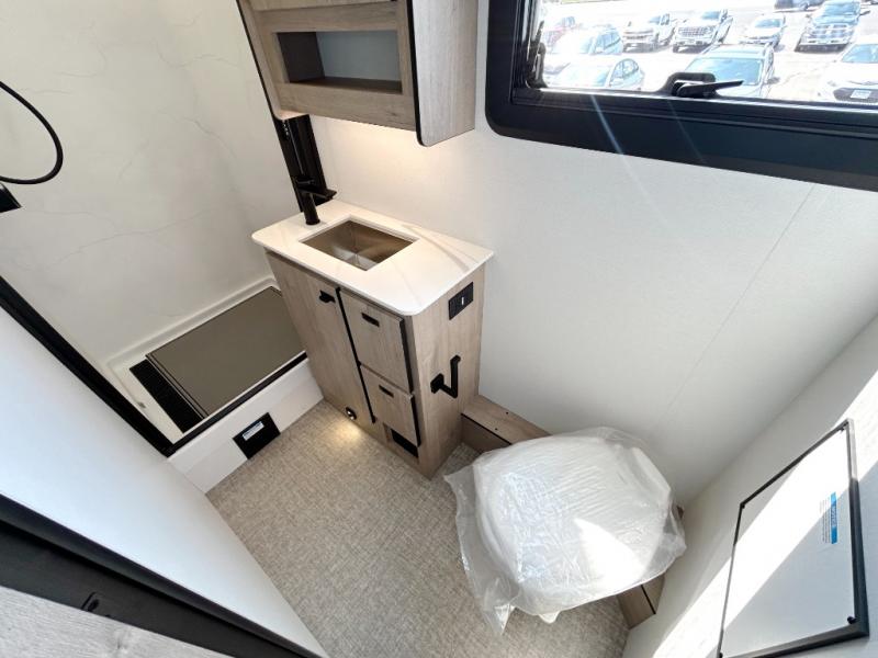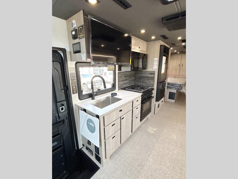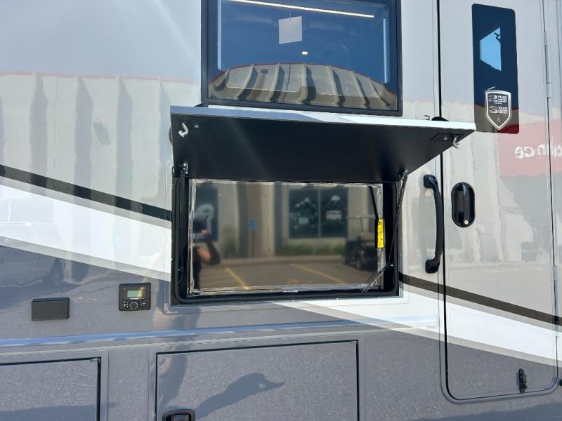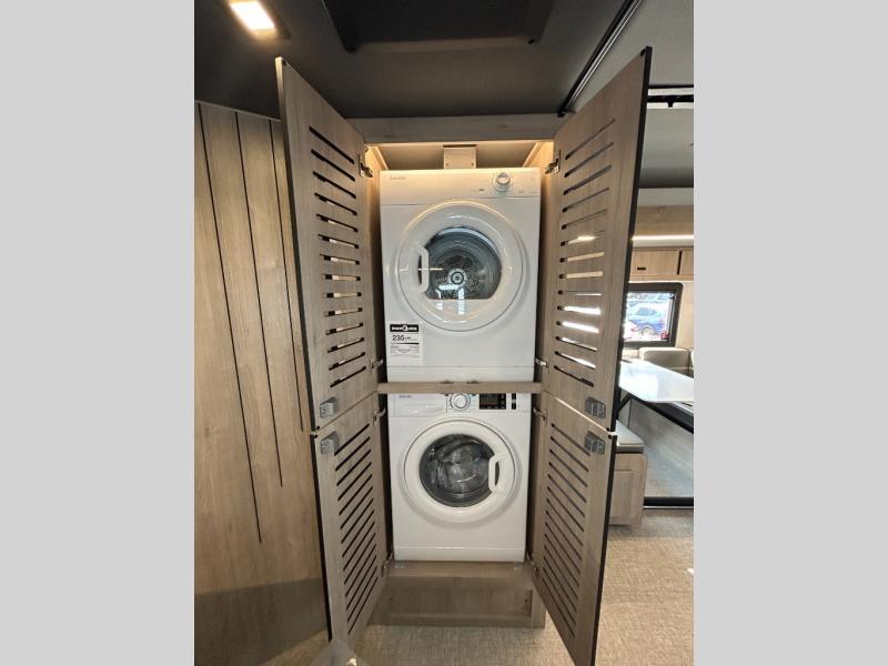 You can be sure to enjoy the journey and the stay in this coach! Once you stop for the day, you can make lunch with the kitchen appliances, then dine at the booth dinette within the large slide out. There is also power theater seating here across from a TV for easy viewing. A 10 cu. ft. 12V refrigerator and pantry will let you keep food stocked, and the closet with washer and dryer prep gives you the option to add these appliances. The 70" x 80" king bed slide is sure to provide a great night's rest, and there is a wardrobe to keep your things tidy. And of course, a full rear corner bath onboard makes staying fresh easier than ever!