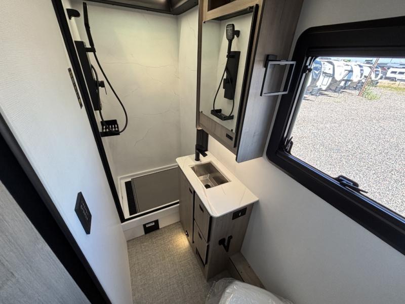 You can be sure to enjoy the journey and the stay in this coach! Once you stop for the day, you can make lunch with the kitchen appliances, then dine at the booth dinette within the large slide out. There is also power theater seating here across from a TV for easy viewing. A 10 cu. ft. 12V refrigerator and pantry will let you keep food stocked, and the closet with washer and dryer prep gives you the option to add these appliances. The 70" x 80" king bed slide is sure to provide a great night's rest, and there is a wardrobe to keep your things tidy. And of course, a full rear corner bath onboard makes staying fresh easier than ever!