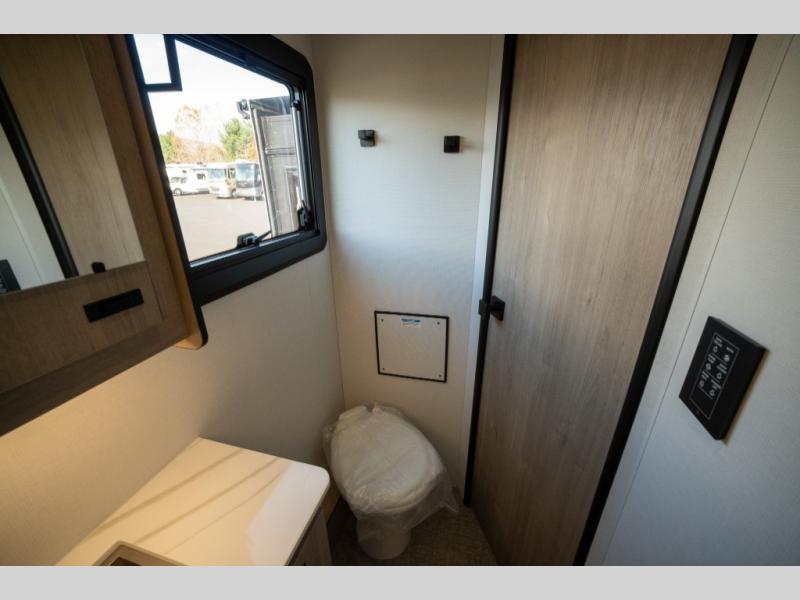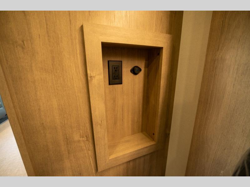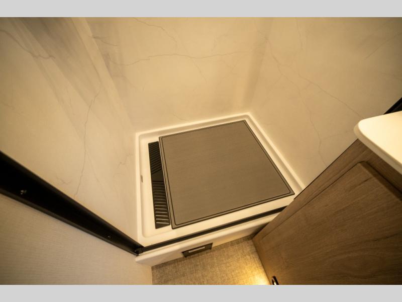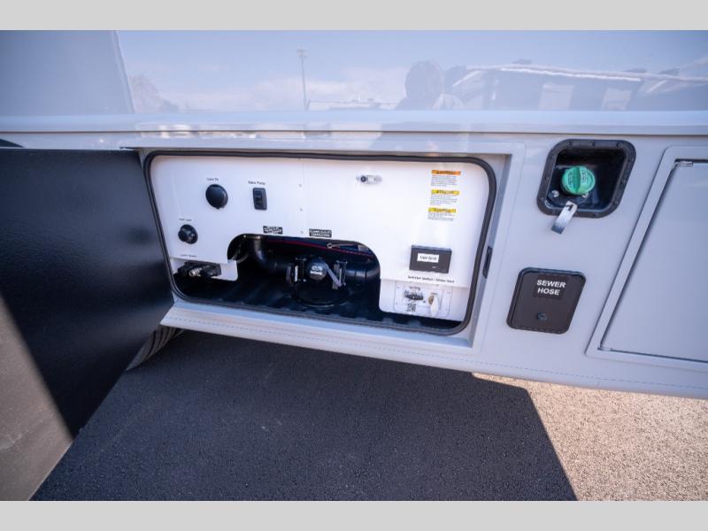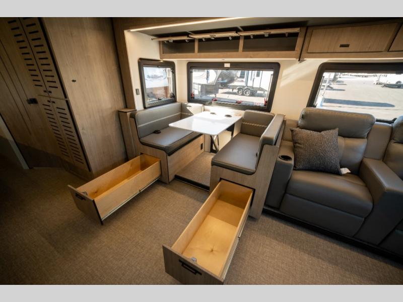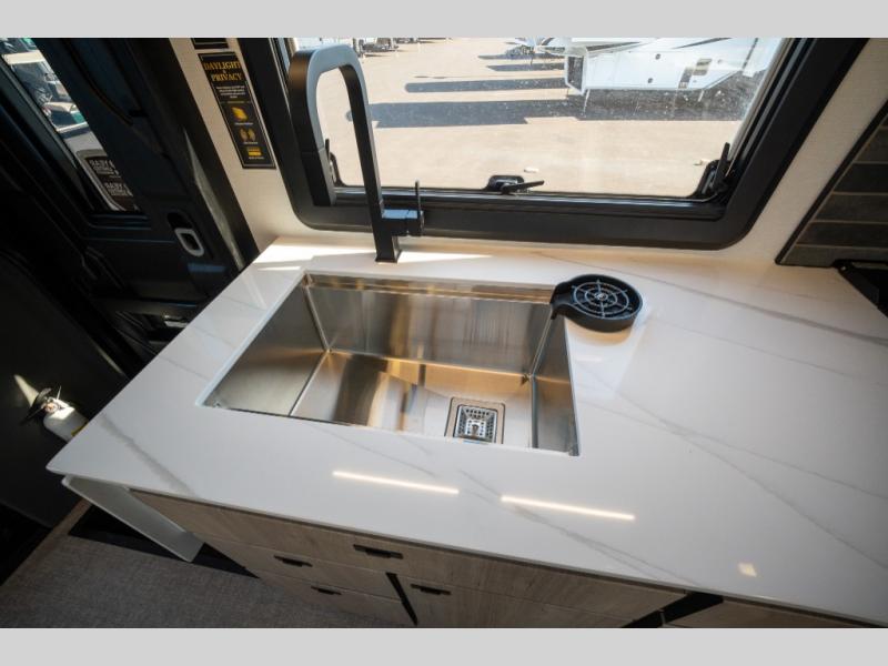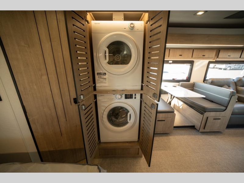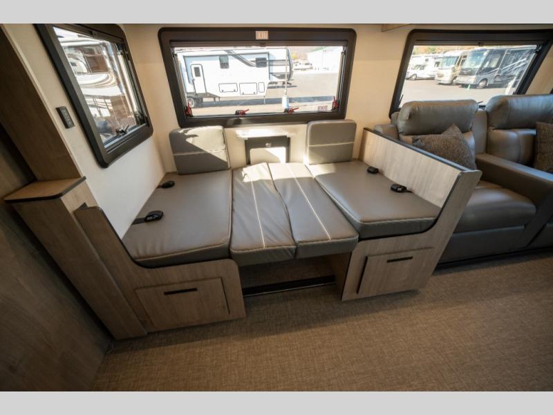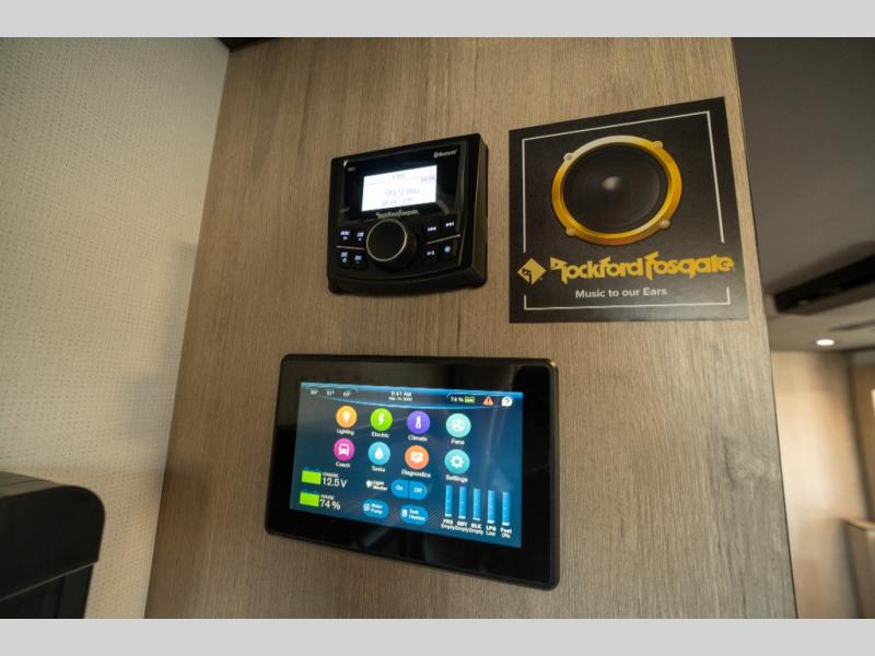 You can be sure to enjoy the journey and the stay in this coach! Once you stop for the day, you can make lunch with the kitchen appliances, then dine at the booth dinette within the large slide out. There is also power theater seating here across from a TV for easy viewing. A 10 cu. ft. 12V refrigerator and pantry will let you keep food stocked, and the closet with washer and dryer prep gives you the option to add these appliances. The 70" x 80" king bed slide is sure to provide a great night's rest, and there is a wardrobe to keep your things tidy. And of course, a full rear corner bath onboard makes staying fresh easier than ever!
