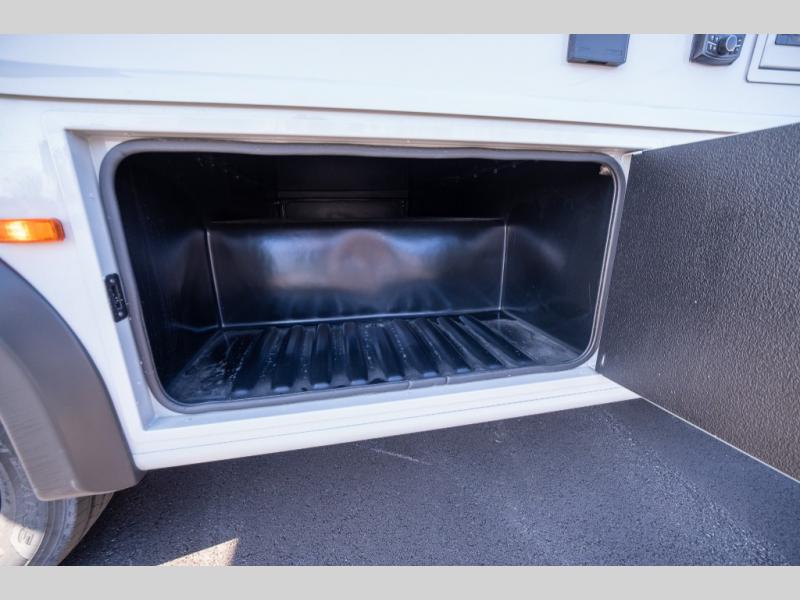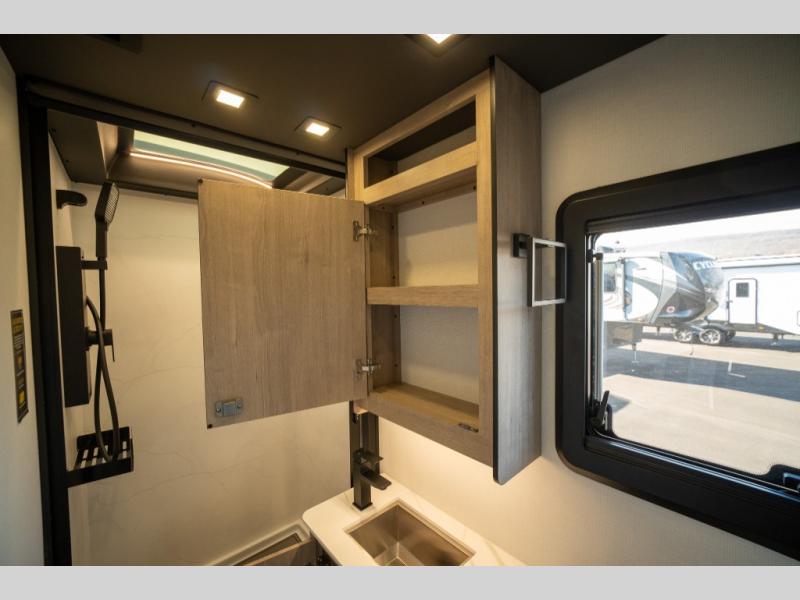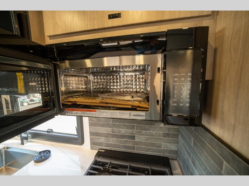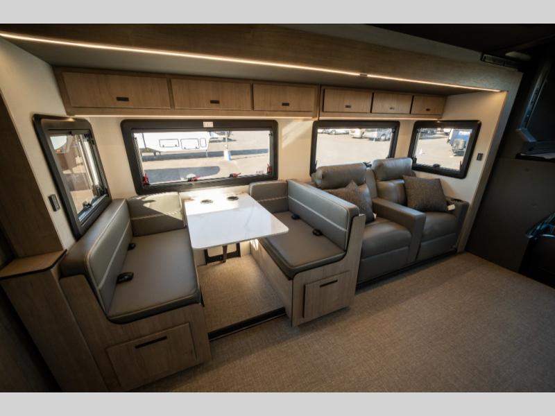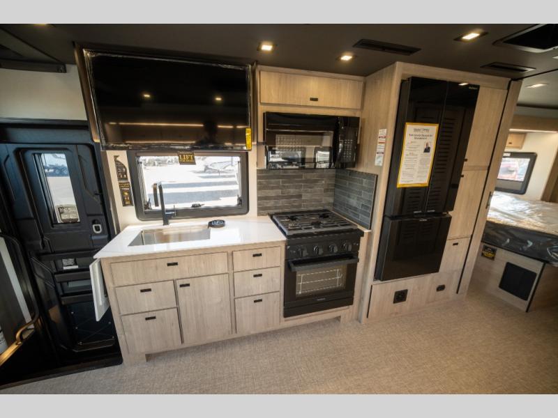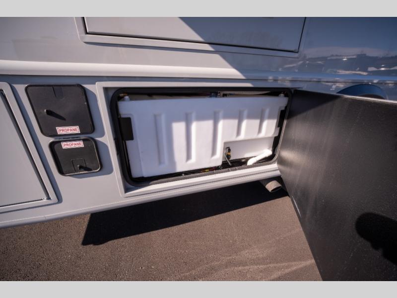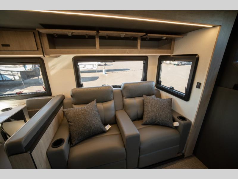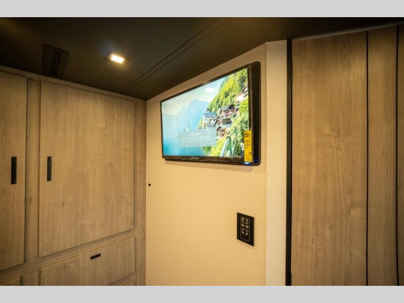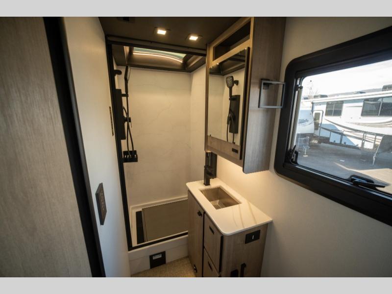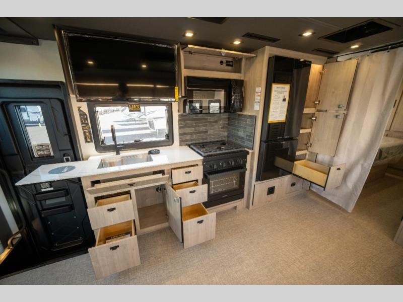 You can be sure to enjoy the journey and the stay in this coach! Once you stop for the day, you can make lunch with the kitchen appliances, then dine at the booth dinette within the large slide out. There is also power theater seating here across from a TV for easy viewing. A 10 cu. ft. 12V refrigerator and pantry will let you keep food stocked, and the closet with washer and dryer prep gives you the option to add these appliances. The 70" x 80" king bed slide is sure to provide a great night's rest, and there is a wardrobe to keep your things tidy. And of course, a full rear corner bath onboard makes staying fresh easier than ever!