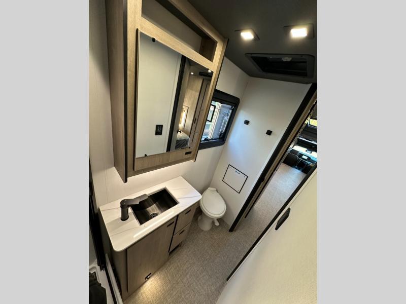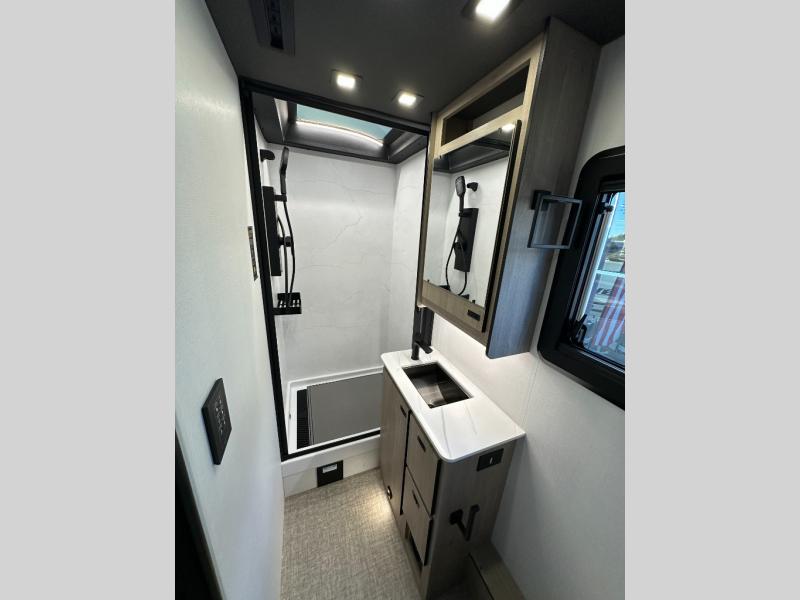 You can be sure to enjoy the journey and the stay in this coach! Once you stop for the day, you can make lunch with the kitchen appliances, then dine at the booth dinette within the large slide out. There is also power theater seating here across from a TV for easy viewing. A 10 cu. ft. 12V refrigerator and pantry will let you keep food stocked, and the closet with washer and dryer prep gives you the option to add these appliances. The 70" x 80" king bed slide is sure to provide a great night's rest, and there is a wardrobe to keep your things tidy. And of course, a full rear corner bath onboard makes staying fresh easier than ever!
