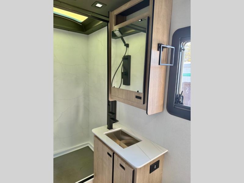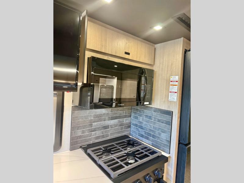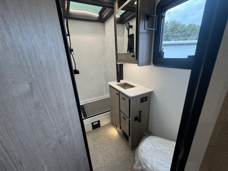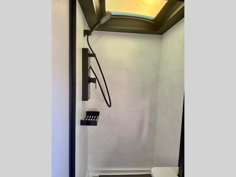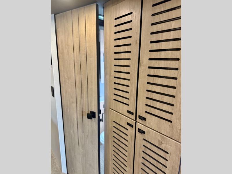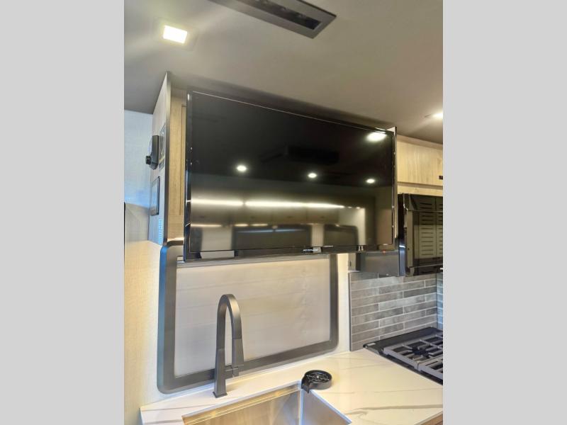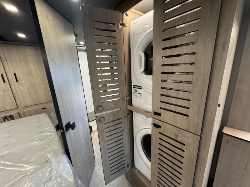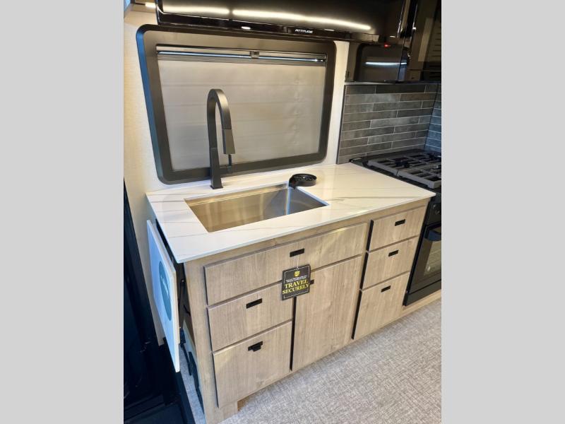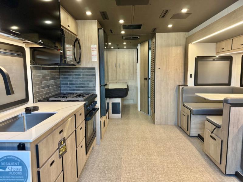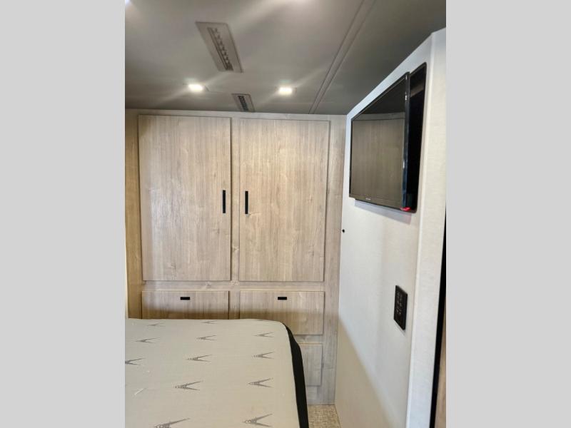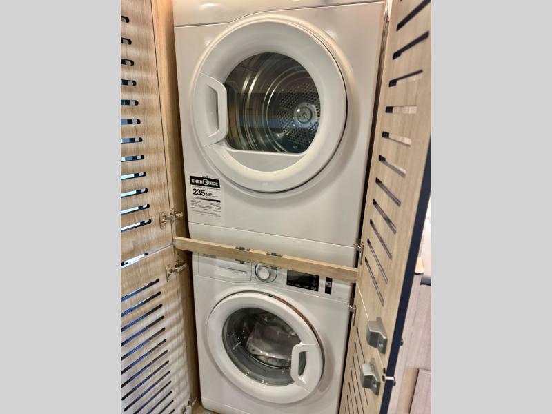 You can be sure to enjoy the journey and the stay in this coach! Once you stop for the day, you can make lunch with the kitchen appliances, then dine at the booth dinette within the large slide out. There is also power theater seating here across from a TV for easy viewing. A 10 cu. ft. 12V refrigerator and pantry will let you keep food stocked, and the closet with washer and dryer prep gives you the option to add these appliances. The 70" x 80" king bed slide is sure to provide a great night's rest, and there is a wardrobe to keep your things tidy. And of course, a full rear corner bath onboard makes staying fresh easier than ever!