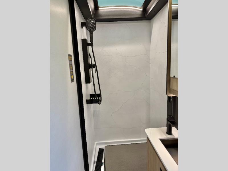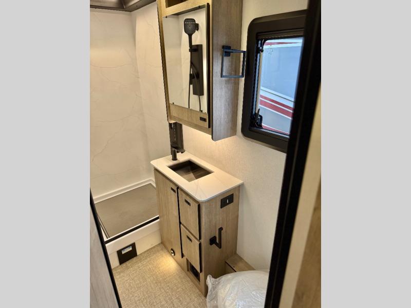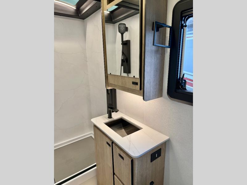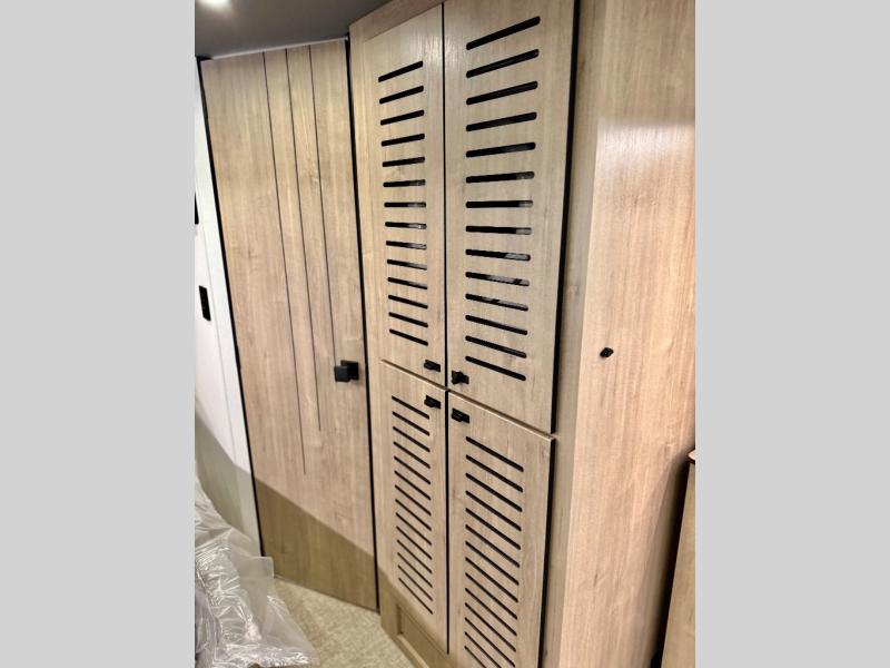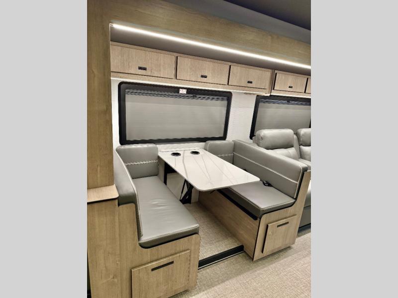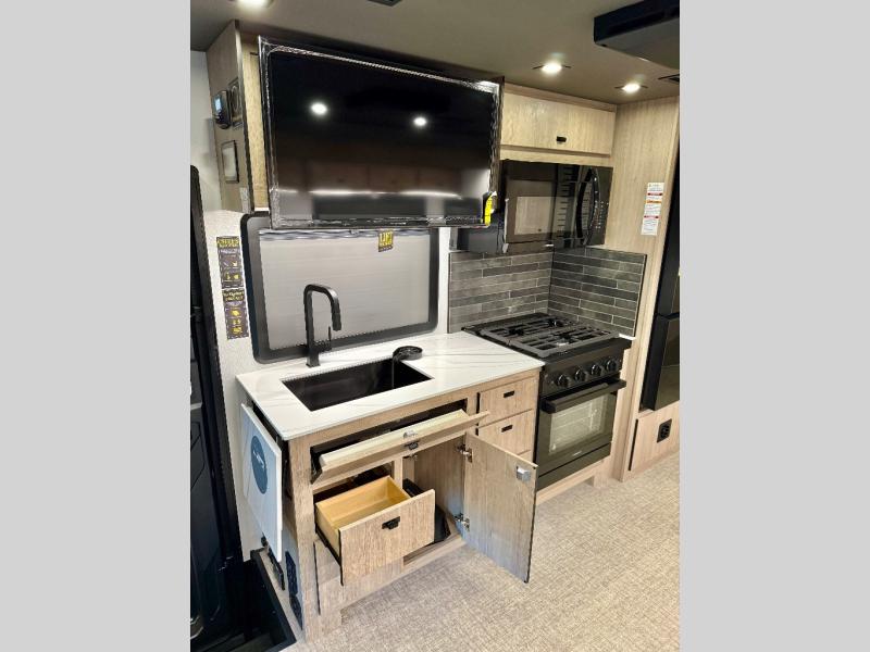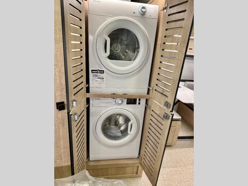 You can be sure to enjoy the journey and the stay in this coach! Once you stop for the day, you can make lunch with the kitchen appliances, then dine at the booth dinette within the large slide out. There is also power theater seating here across from a TV for easy viewing. A 10 cu. ft. 12V refrigerator and pantry will let you keep food stocked, and the closet with washer and dryer prep gives you the option to add these appliances. The 70" x 80" king bed slide is sure to provide a great night's rest, and there is a wardrobe to keep your things tidy. And of course, a full rear corner bath onboard makes staying fresh easier than ever!