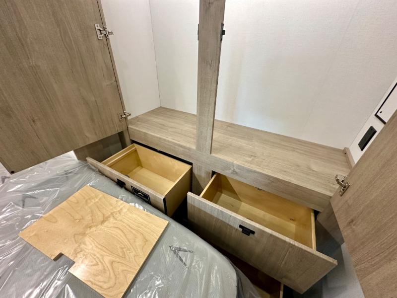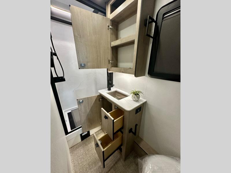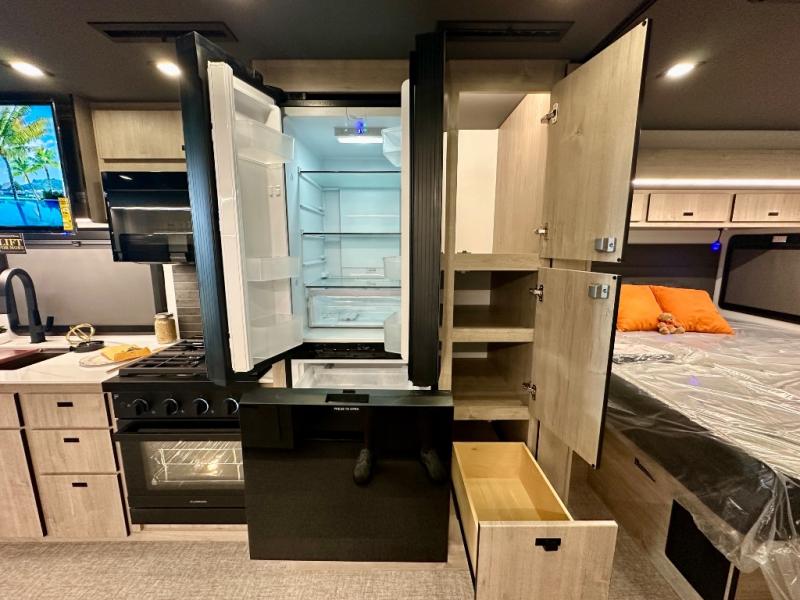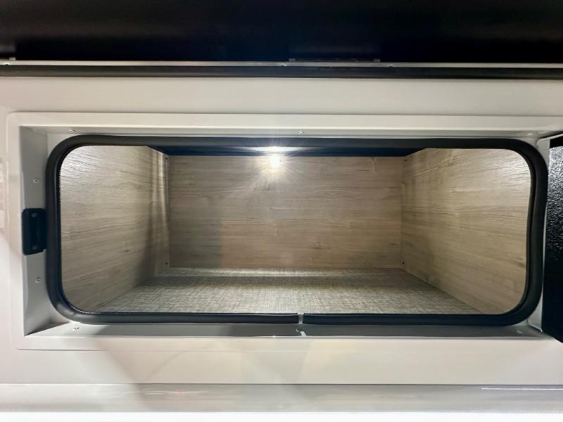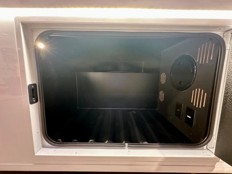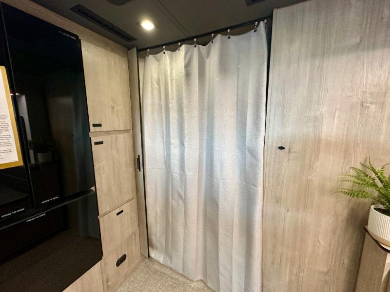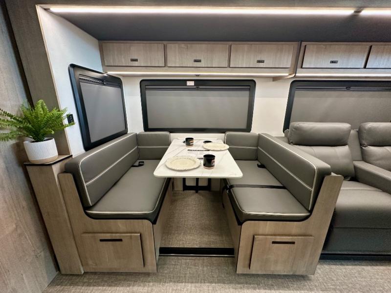 You can be sure to enjoy the journey and the stay in this coach! Once you stop for the day, you can make lunch with the kitchen appliances, then dine at the booth dinette within the large slide out. There is also power theater seating here across from a TV for easy viewing. A 10 cu. ft. 12V refrigerator and pantry will let you keep food stocked, and the closet with washer and dryer prep gives you the option to add these appliances. The 70" x 80" king bed slide is sure to provide a great night's rest, and there is a wardrobe to keep your things tidy. And of course, a full rear corner bath onboard makes staying fresh easier than ever!