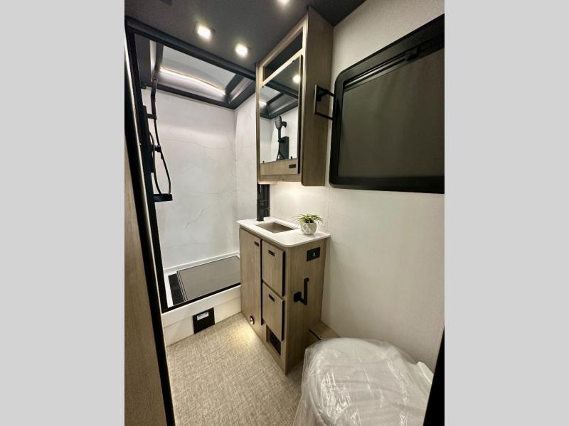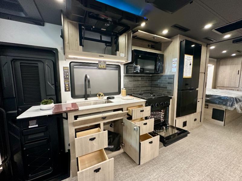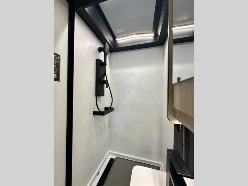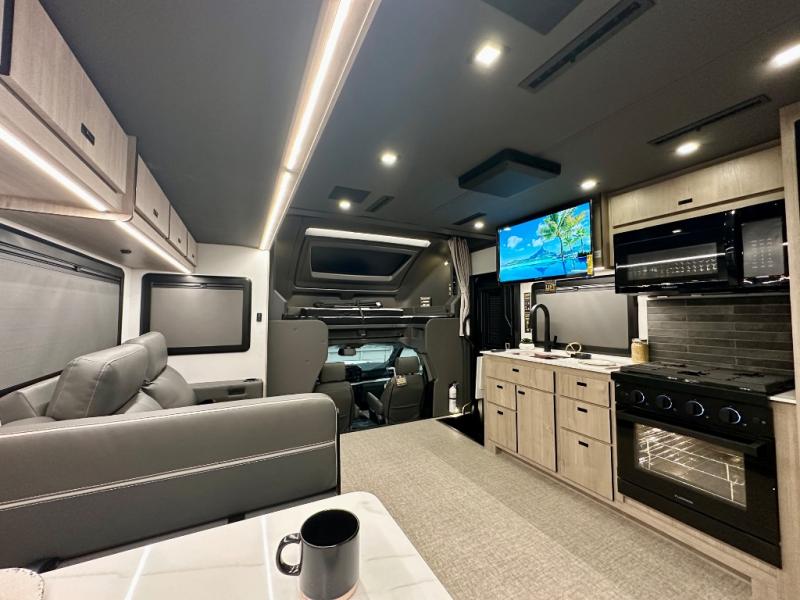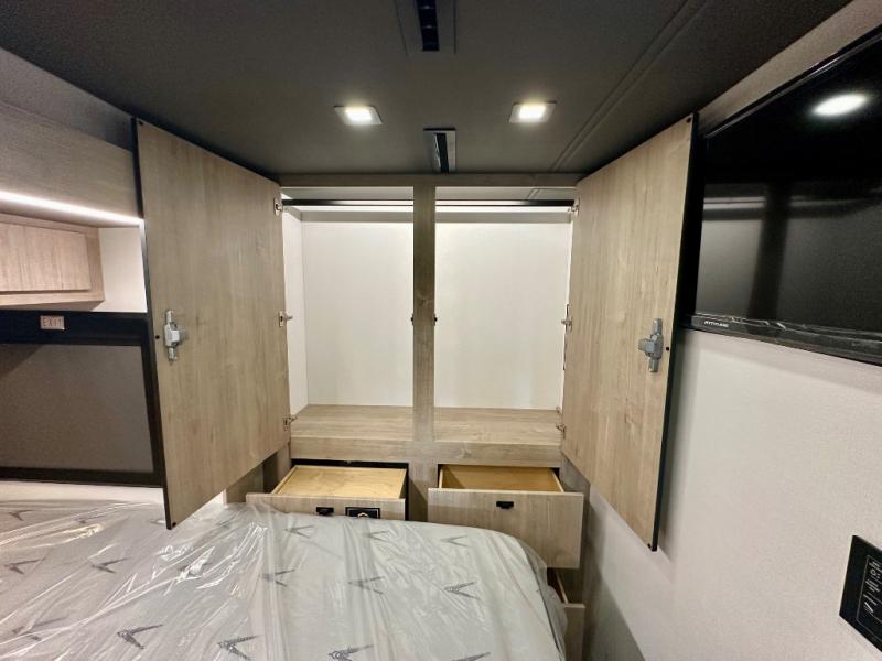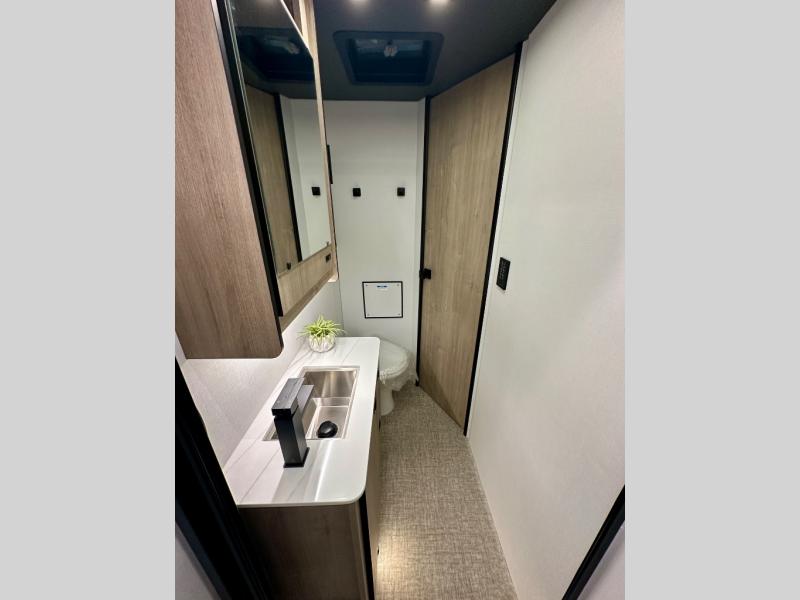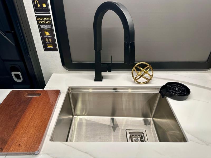 You can be sure to enjoy the journey and the stay in this coach! Once you stop for the day, you can make lunch with the kitchen appliances, then dine at the booth dinette within the large slide out. There is also power theater seating here across from a TV for easy viewing. A 10 cu. ft. 12V refrigerator and pantry will let you keep food stocked, and the closet with washer and dryer prep gives you the option to add these appliances. The 70" x 80" king bed slide is sure to provide a great night's rest, and there is a wardrobe to keep your things tidy. And of course, a full rear corner bath onboard makes staying fresh easier than ever!