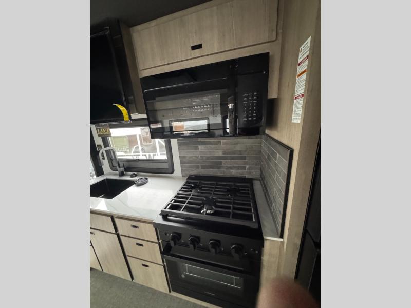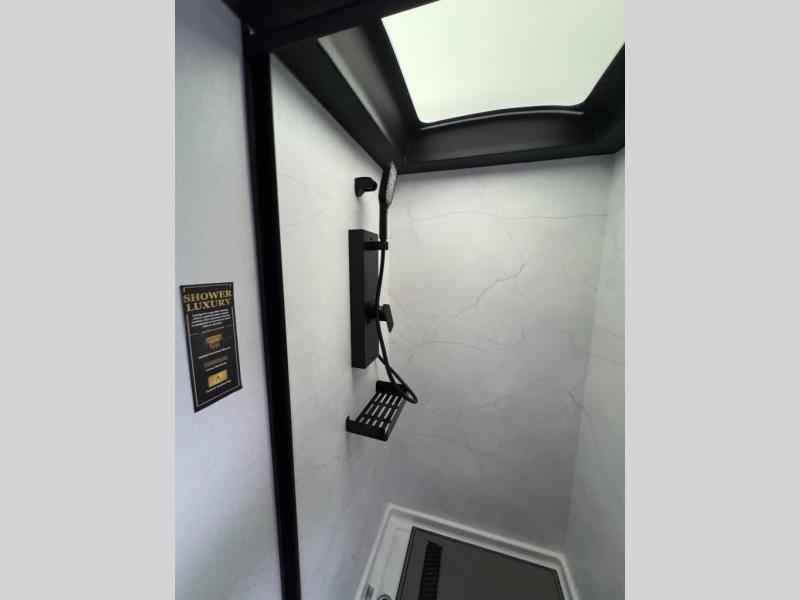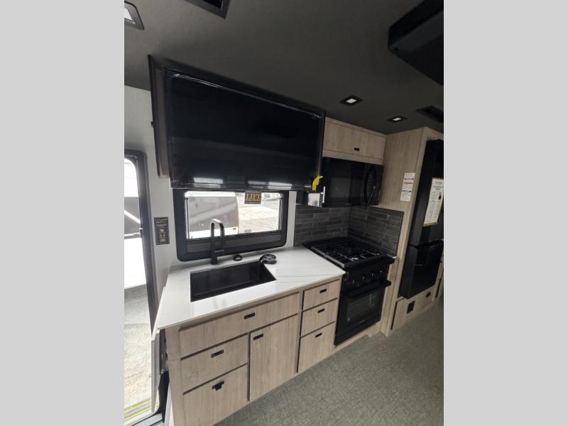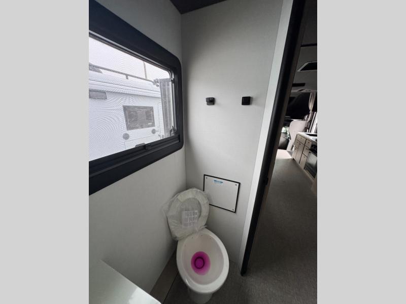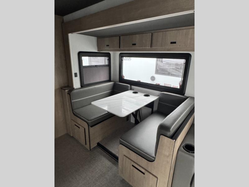 You can be sure to enjoy the journey and the stay in this coach! Once you stop for the day, you can make lunch with the kitchen appliances, then dine at the booth dinette within the large slide out. There is also power theater seating here across from a TV for easy viewing. A 10 cu. ft. 12V refrigerator and pantry will let you keep food stocked, and the closet with washer and dryer prep gives you the option to add these appliances. The 70" x 80" king bed slide is sure to provide a great night's rest, and there is a wardrobe to keep your things tidy. And of course, a full rear corner bath onboard makes staying fresh easier than ever!