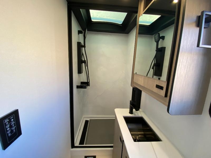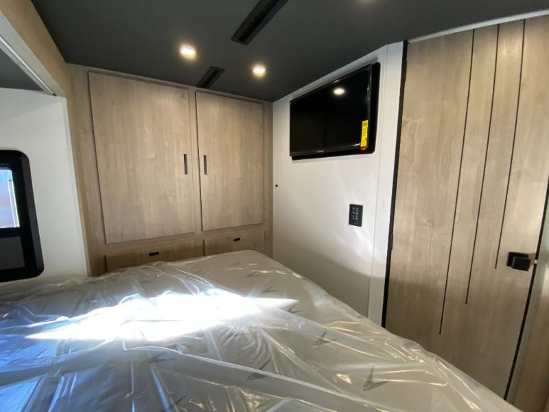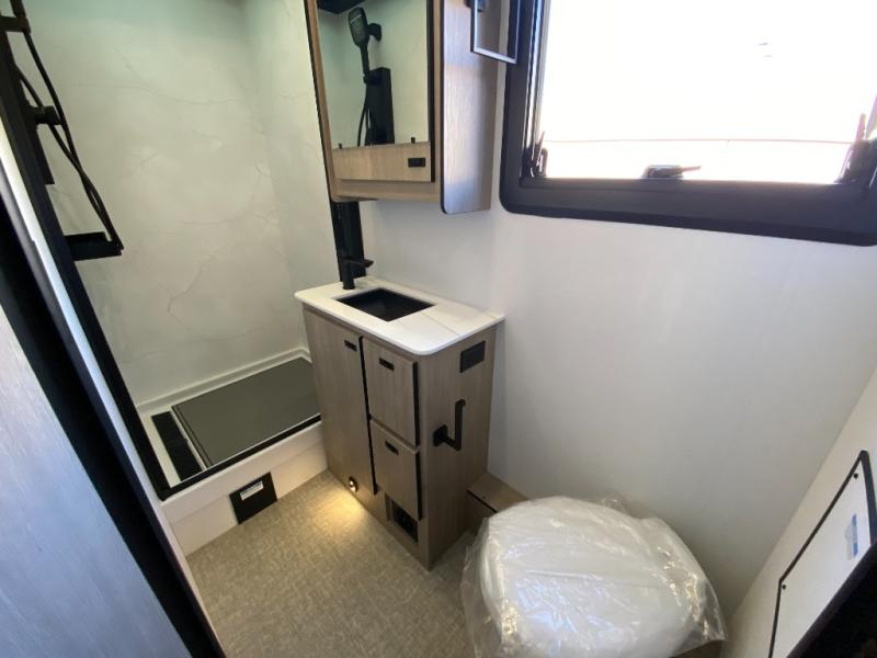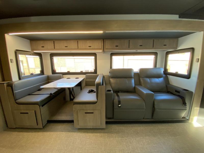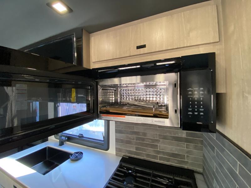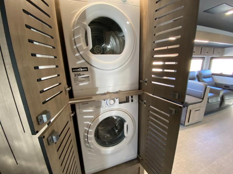 You can be sure to enjoy the journey and the stay in this coach! Once you stop for the day, you can make lunch with the kitchen appliances, then dine at the booth dinette within the large slide out. There is also power theater seating here across from a TV for easy viewing. A 10 cu. ft. 12V refrigerator and pantry will let you keep food stocked, and the closet with washer and dryer prep gives you the option to add these appliances. The 70" x 80" king bed slide is sure to provide a great night's rest, and there is a wardrobe to keep your things tidy. And of course, a full rear corner bath onboard makes staying fresh easier than ever!