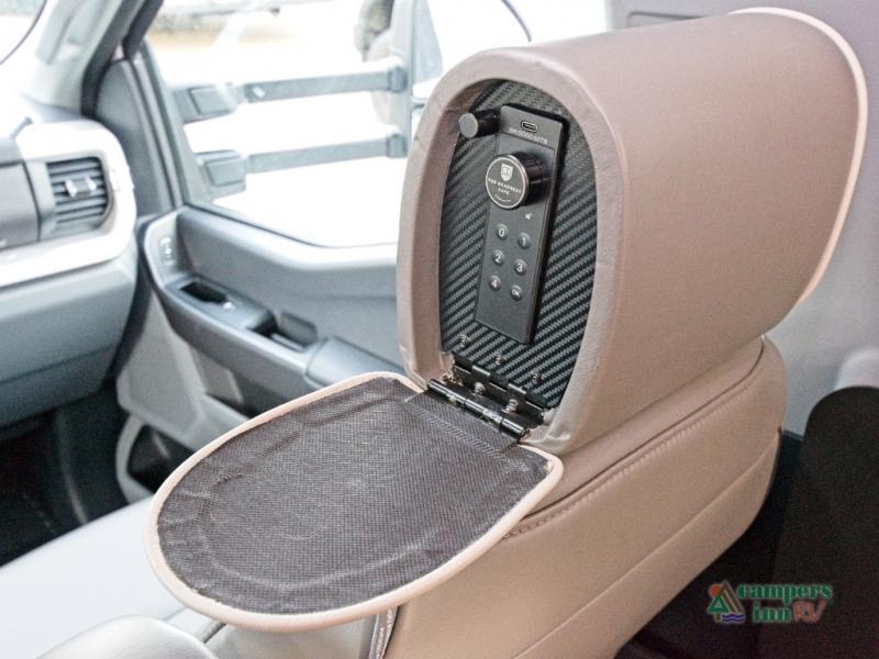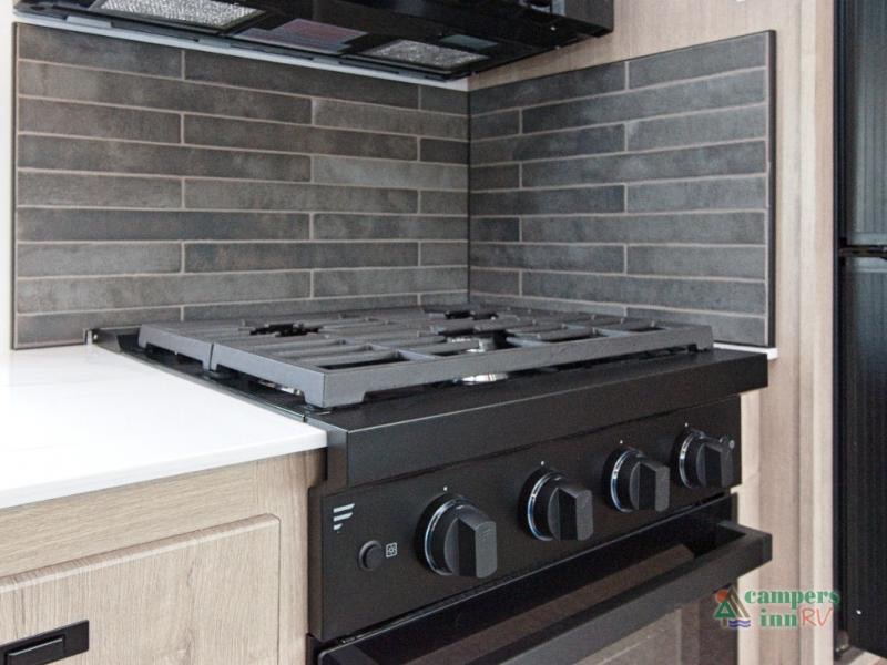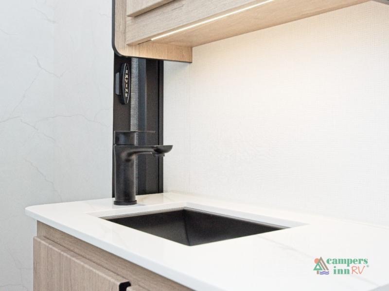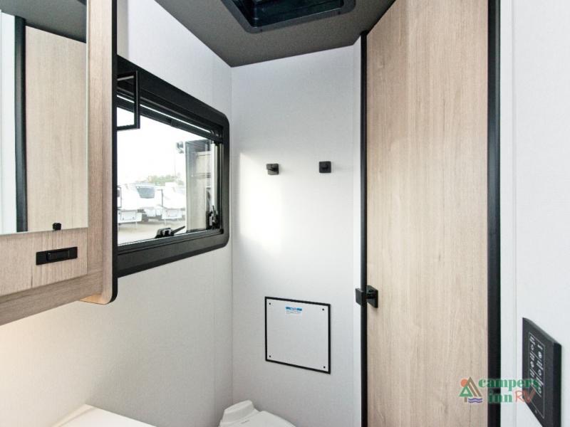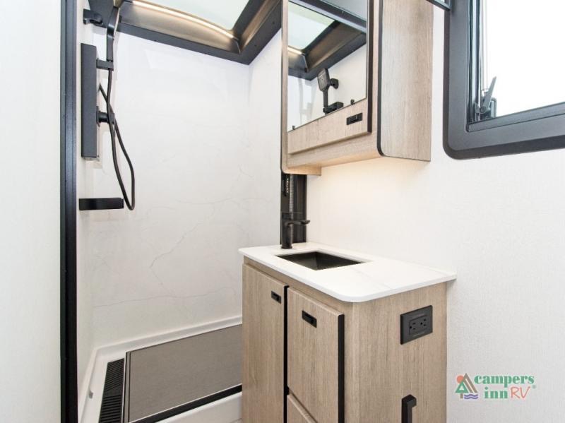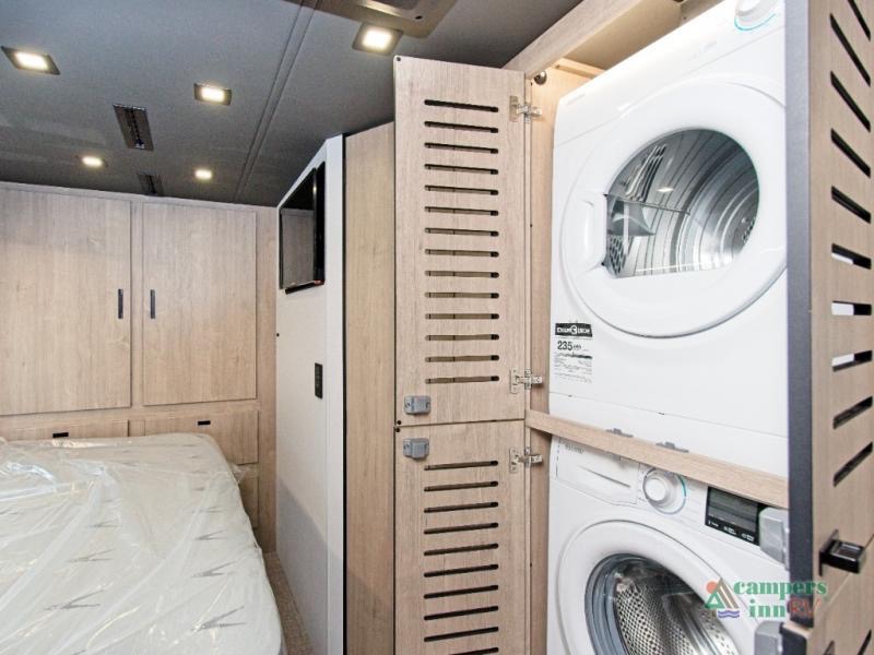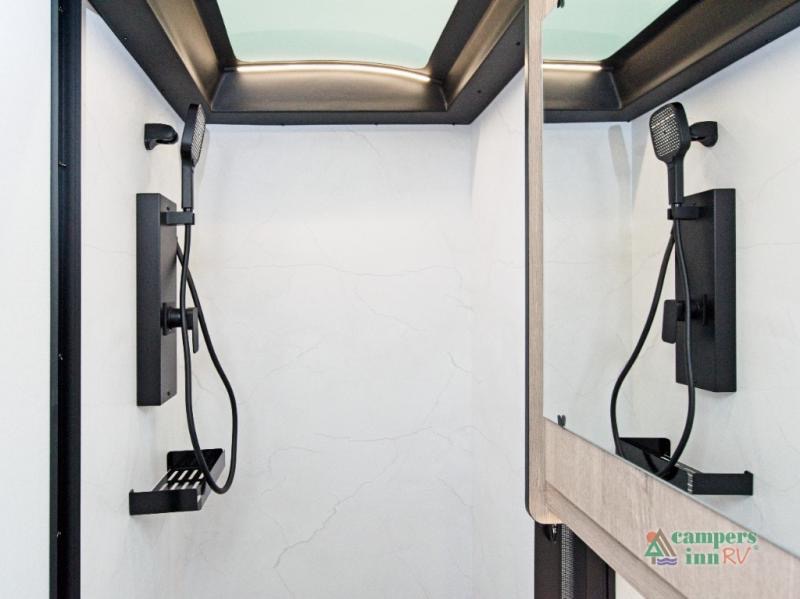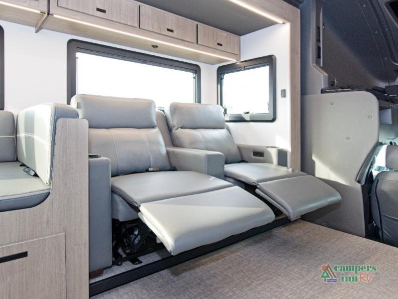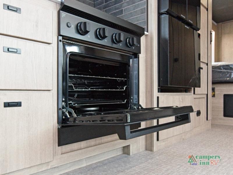You can be sure to enjoy the journey and the stay in this coach! Once you stop for the day, you can make lunch with the kitchen appliances, then dine at the booth dinette within the large slide out. There is also power theater seating here across from a TV for easy viewing. A 10 cu. ft. 12V refrigerator and pantry will let you keep food stocked, and the closet with washer and dryer prep gives you the option to add these appliances. The 70" x 80" king bed slide is sure to provide a great night's rest, and there is a wardrobe to keep your things tidy. And of course, a full rear corner bath onboard makes staying fresh easier than ever!