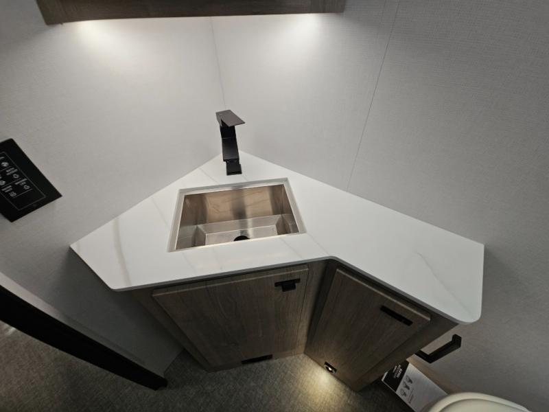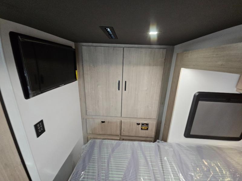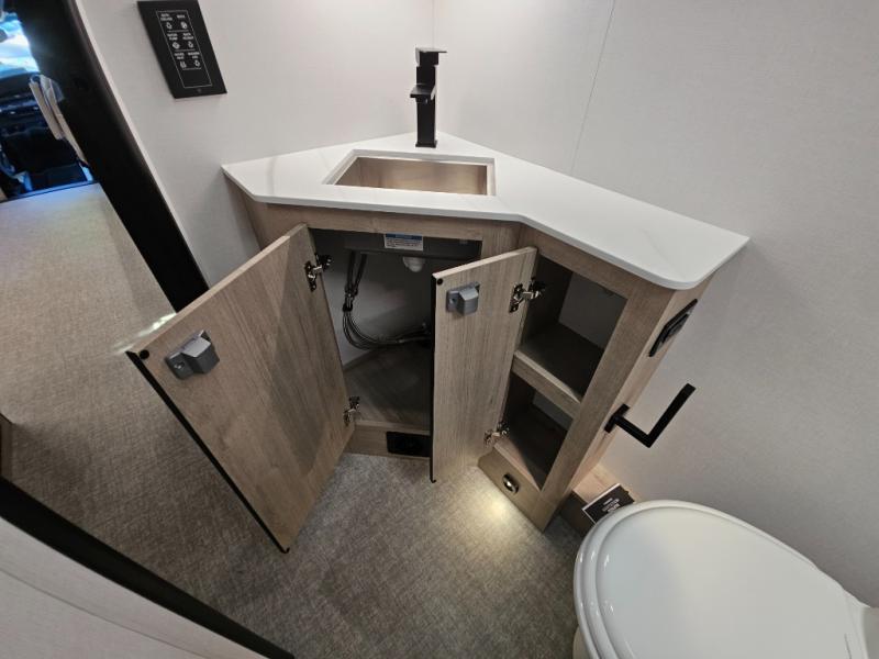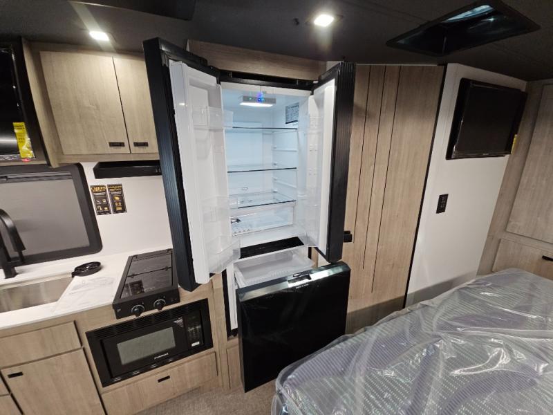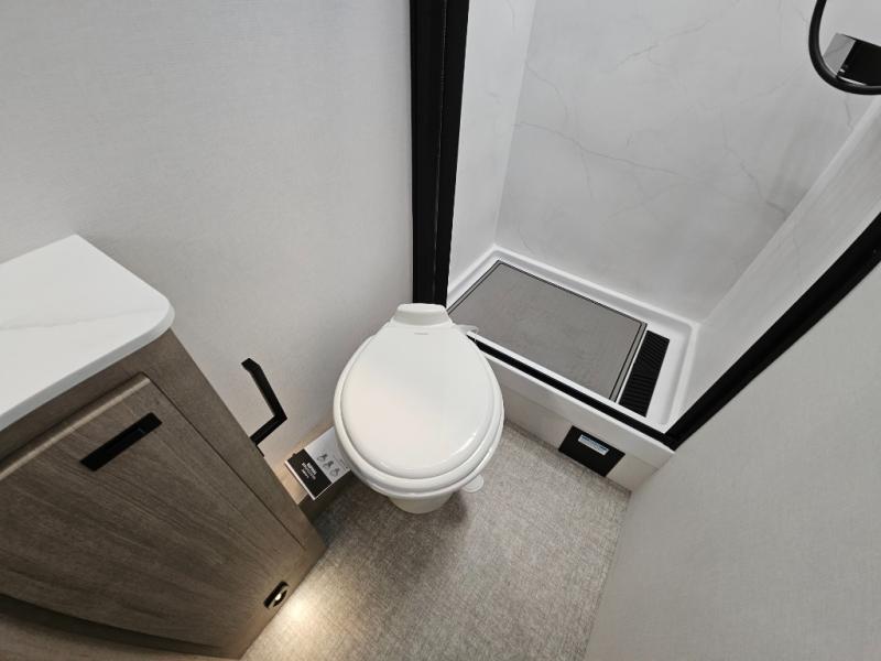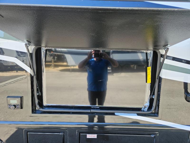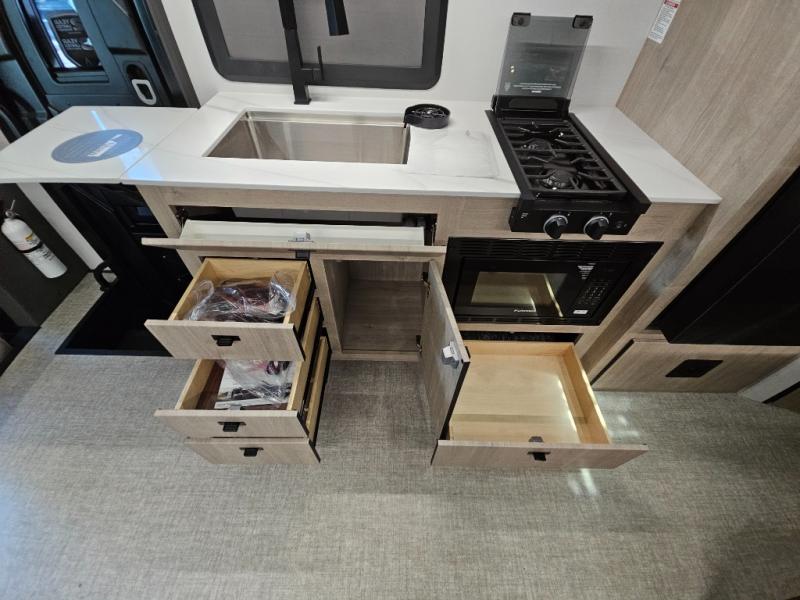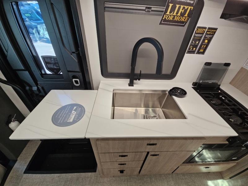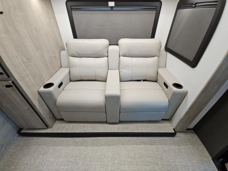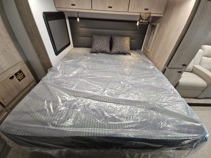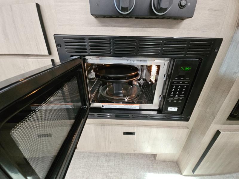 Head to your local state park or across the states in this spacious coach. Once you arrive at your destination, you can prepare a meal with the full kitchen amenities, including a cooktop, microwave oven, and a refrigerator. The power theater seating provides a place to relax, or you can choose the optional booth dinette if you need additional sleeping space. A full bath will let you clean up after a day outdoors, and the 70" x 80" king bed within the full-wall slide is sure to bring comfort. This model also includes a pantry beside the theater seats for snacks and a bedroom wardrobe to keep your clothes wrinkle-free!