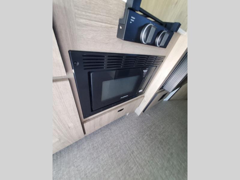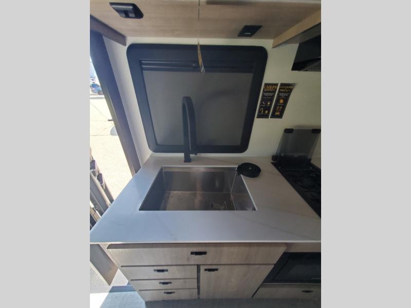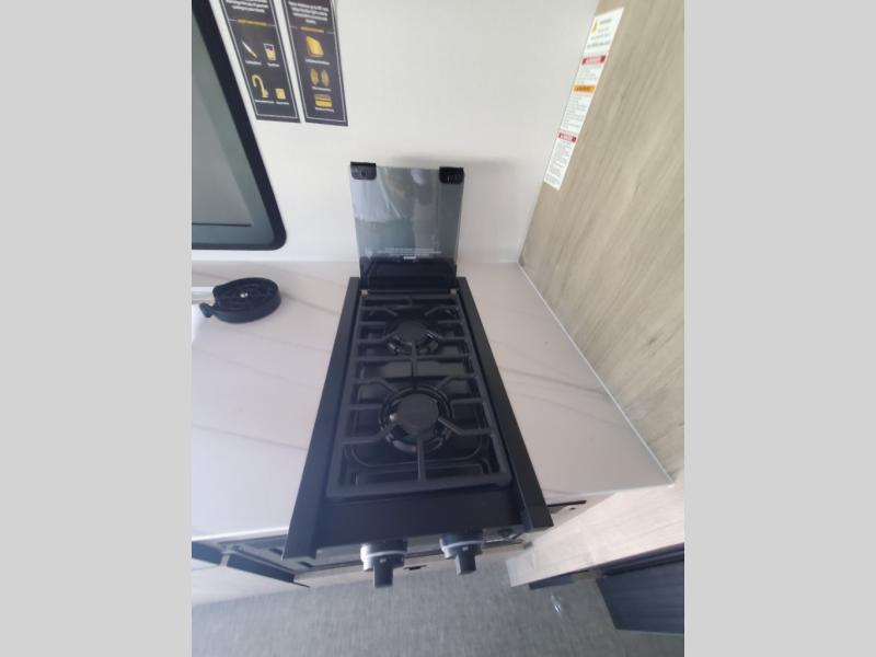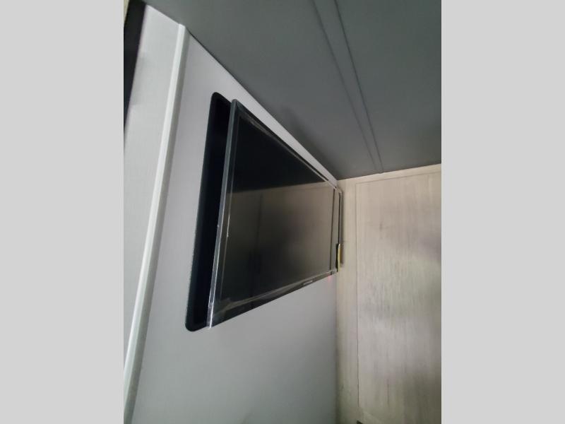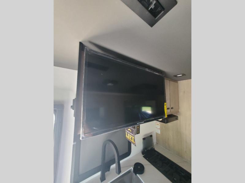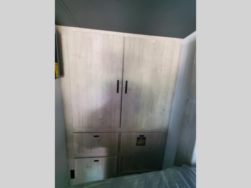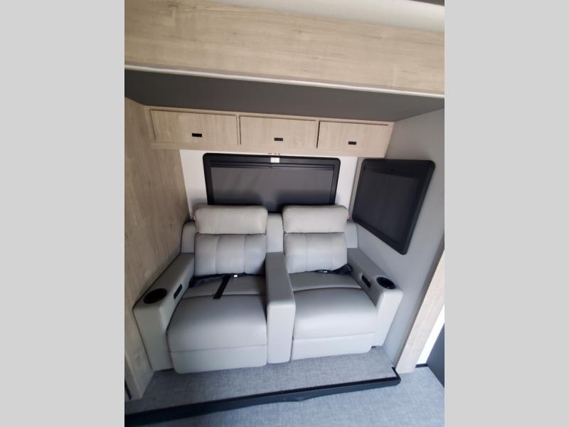 Head to your local state park or across the states in this spacious coach. Once you arrive at your destination, you can prepare a meal with the full kitchen amenities, including a cooktop, microwave oven, and a refrigerator. The power theater seating provides a place to relax, or you can choose the optional booth dinette if you need additional sleeping space. A full bath will let you clean up after a day outdoors, and the 70" x 80" king bed within the full-wall slide is sure to bring comfort. This model also includes a pantry beside the theater seats for snacks and a bedroom wardrobe to keep your clothes wrinkle-free!
