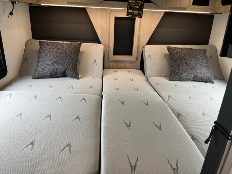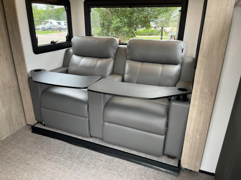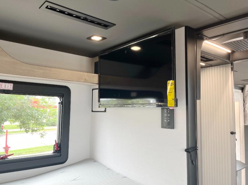 Perfect for couples or families who love to travel in style, this motorhome has everything you wish for in a coach. The rear twin beds convert to a king-sized bed, providing a spacious and comfortable sleeping area for two. The full bathroom is equipped with everything you need for a comfortable stay, providing a convenient spot to freshen up after a long day of exploring. The kitchen is equipped with a 10 cu refrigerator for ample storage, a microwave, and a two-burner cooktop for trying out any trending recipe. In addition, the pantry provides more storage for food and cookware.The 32” smart TVs in the bedroom and living room provide endless entertainment options, while the power seating ensures comfortable viewing angles. The bunk over the cab provides additional sleeping space for kids or adults, and the exterior TV offers an ideal spot to enjoy your favorite shows or sports teams while outdoors.