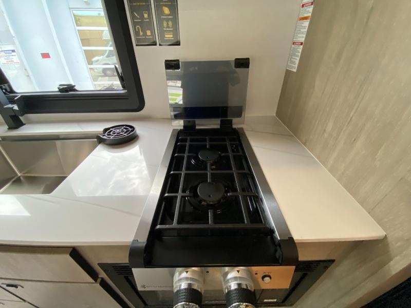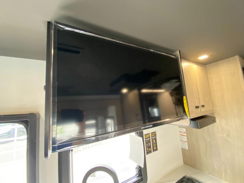 Perfect for couples or families who love to travel in style, this motorhome has everything you wish for in a coach. The rear twin beds convert to a king-sized bed, providing a spacious and comfortable sleeping area for two. The full bathroom is equipped with everything you need for a comfortable stay, providing a convenient spot to freshen up after a long day of exploring. The kitchen is equipped with a 10 cu refrigerator for ample storage, a microwave, and a two-burner cooktop for trying out any trending recipe. In addition, the pantry provides more storage for food and cookware.The 32” smart TVs in the bedroom and living room provide endless entertainment options, while the power seating ensures comfortable viewing angles. The bunk over the cab provides additional sleeping space for kids or adults, and the exterior TV offers an ideal spot to enjoy your favorite shows or sports teams while outdoors.