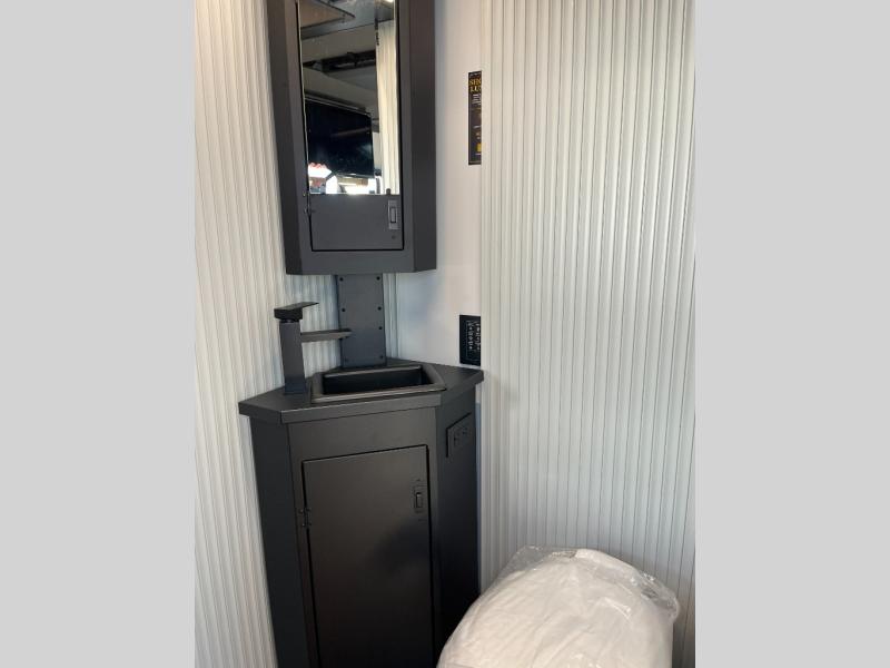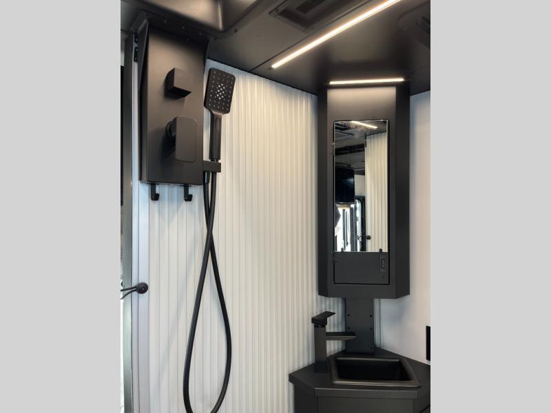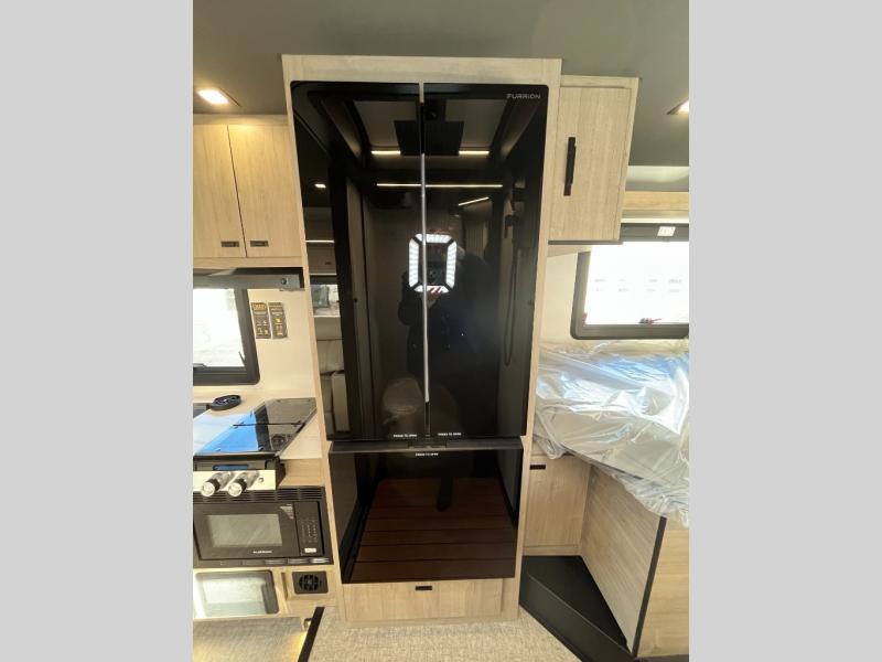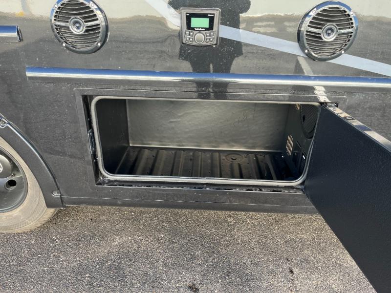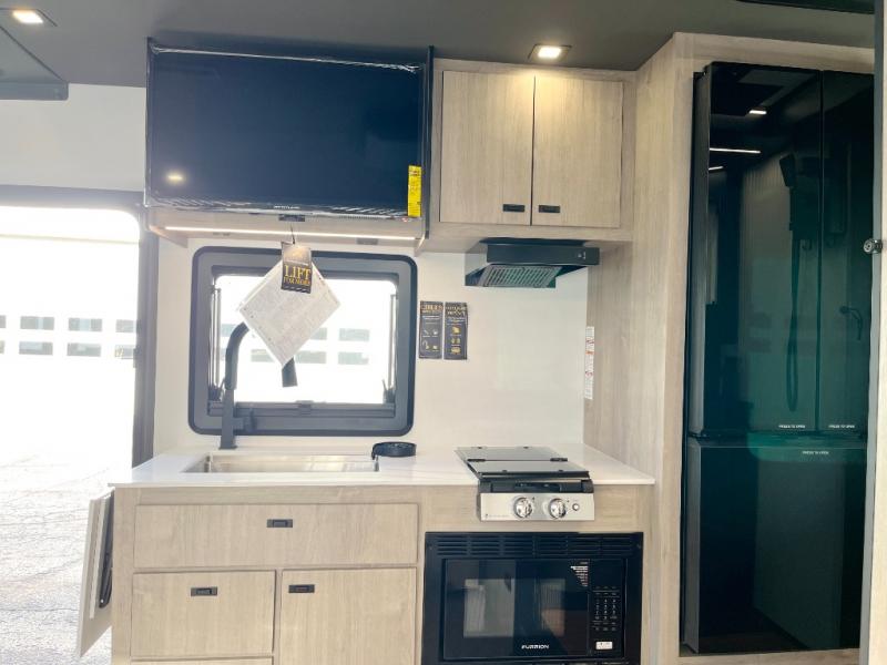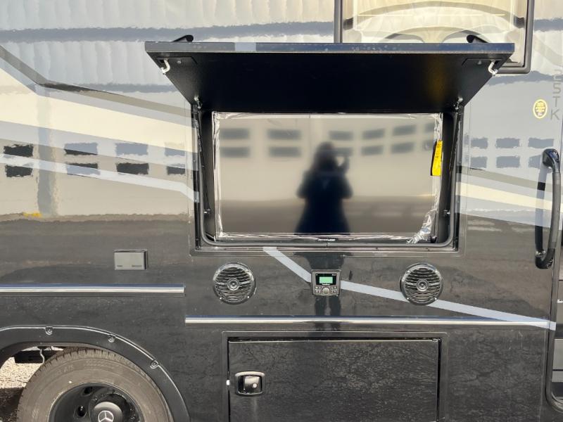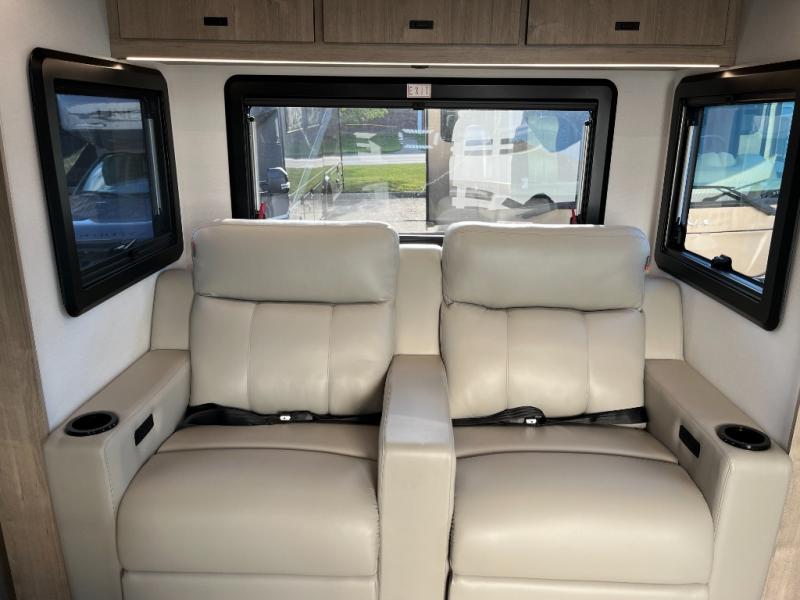 Perfect for couples or families who love to travel in style, this motorhome has everything you wish for in a coach. The rear twin beds convert to a king-sized bed, providing a spacious and comfortable sleeping area for two. The full bathroom is equipped with everything you need for a comfortable stay, providing a convenient spot to freshen up after a long day of exploring. The kitchen is equipped with a 10 cu refrigerator for ample storage, a microwave, and a two-burner cooktop for trying out any trending recipe. In addition, the pantry provides more storage for food and cookware.The 32” smart TVs in the bedroom and living room provide endless entertainment options, while the power seating ensures comfortable viewing angles. The bunk over the cab provides additional sleeping space for kids or adults, and the exterior TV offers an ideal spot to enjoy your favorite shows or sports teams while outdoors.