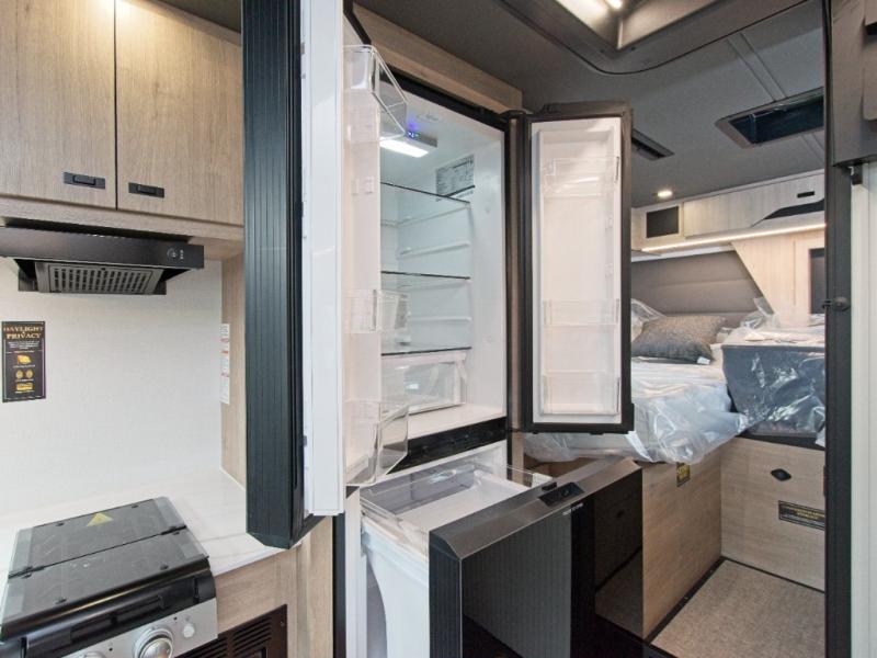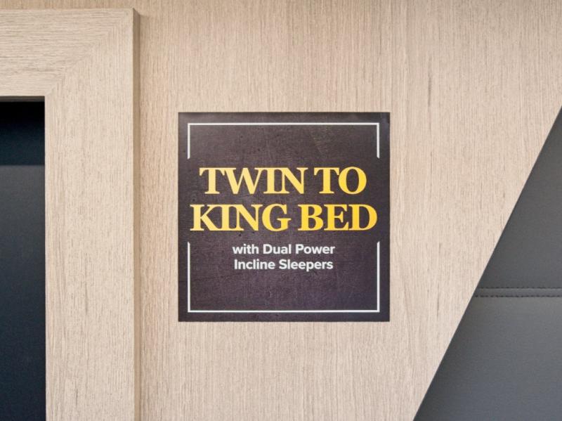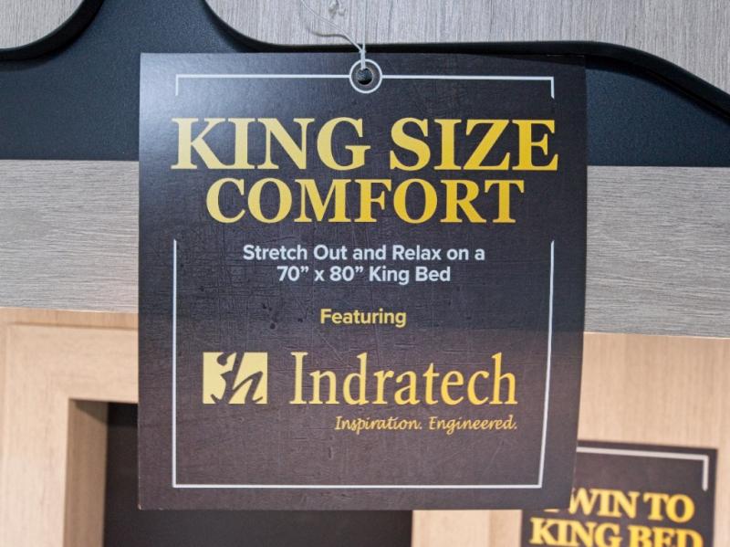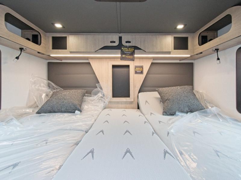Enjoy restful nights on convertible twin beds that transform into a king-sized sleeping area, ideal for two. The full bathroom ensures you stay refreshed wherever your journey takes you, while the modern kitchen features a spacious 10 cu. ft. refrigerator, microwave, two-burner cooktop, and a pantry for all your culinary needs.