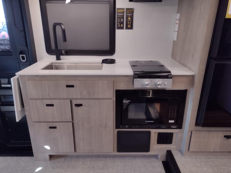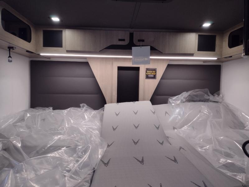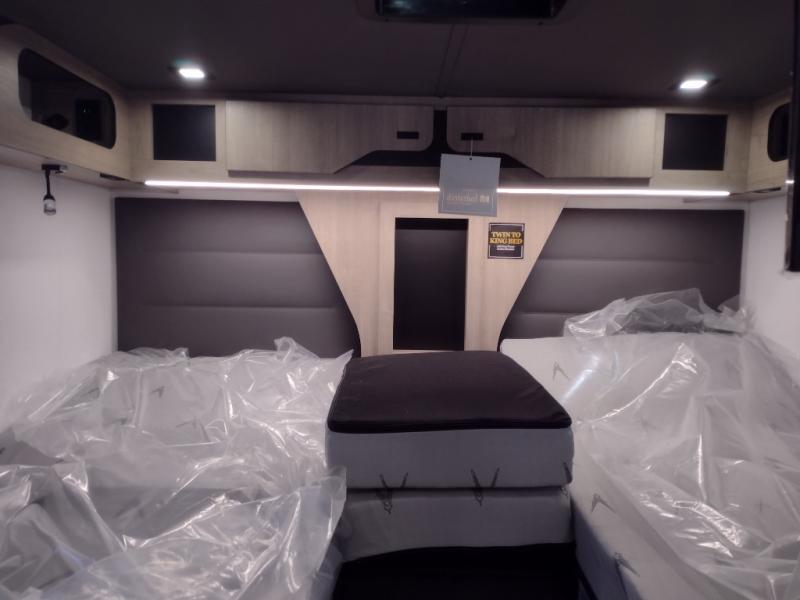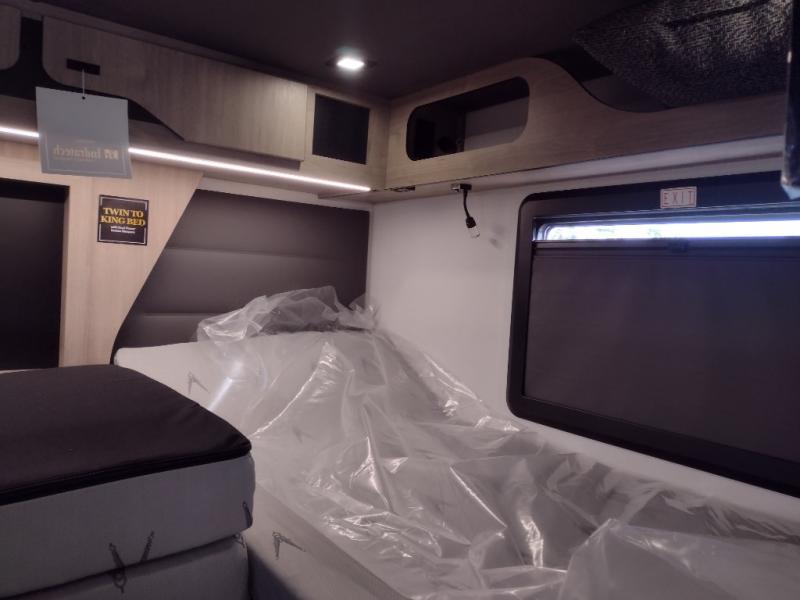 Perfect for couples or families who love to travel in style, this motorhome has everything you wish for in a coach. The rear twin beds convert to a king-sized bed, providing a spacious and comfortable sleeping area for two. The full bathroom is equipped with everything you need for a comfortable stay, providing a convenient spot to freshen up after a long day of exploring. The kitchen is equipped with a 10 cu refrigerator for ample storage, a microwave, and a two-burner cooktop for trying out any trending recipe. In addition, the pantry provides more storage for food and cookware.The 32” smart TVs in the bedroom and living room provide endless entertainment options, while the power seating ensures comfortable viewing angles. The bunk over the cab provides additional sleeping space for kids or adults, and the exterior TV offers an ideal spot to enjoy your favorite shows or sports teams while outdoors.