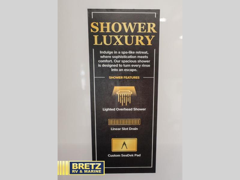 Perfect for couples or families who love to travel in style, this motorhome has everything you wish for in a coach. The rear twin beds convert to a king-sized bed, providing a spacious and comfortable sleeping area for two. The full bathroom is equipped with everything you need for a comfortable stay, providing a convenient spot to freshen up after a long day of exploring. The kitchen is equipped with a 10 cu refrigerator for ample storage, a microwave, and a two-burner cooktop for trying out any trending recipe. In addition, the pantry provides more storage for food and cookware.The 32” smart TVs in the bedroom and living room provide endless entertainment options, while the power seating ensures comfortable viewing angles. The bunk over the cab provides additional sleeping space for kids or adults, and the exterior TV offers an ideal spot to enjoy your favorite shows or sports teams while outdoors.