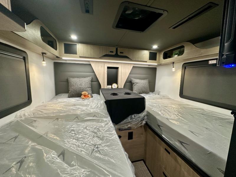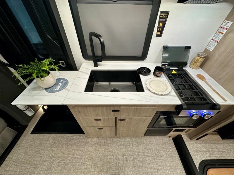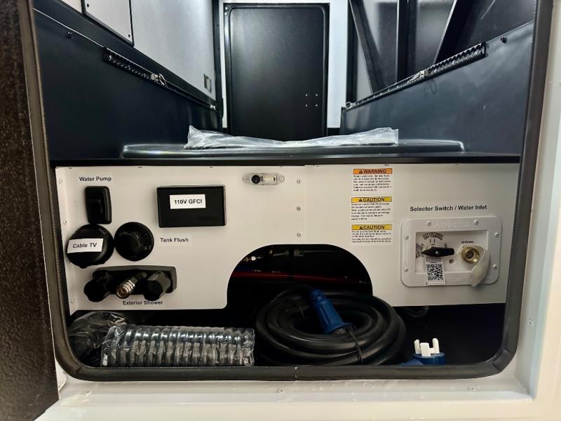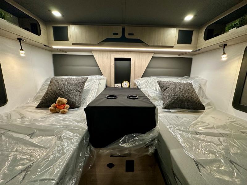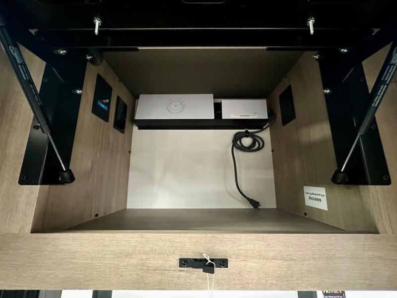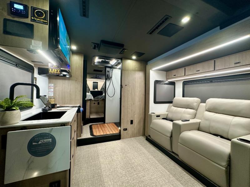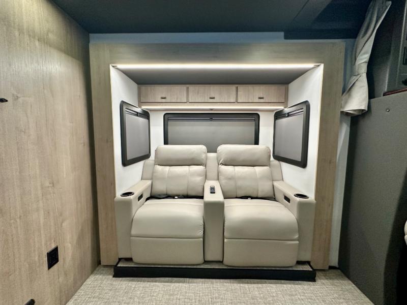 Perfect for couples or families who love to travel in style, this motorhome has everything you wish for in a coach. The rear twin beds convert to a king-sized bed, providing a spacious and comfortable sleeping area for two. The full bathroom is equipped with everything you need for a comfortable stay, providing a convenient spot to freshen up after a long day of exploring. The kitchen is equipped with a 10 cu refrigerator for ample storage, a microwave, and a two-burner cooktop for trying out any trending recipe. In addition, the pantry provides more storage for food and cookware.The 32” smart TVs in the bedroom and living room provide endless entertainment options, while the power seating ensures comfortable viewing angles. The bunk over the cab provides additional sleeping space for kids or adults, and the exterior TV offers an ideal spot to enjoy your favorite shows or sports teams while outdoors.