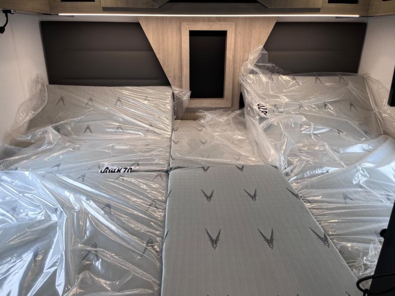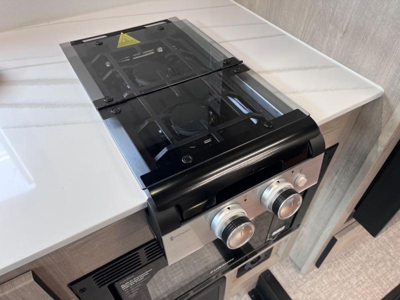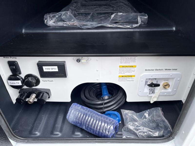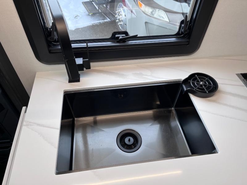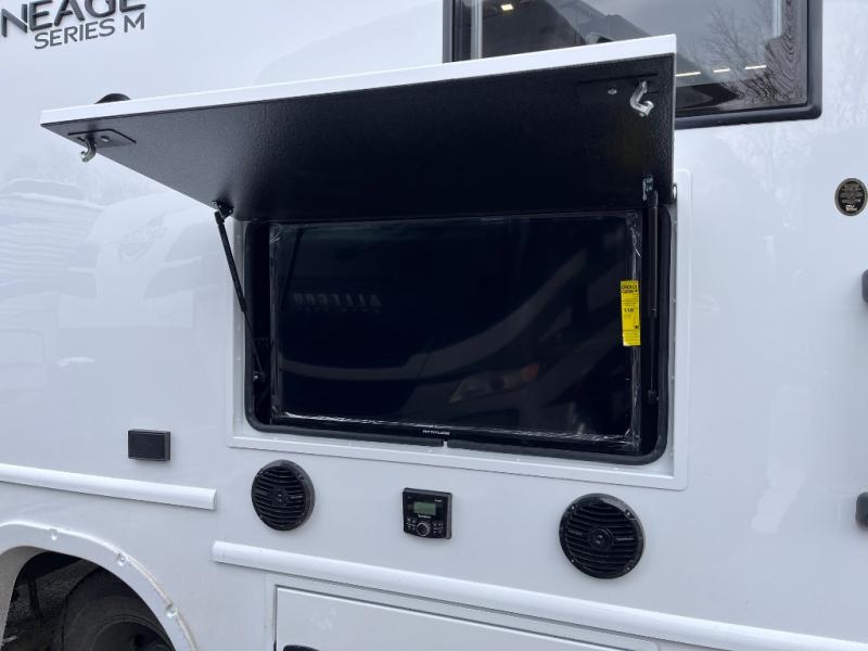 Perfect for couples or families who love to travel in style, this motorhome has everything you wish for in a coach. The rear twin beds convert to a king-sized bed, providing a spacious and comfortable sleeping area for two. The full bathroom is equipped with everything you need for a comfortable stay, providing a convenient spot to freshen up after a long day of exploring. The kitchen is equipped with a 10 cu refrigerator for ample storage, a microwave, and a two-burner cooktop for trying out any trending recipe. In addition, the pantry provides more storage for food and cookware.The 32” smart TVs in the bedroom and living room provide endless entertainment options, while the power seating ensures comfortable viewing angles. The bunk over the cab provides additional sleeping space for kids or adults, and the exterior TV offers an ideal spot to enjoy your favorite shows or sports teams while outdoors.