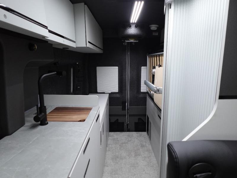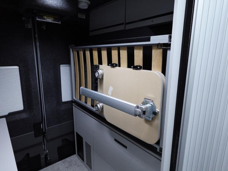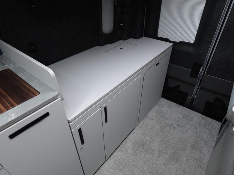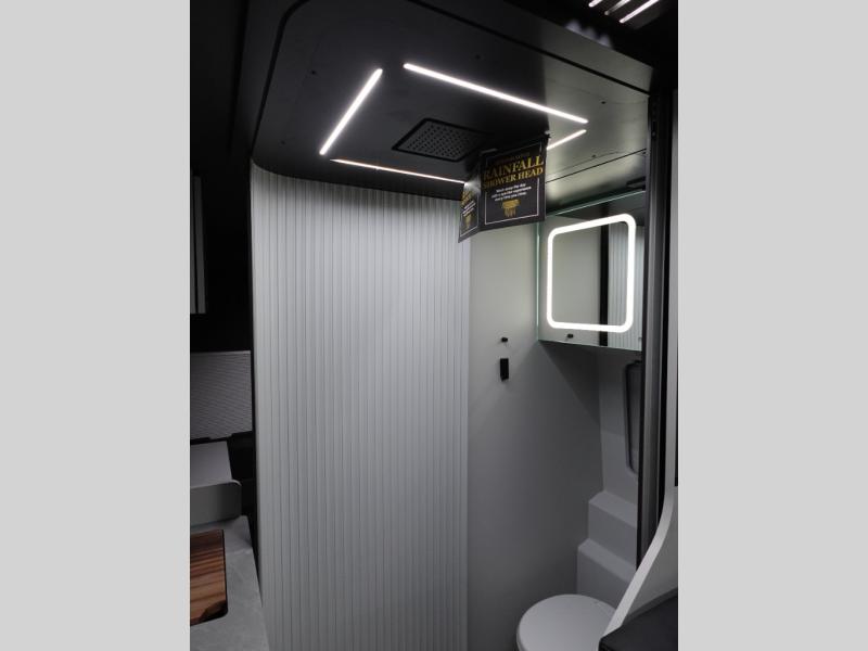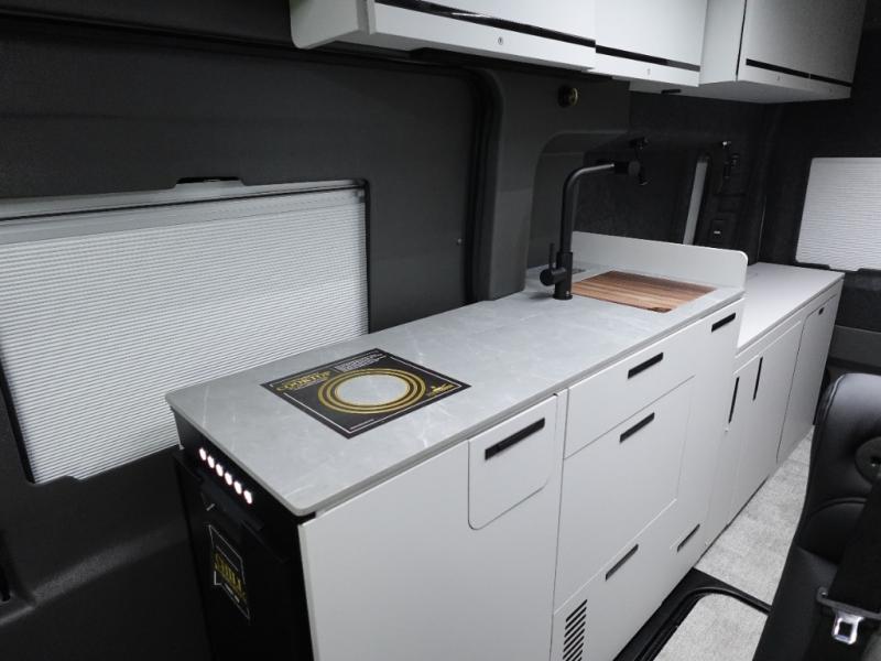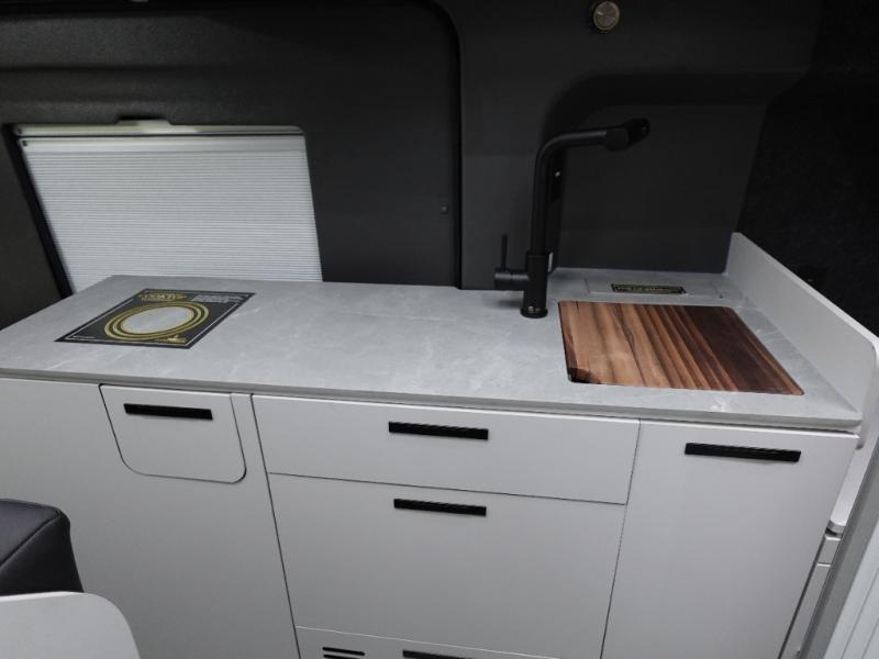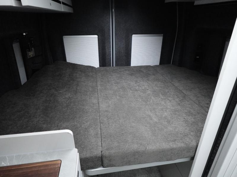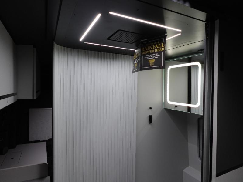 This luxury motorhome for the modern adventurer will be your favorite! The flip-up bed provides a comfortable sleeping area, perfect for restful nights on the road. The entertainment spot is provided in the motorized projector screen, which is ideal for movie nights, sporting events, or presentations, making it a great way to unwind or entertain friends and family. The bathroom provides a private and convenient space for personal needs, and the kitchen features an undermount cooktop, perfect for preparing your favorite meals, 3.2 cu. ft. refrigerator for keeping perishables fresh, and a sink for easy cleanup. The exterior awning provides shade and protection from the elements, while the sliding door offers easy access and added convenience.