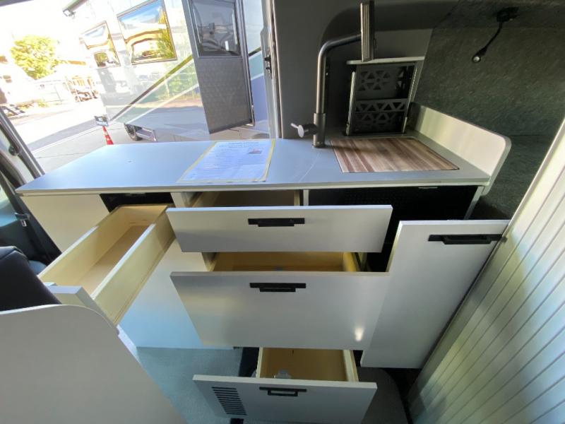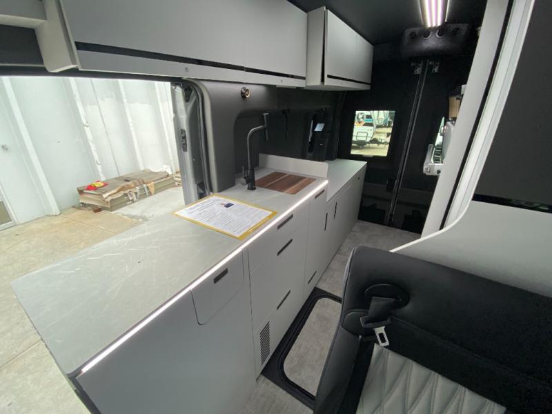 This luxury motorhome for the modern adventurer will be your favorite! The flip-up bed provides a comfortable sleeping area, perfect for restful nights on the road. The entertainment spot is provided in the motorized projector screen, which is ideal for movie nights, sporting events, or presentations, making it a great way to unwind or entertain friends and family. The bathroom provides a private and convenient space for personal needs, and the kitchen features an undermount cooktop, perfect for preparing your favorite meals, 3.2 cu. ft. refrigerator for keeping perishables fresh, and a sink for easy cleanup. The exterior awning provides shade and protection from the elements, while the sliding door offers easy access and added convenience.