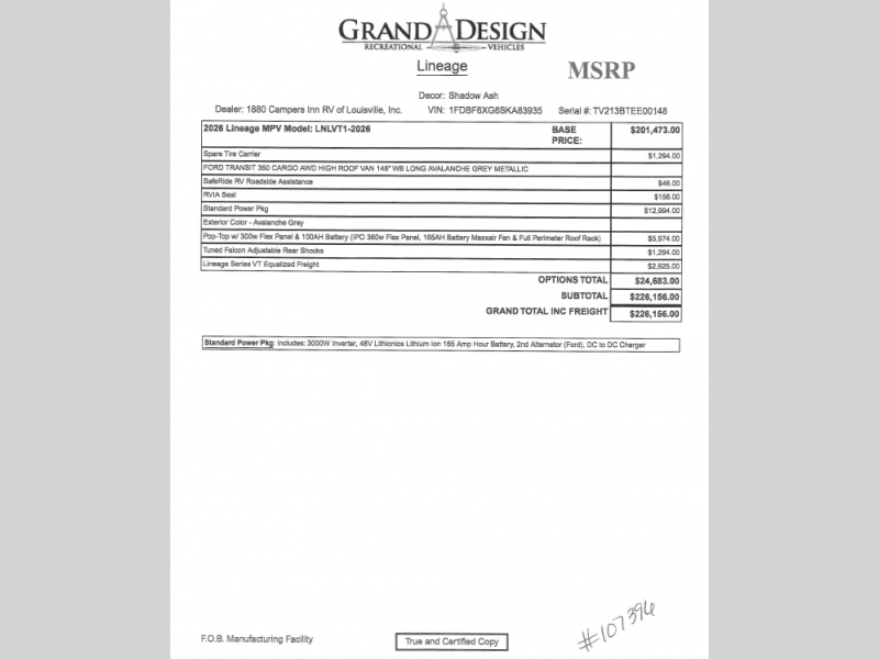 New 2026 Grand Design Lineage Series VT LVT1 Motor Home Class B