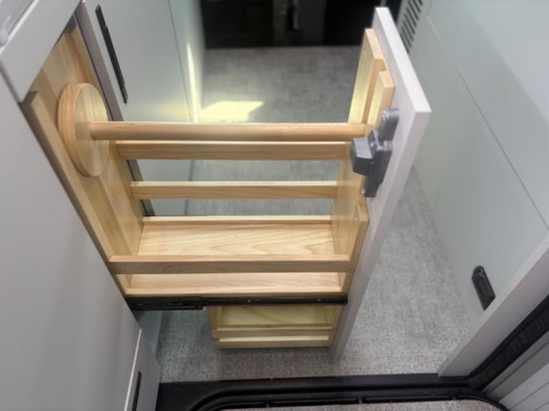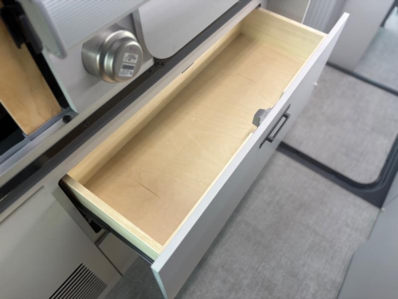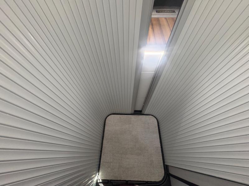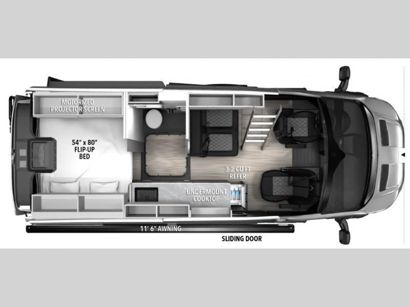 This luxury motorhome for the modern adventurer will be your favorite! The flip-up bed provides a comfortable sleeping area, perfect for restful nights on the road. The entertainment spot is provided in the motorized projector screen, which is ideal for movie nights, sporting events, or presentations, making it a great way to unwind or entertain friends and family. The bathroom provides a private and convenient space for personal needs, and the kitchen features an undermount cooktop, perfect for preparing your favorite meals, 3.2 cu. ft. refrigerator for keeping perishables fresh, and a sink for easy cleanup. The exterior awning provides shade and protection from the elements, while the sliding door offers easy access and added convenience.