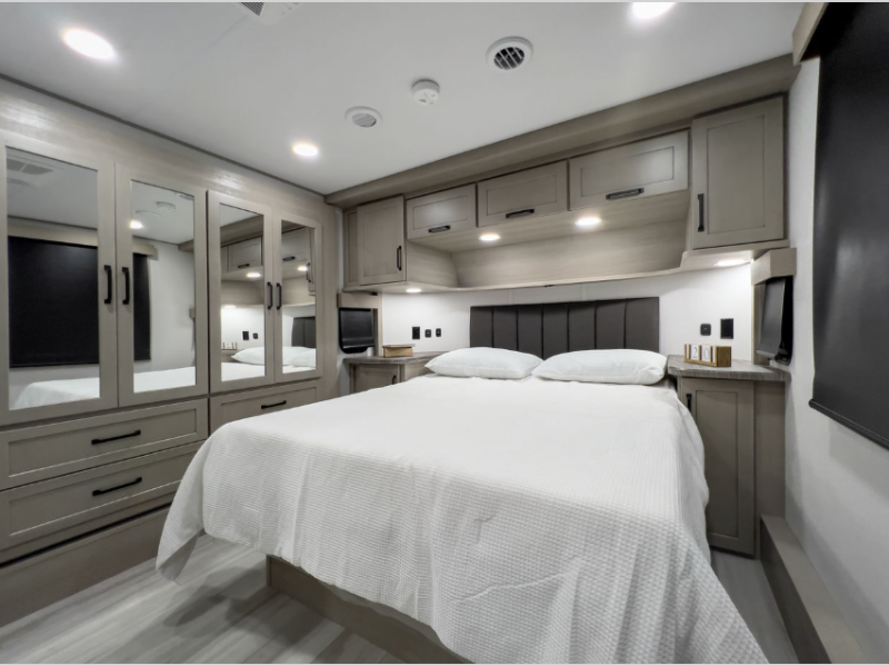 A dual entry bath leads to a private bedroom featuring a queen bed with optional king, overhead storage, and wardrobe slide. It's a comfortable retreat designed for restful nights and easy mornings.