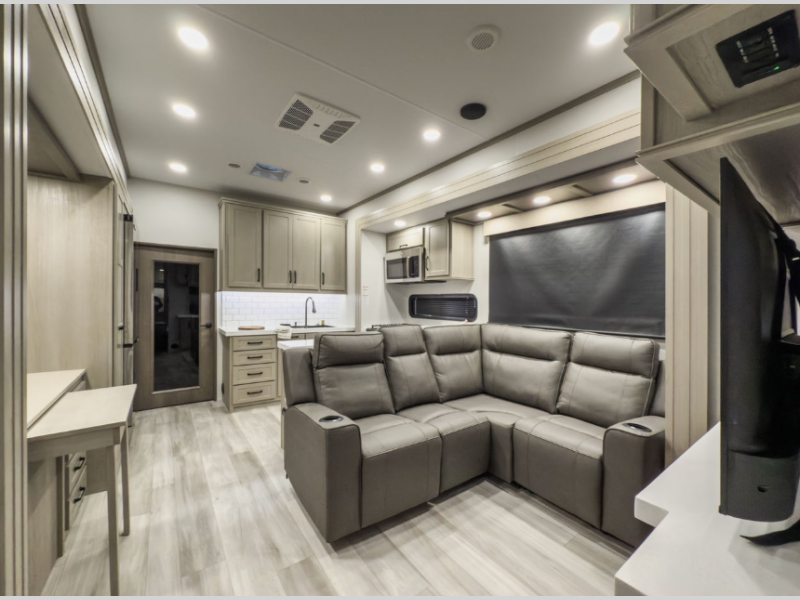 The Momentum 344M is engineered for all-season adventures with a fully enclosed and heated underbelly, 5-sided aluminum cage construction, triple insulated garage floor, and Weather-Tek Package with Stealth AC System. Enjoy superior towing performance with the MORryde CRE3000 suspension system, rubber pin box, and upgraded axle hangers.