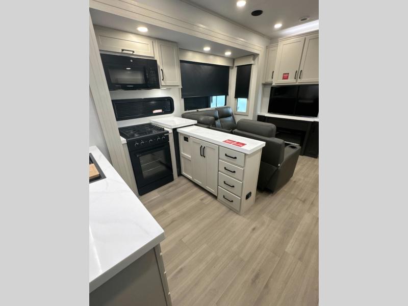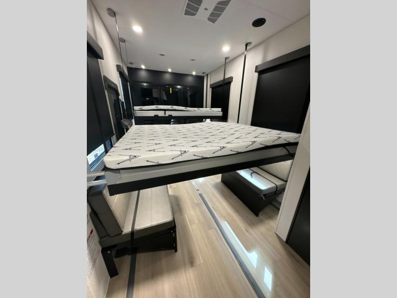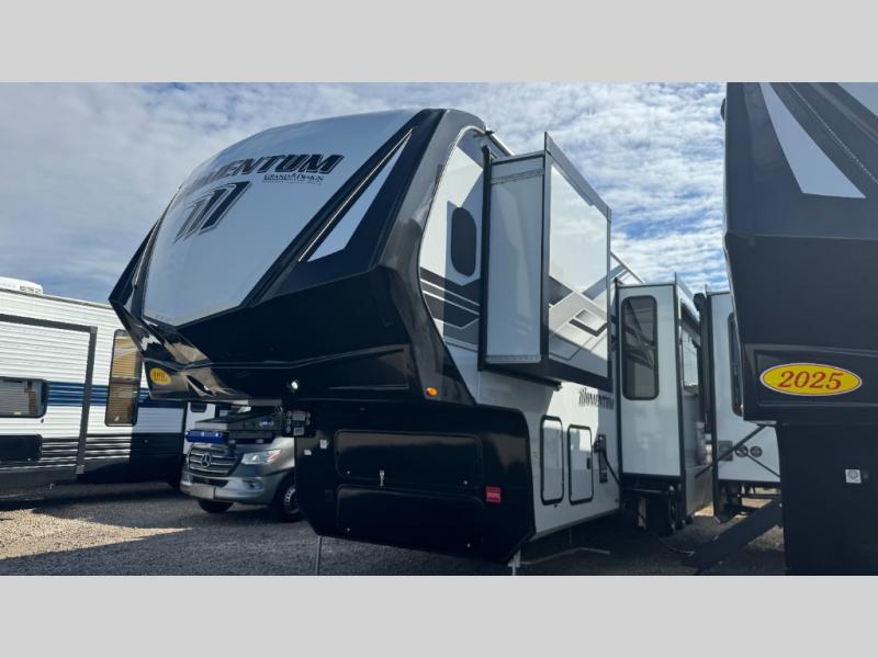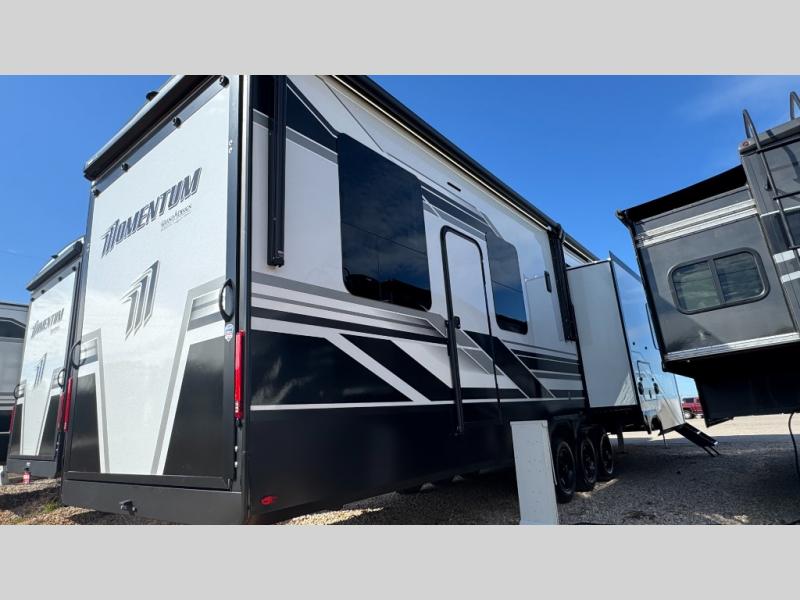 The Momentum fifth wheel toy haulers by Grand Design are built for four seasons of travel with your off-road toys and include luxurious accommodations throughout for extreme living! Each is constructed to a superior standard with the fully enclosed and heated underbelly and storage area, the 5-sided aluminum cage, and the triple insulated garage floor. The MORryde CRE3000 suspension system and rubber pin box, plus the upgraded axle hangers provide the performance and smooth towing you desire, while the interior offers luxury such as color changing LED accent lighting, hardwood cabinet doors with hidden hinges, and a central vacuum system. Each toy hauler also includes four packages, including the Garage Package with Tuff-Ply gas and oil-resistant flooring, the Weather-Tek Package with a Stealth AC System, and the Interior Luxury Package with solid surface countertops!