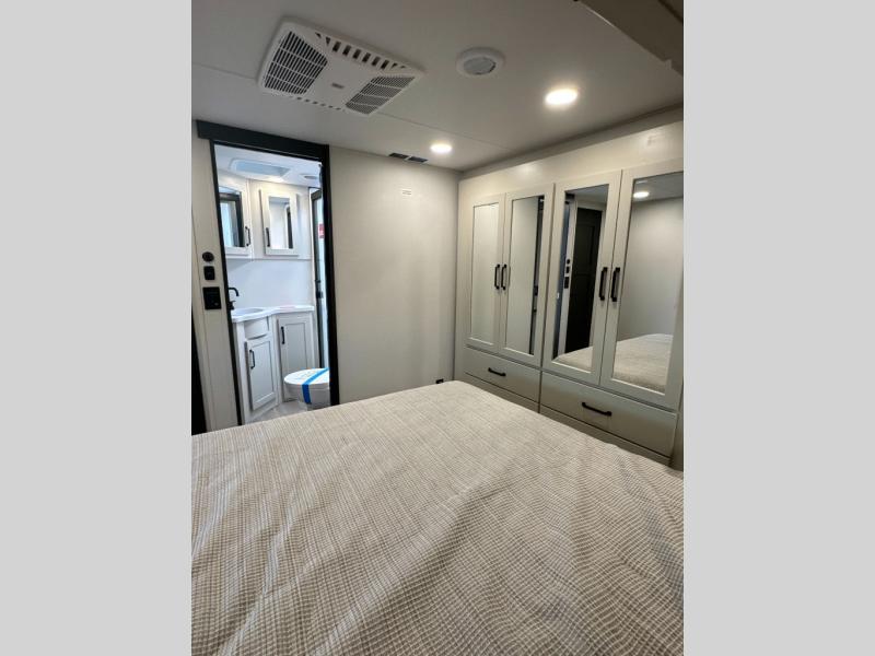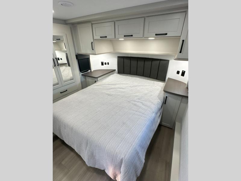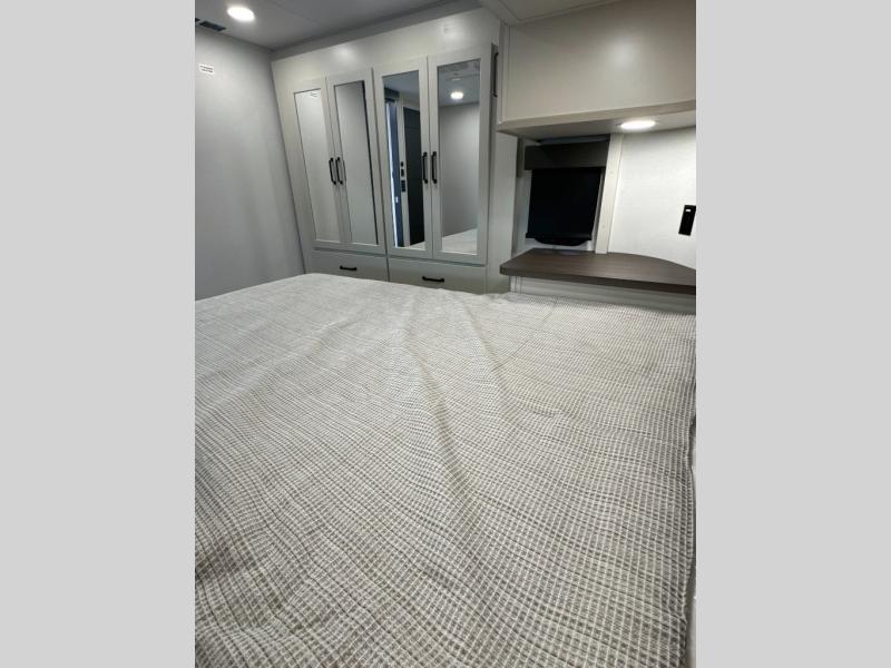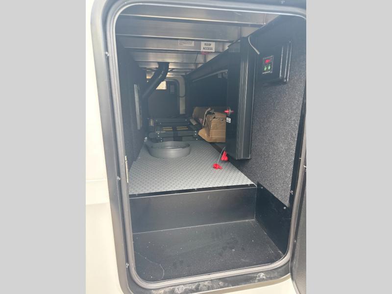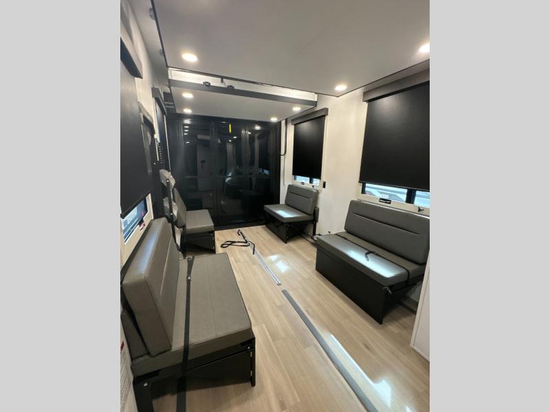This toy hauler with a 17' separate garage will be perfect for your outdoor adventures. There is an adjustable tie-down system to keep your gear secure, an overhead loft bed, two Liftsuite Systems plus an optional half bath. There is also washer and dryer prep here, along with a flip-up pet dish for your furry friends. The chef will love the large kitchen countertop for more meal prep space, and there is a 20-cu. ft. refrigerator and pantry for food storage. You can get comfy on the L-shaped sofa across from the 50" TV, or get some work done at the hybrid desk/dinette. There are also dual opposing slides here for added space. The third slide out is found in the front master bedroom, which includes drawers and storage space for your things. A queen bed will provide a great night's rest, and you have the option to choose a king bed if you want more space to stretch out!