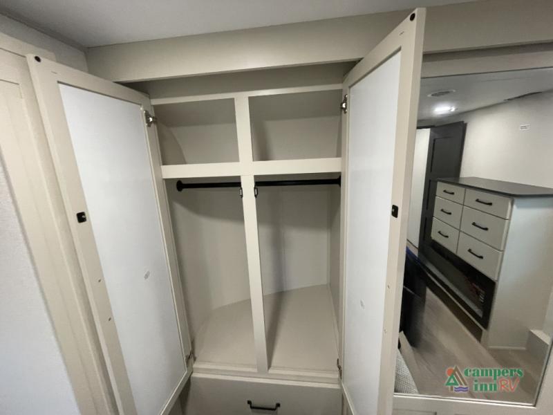 At the front of the RV, the private master suite offers a comfortable bed, wardrobe storage, and washer and dryer prep for longer adventures. A spacious bathroom with a large shower adds to the residential feel of this luxury toy hauler.