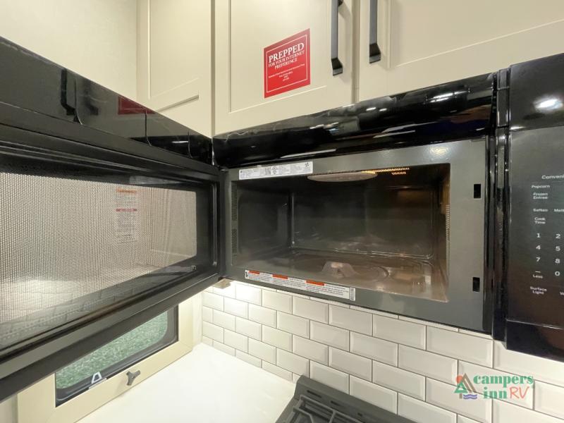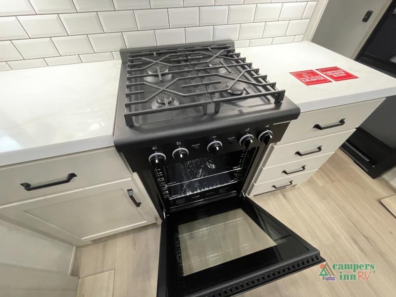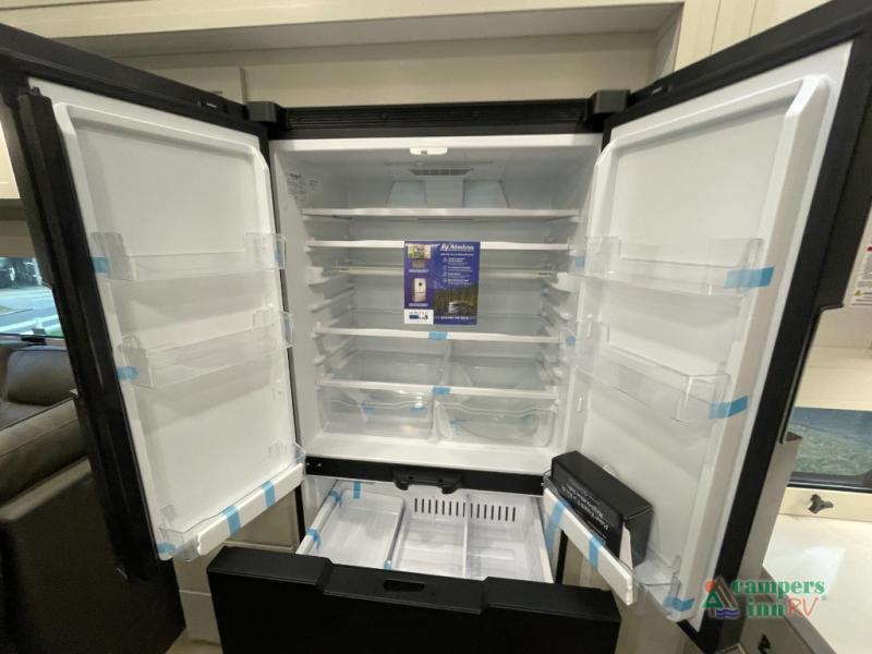 The fully equipped residential kitchen makes cooking on the road easy with solid-surface countertops, modern appliances, generous cabinet storage, and a large refrigerator. Whether you're making quick meals or hosting dinner at the campsite, this kitchen provides the space and functionality you need.