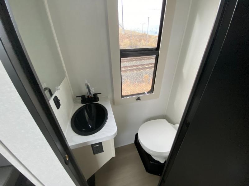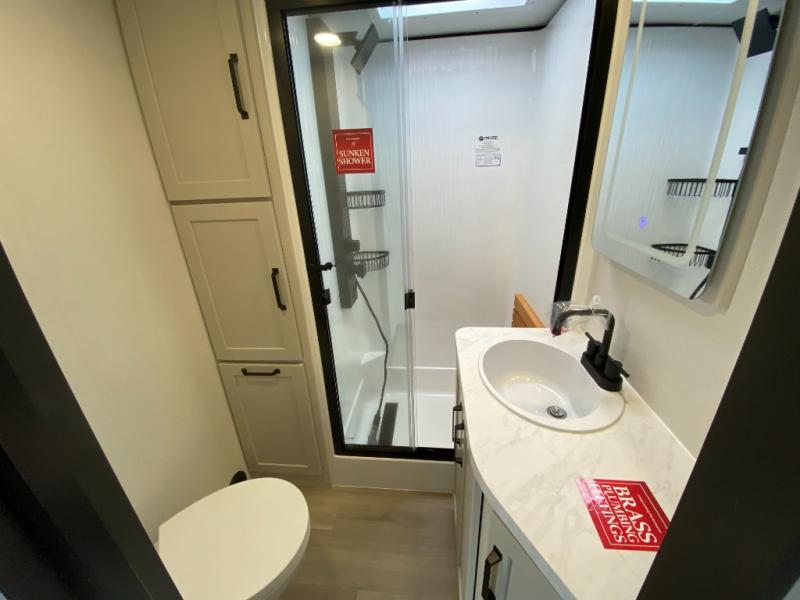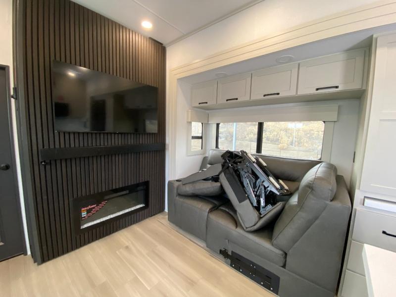 You want a toy hauler to carry your toys to the trails, and include many at-home comforts, and that's just what this unit delivers. A 14' separate garage includes an adjustable tie-down system, flip-up pet dish, a half bath, plus washer and dryer prep. There is an overhead loft bed and an L-shaped sofa with recline in the main living area that offers sleeping space as well. Everyone can watch a movie on the LED TV with a fireplace below while sitting on the sofa, in the theatre seats, or while at the hybrid desk/dinette. You will love the shower with seat in the full bathroom with two space savings sliding doors that lead into the hallway, and into the front bedroom where you will have a queen bed slide out, a wardrobe with washer and dryer prep, and TV prep if you want the option to watch movies in bed!