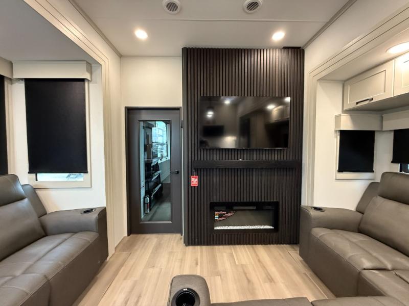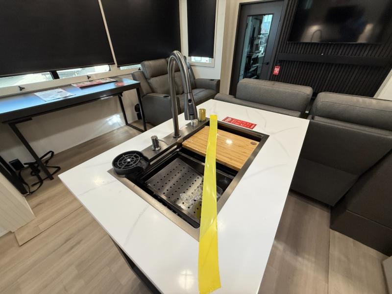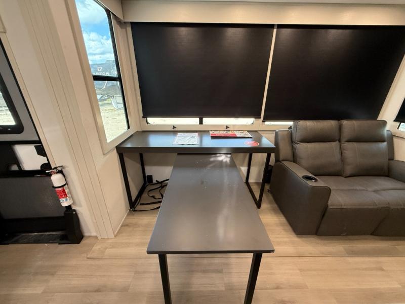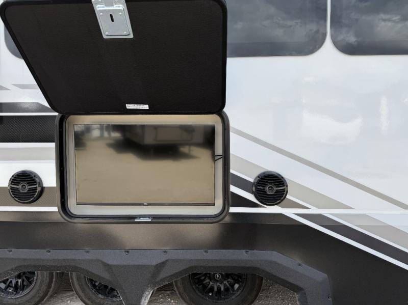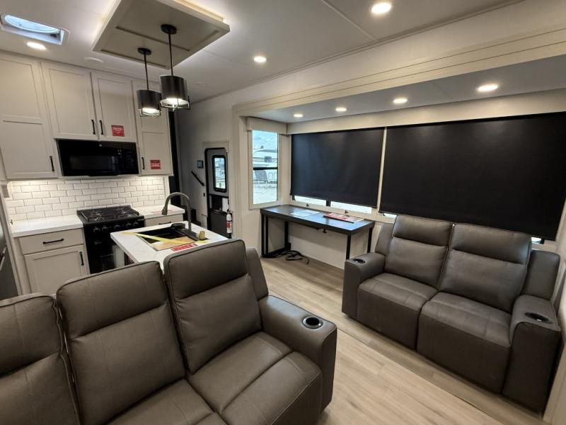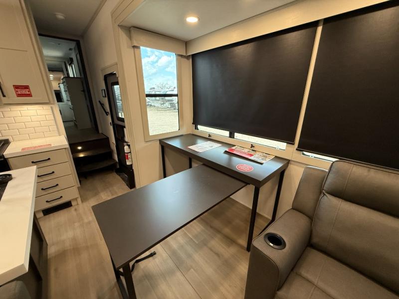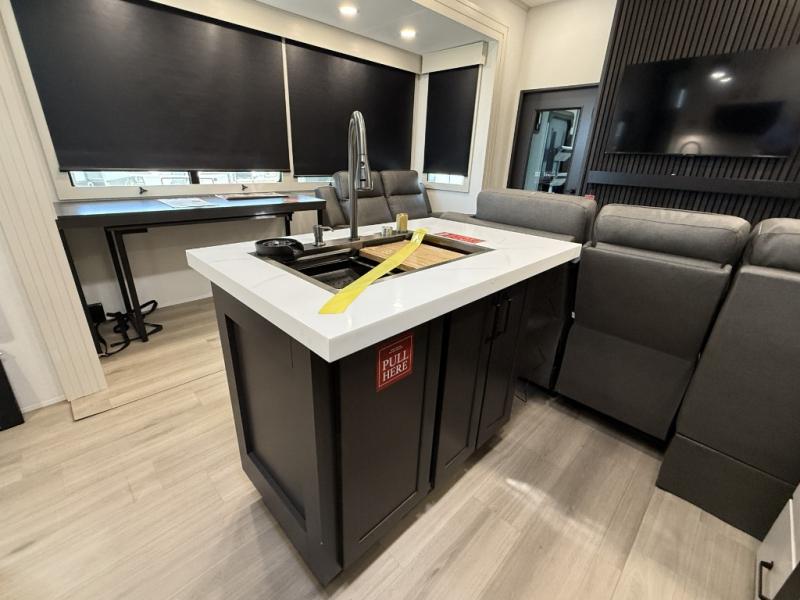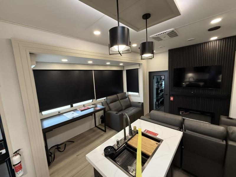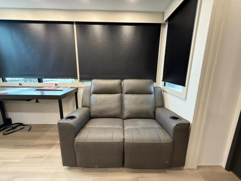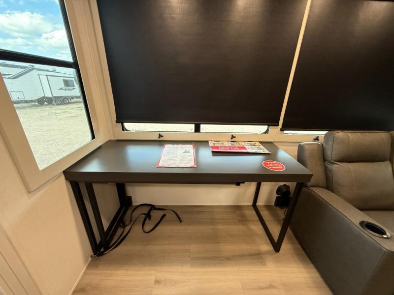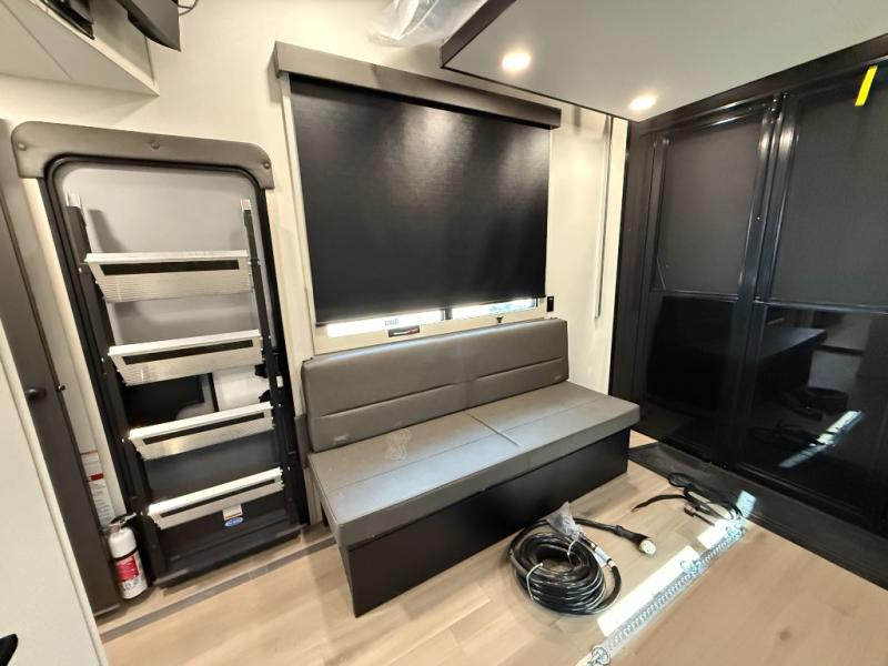 You want a toy hauler to carry your toys to the trails, and include many at-home comforts, and that's just what this unit delivers. A 10' 10" separate garage includes an adjustable tie-down system, with a full bath having access to your needs conveniently from the rear of the unit. There is a L-shaped sofa with recline in the main living area that offers sleeping space as well. Everyone can watch a movie on the 50" LED TV with a fireplace below while sitting on the sofa, in the theatre seating, or while at the hybrid desk/dinette. The front bedroom is where you will have a queen bed slide out, a wardrobe with washer and dryer prep, even TV prep if you want the option to watch your favorite shows in bed!