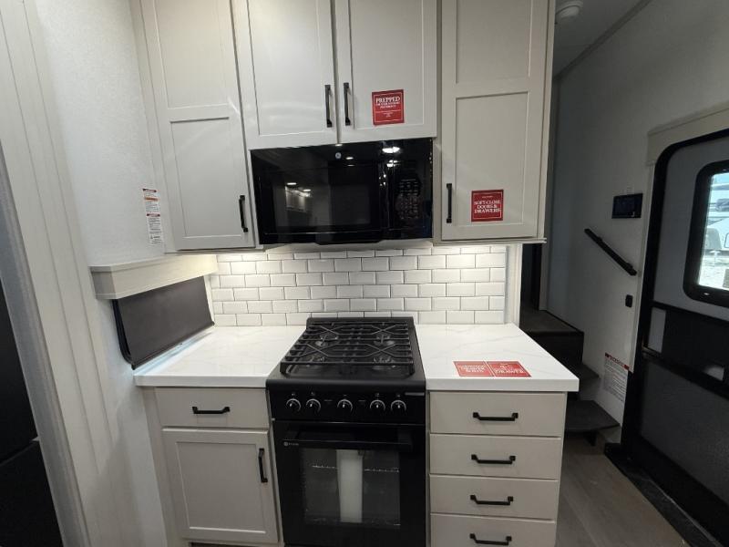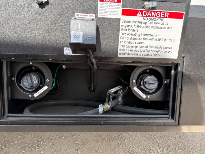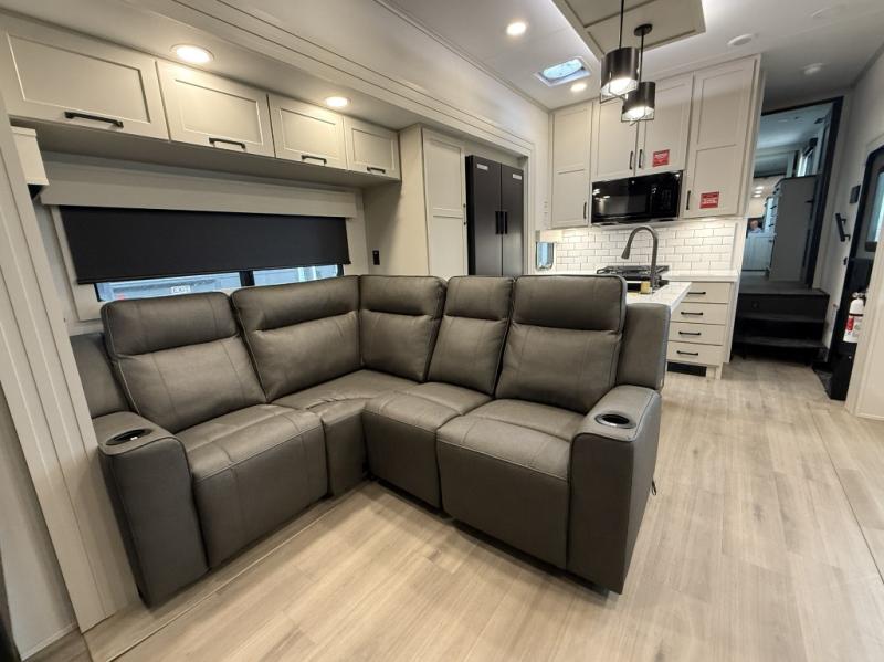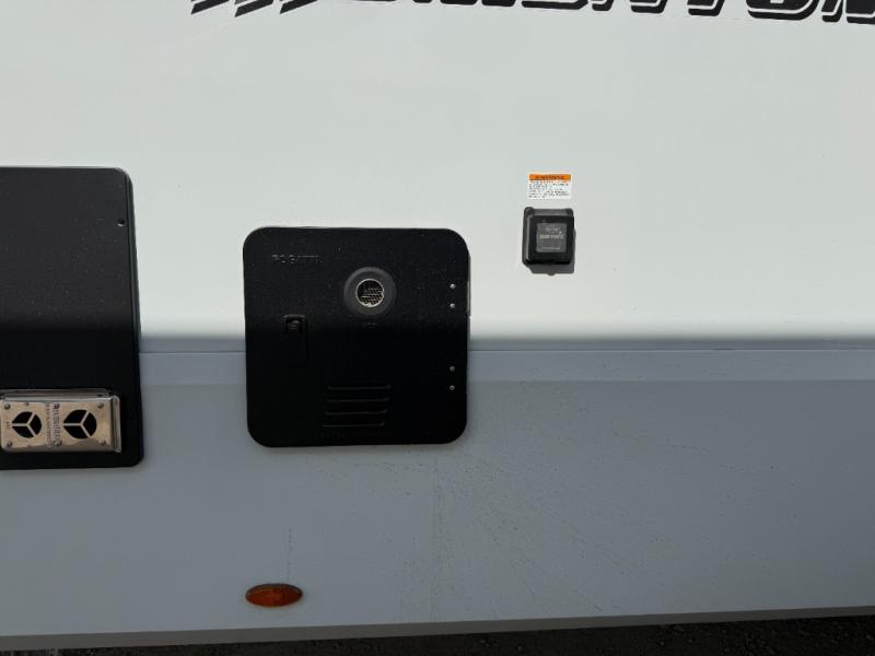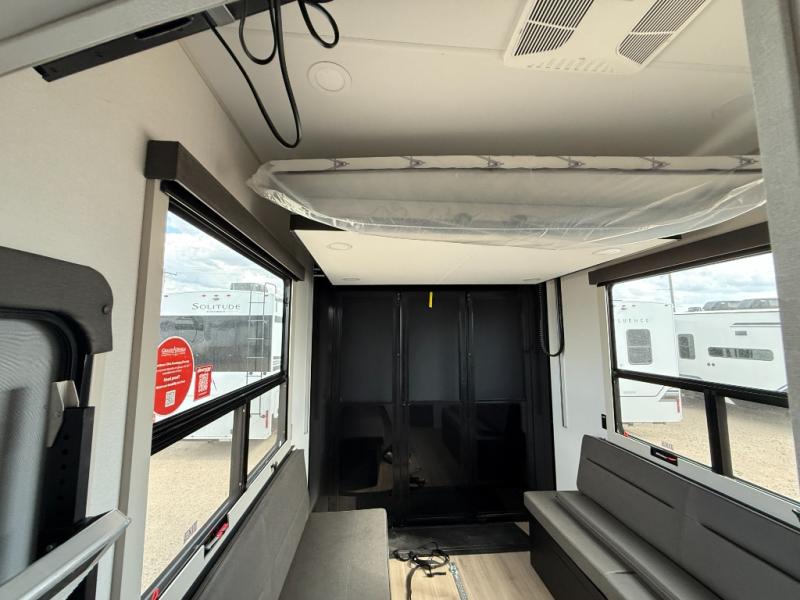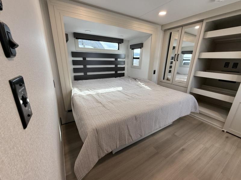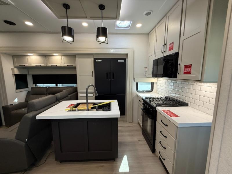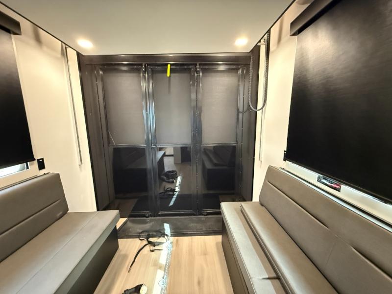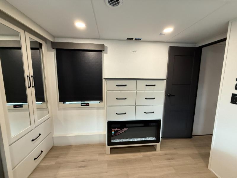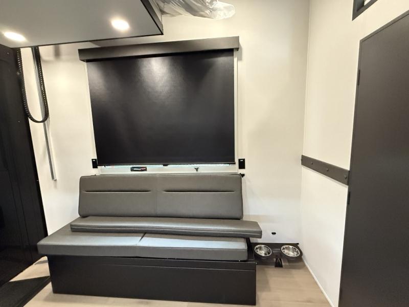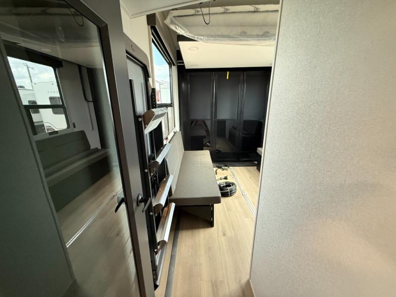 You want a toy hauler to carry your toys to the trails, and include many at-home comforts, and that's just what this unit delivers. A 10' 10" separate garage includes an adjustable tie-down system, with a full bath having access to your needs conveniently from the rear of the unit. There is a L-shaped sofa with recline in the main living area that offers sleeping space as well. Everyone can watch a movie on the 50" LED TV with a fireplace below while sitting on the sofa, in the theatre seating, or while at the hybrid desk/dinette. The front bedroom is where you will have a queen bed slide out, a wardrobe with washer and dryer prep, even TV prep if you want the option to watch your favorite shows in bed!