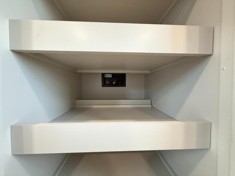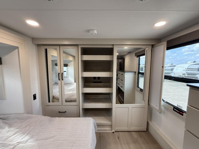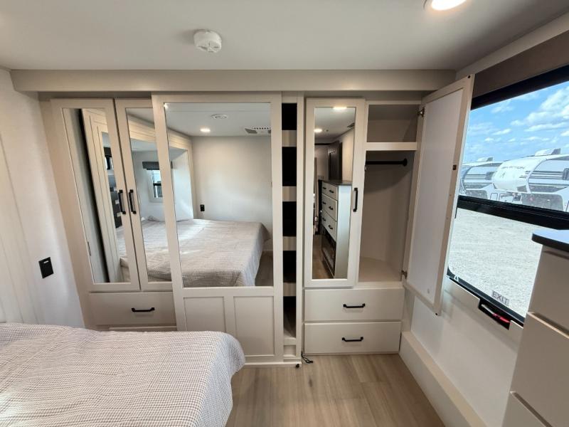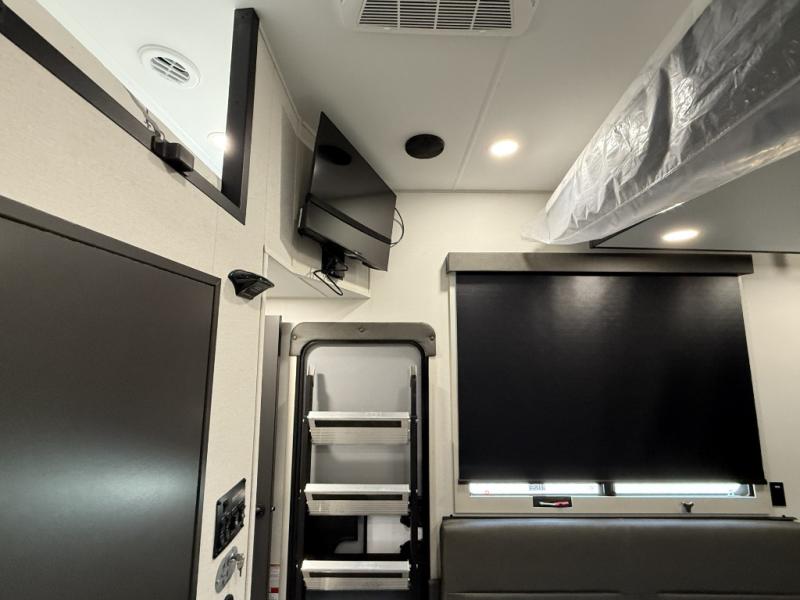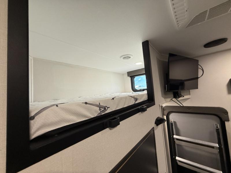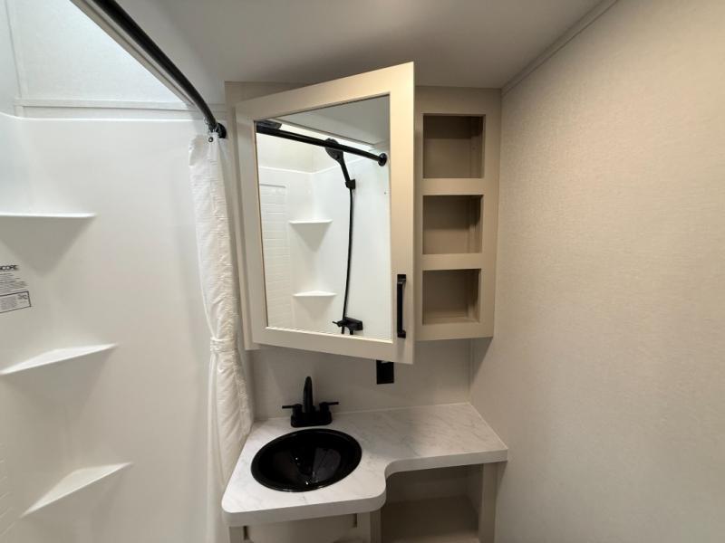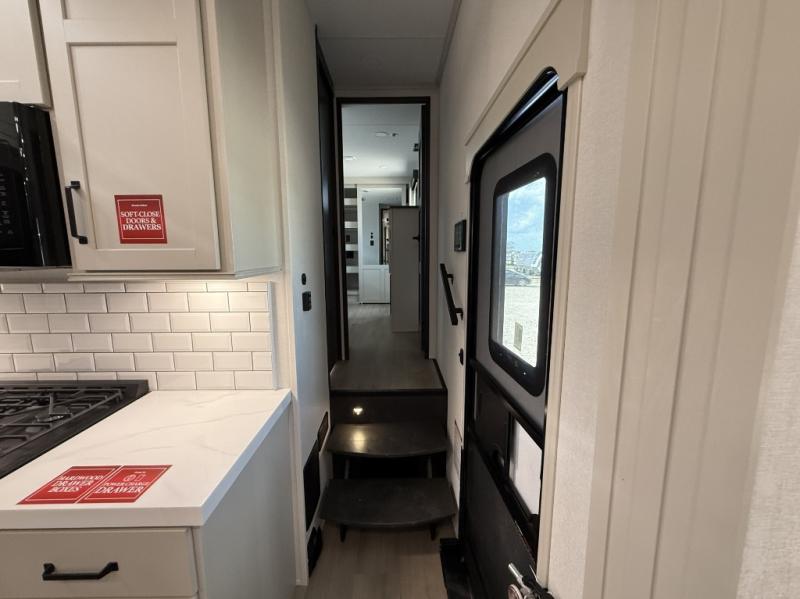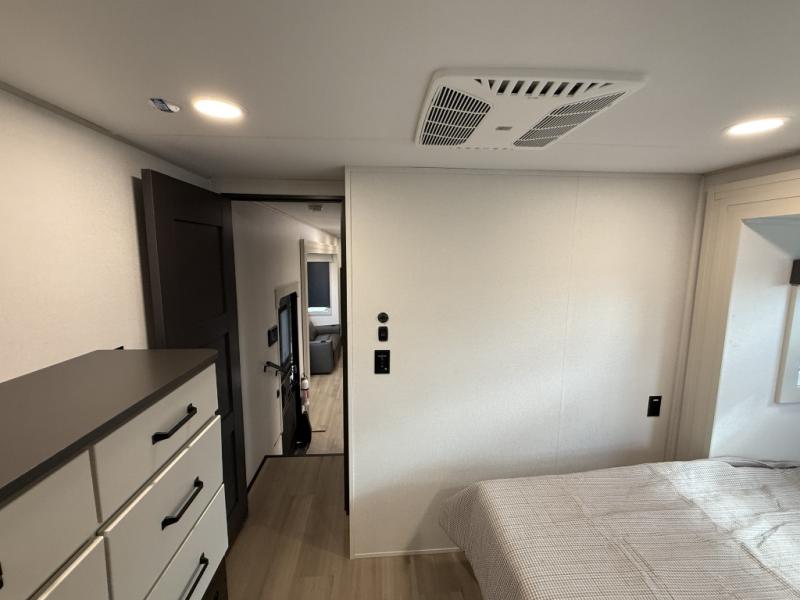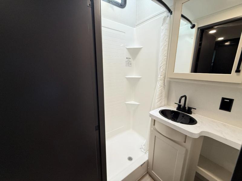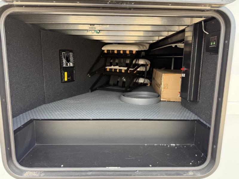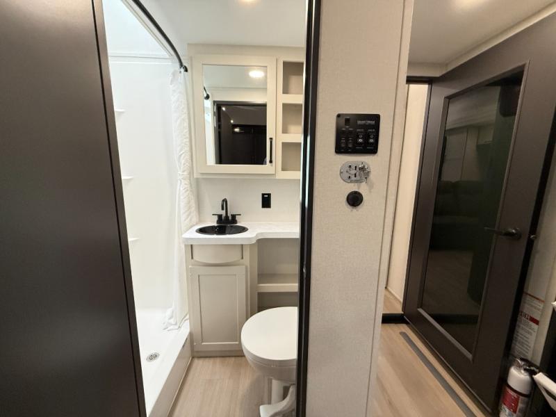 You want a toy hauler to carry your toys to the trails, and include many at-home comforts, and that's just what this unit delivers. A 10' 10" separate garage includes an adjustable tie-down system, with a full bath having access to your needs conveniently from the rear of the unit. There is a L-shaped sofa with recline in the main living area that offers sleeping space as well. Everyone can watch a movie on the 50" LED TV with a fireplace below while sitting on the sofa, in the theatre seating, or while at the hybrid desk/dinette. The front bedroom is where you will have a queen bed slide out, a wardrobe with washer and dryer prep, even TV prep if you want the option to watch your favorite shows in bed!