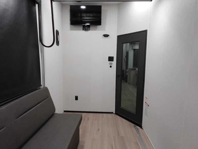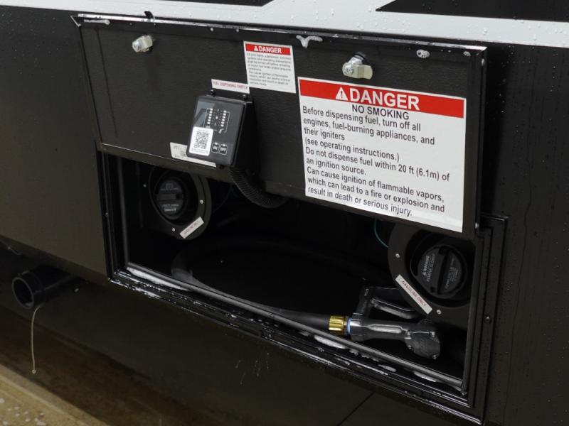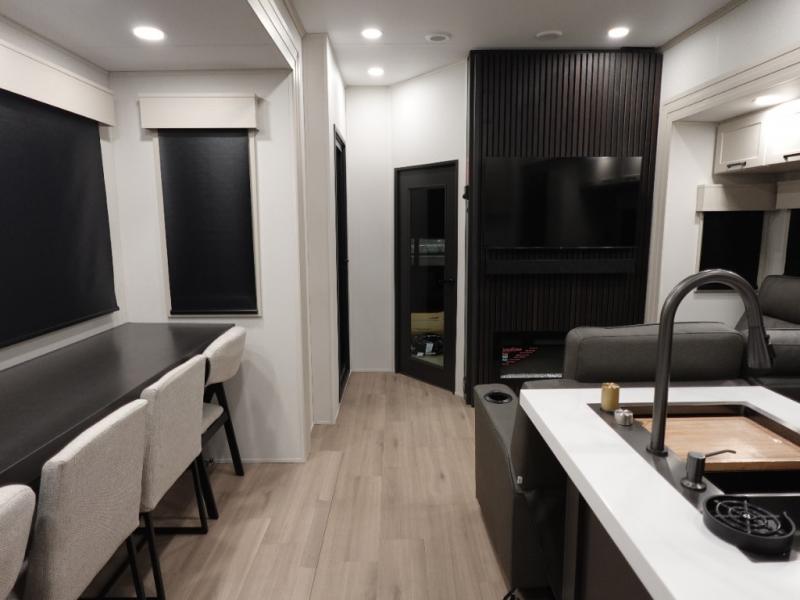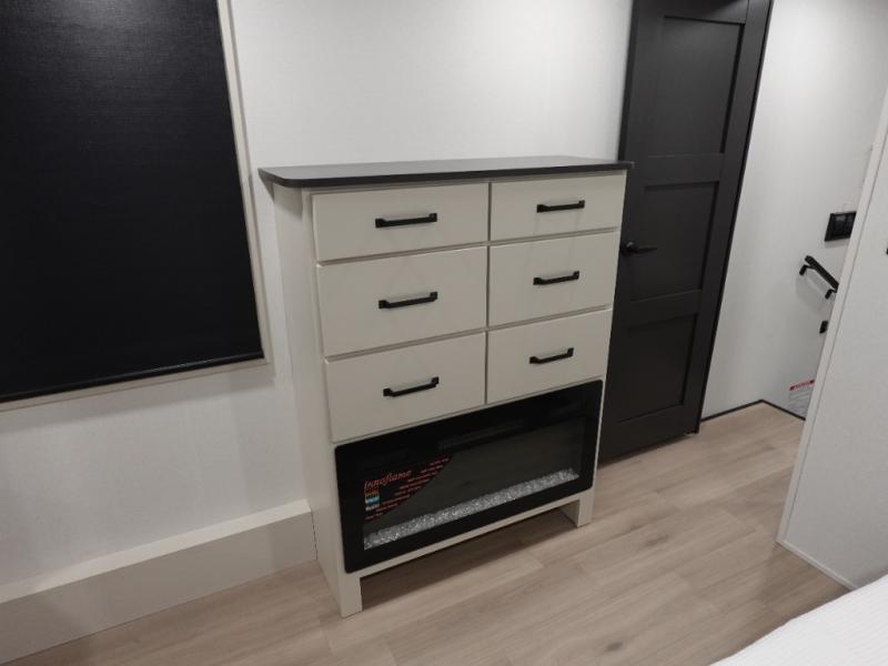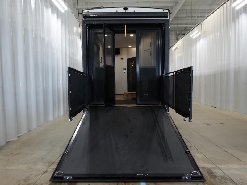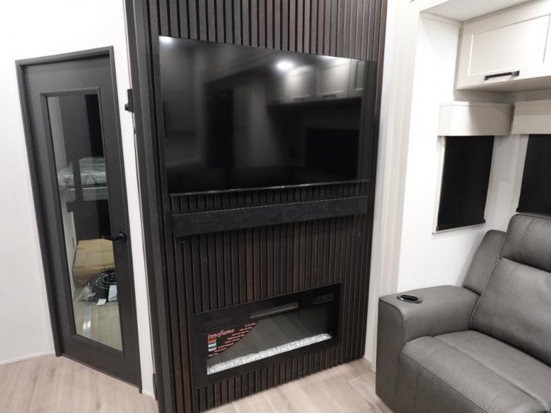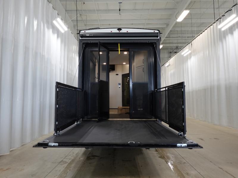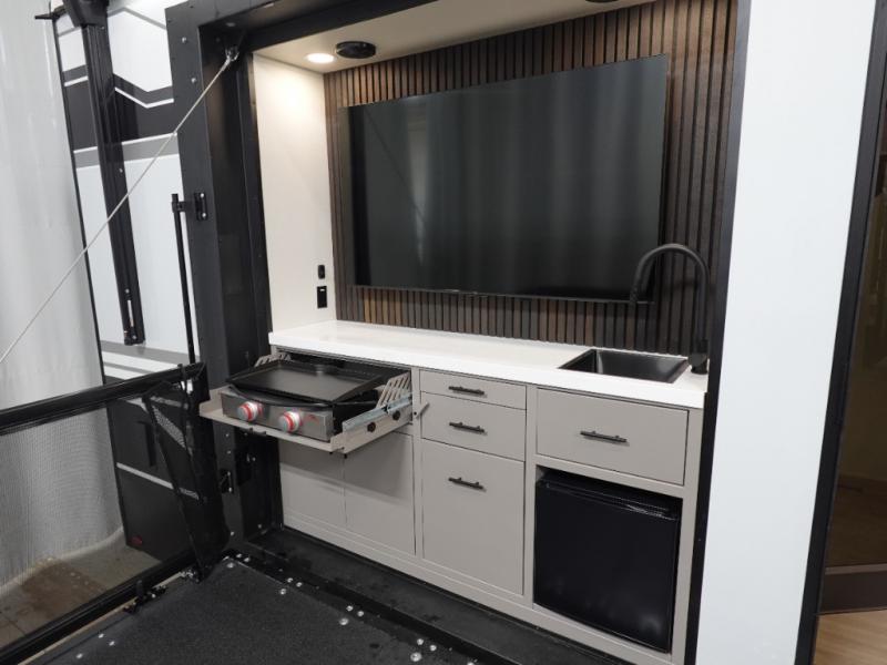 This toy hauler has all the comfort and convenience you could ask for! Once you have unloaded your toys from the 12' 6" separate garage, you can start lunch on the exterior griddle located by the side patio. There is also a 65" TV here and a 1.7 cu. ft. refrigerator to entertain guests! If the weather isn't cooperating, you can make meals in the fully equipped interior kitchen, complete with an island, pantry, pull-out countertop extension and more. An L-shaped sofa with recliners is in perfect view of the 50" TV and fireplace, and there is even a hybrid desk/dinette with windows where you can get some work done if needed. Head towards the front to freshen up in the full bath before heading to bed in the private bedroom. Here, you'll find a king bed slide out, a large closet with washer and dryer prep, plus a dresser with TV prep if you want the option to watch movies in bed!